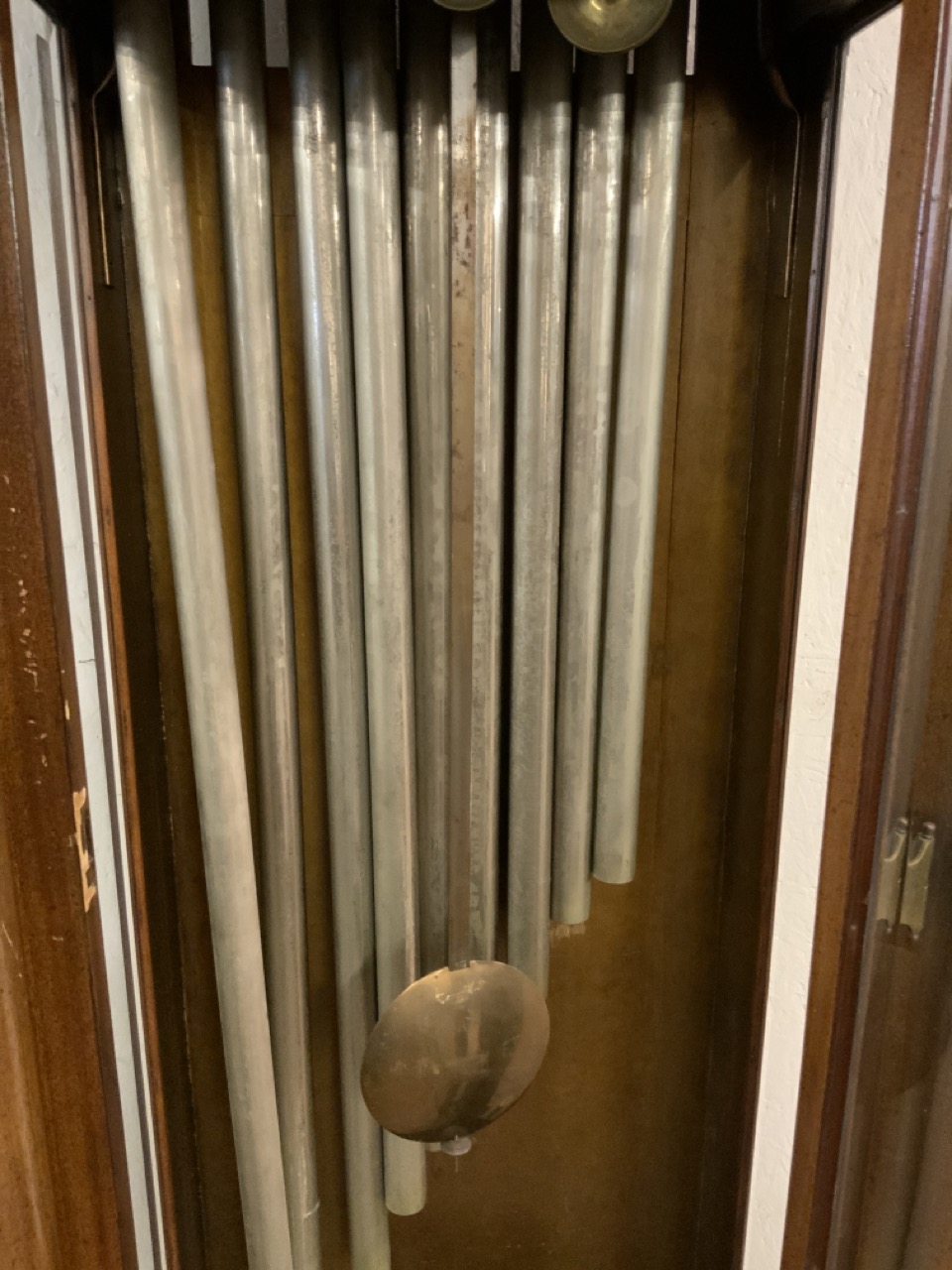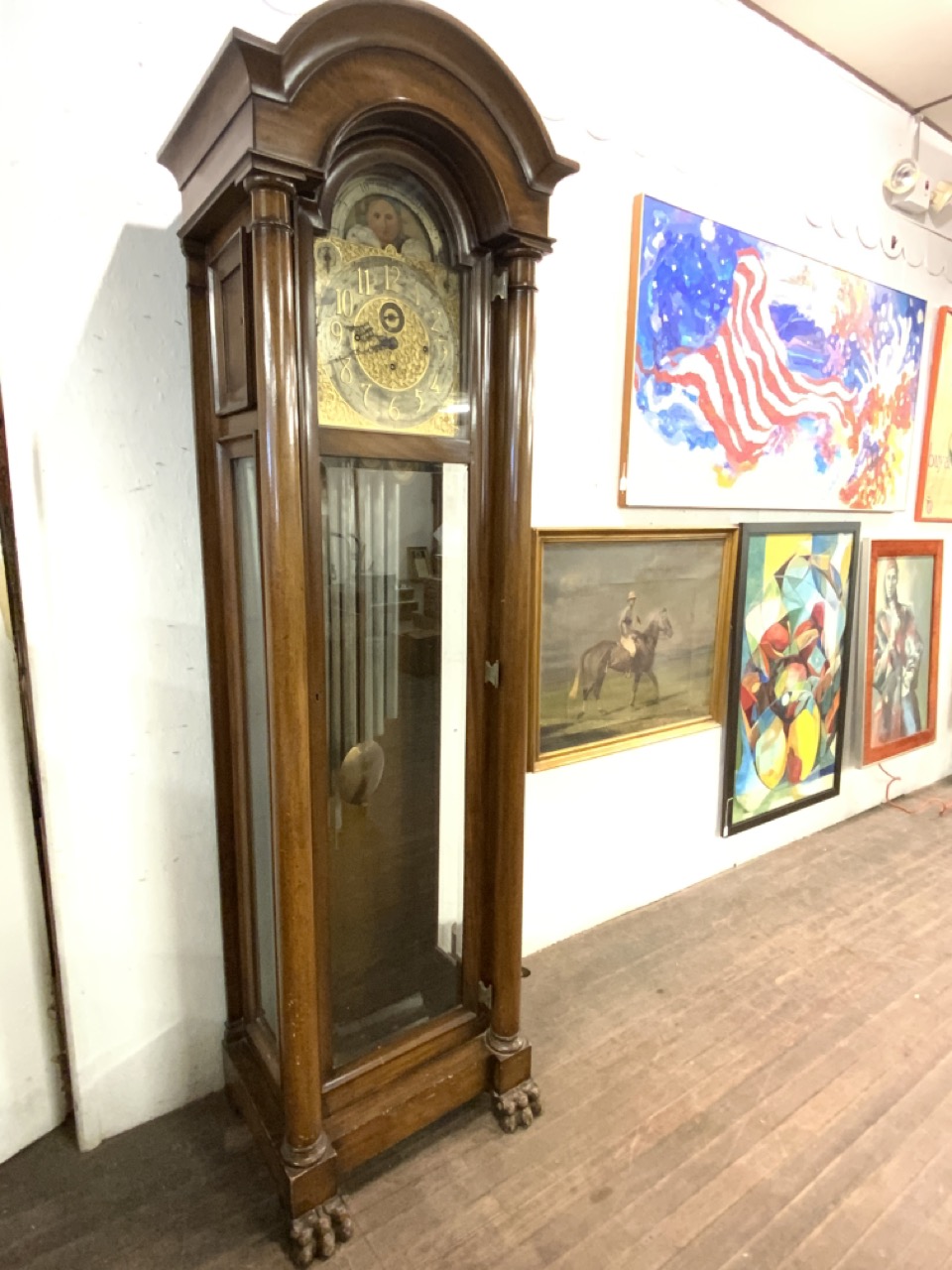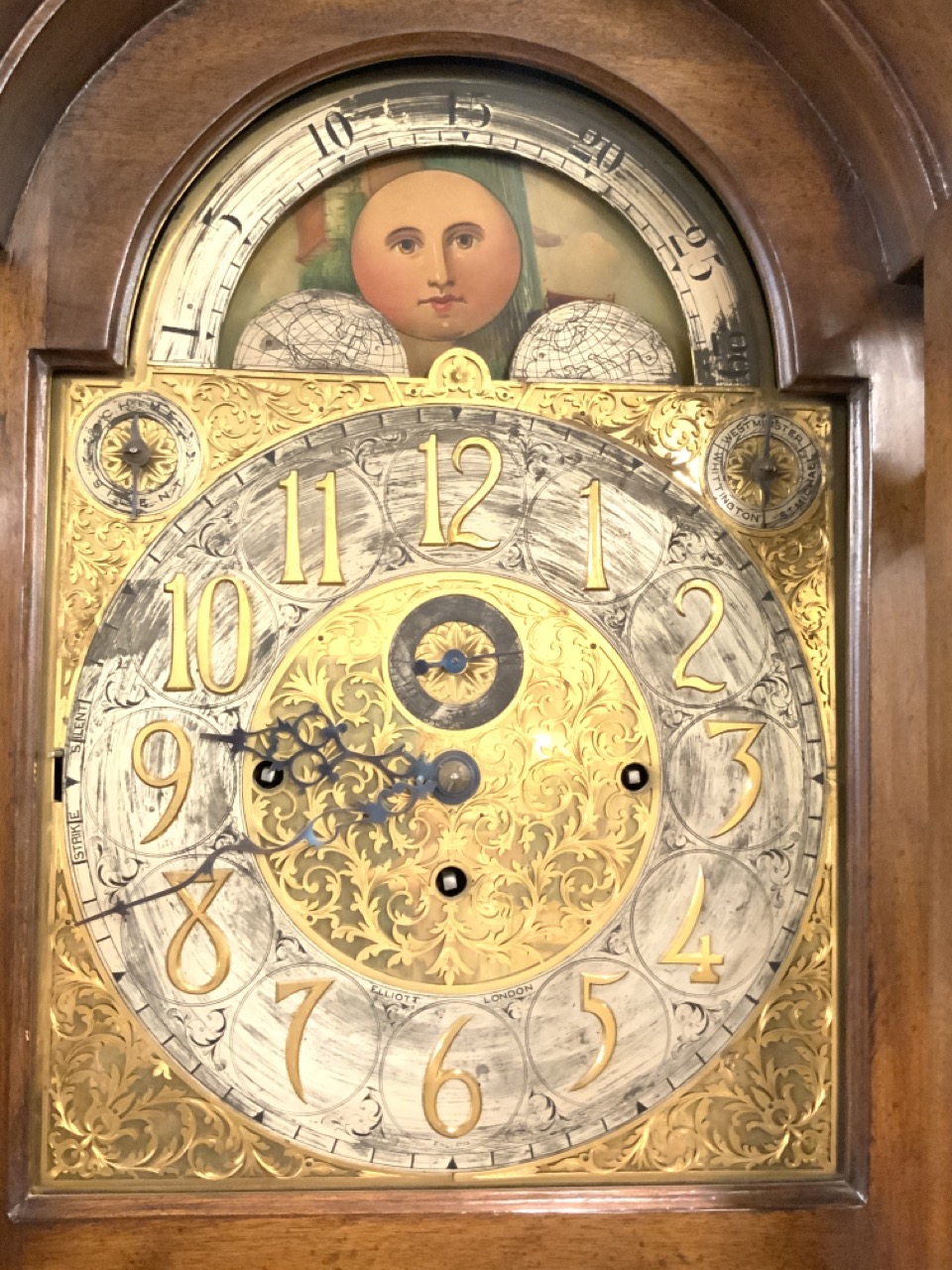 English grandfather clock with nine chimes by ELLIOTT London. All workings present. Weights and key present. Door key missing. The clock bottom needs repair as weights fell into it.