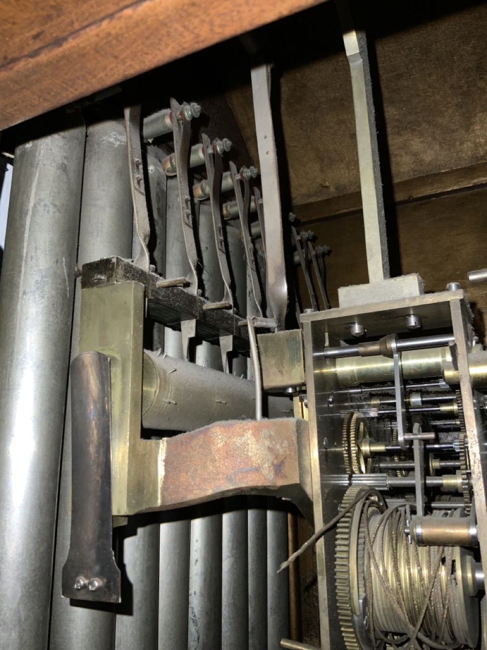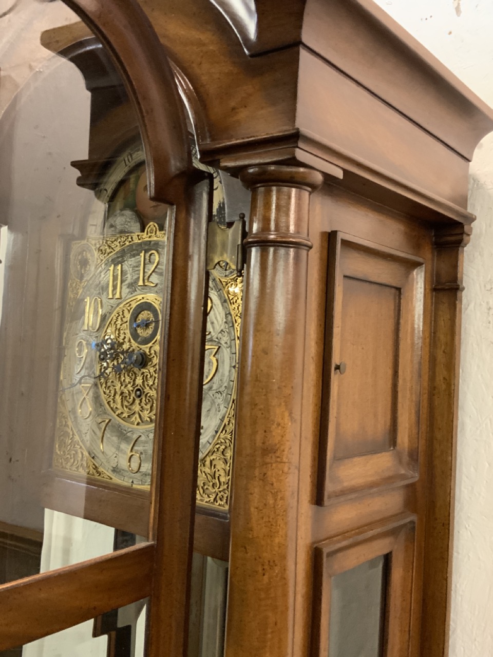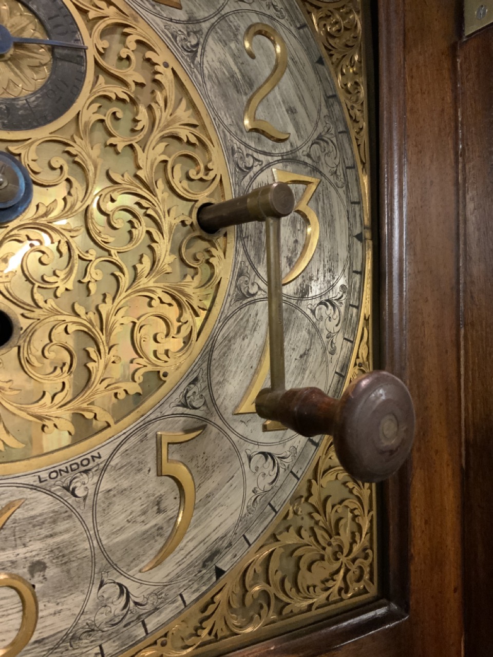 English grandfather clock with nine chimes by ELLIOTT London. All workings present. Weights and key present. Door key missing. The clock bottom needs repair as weights fell into it.