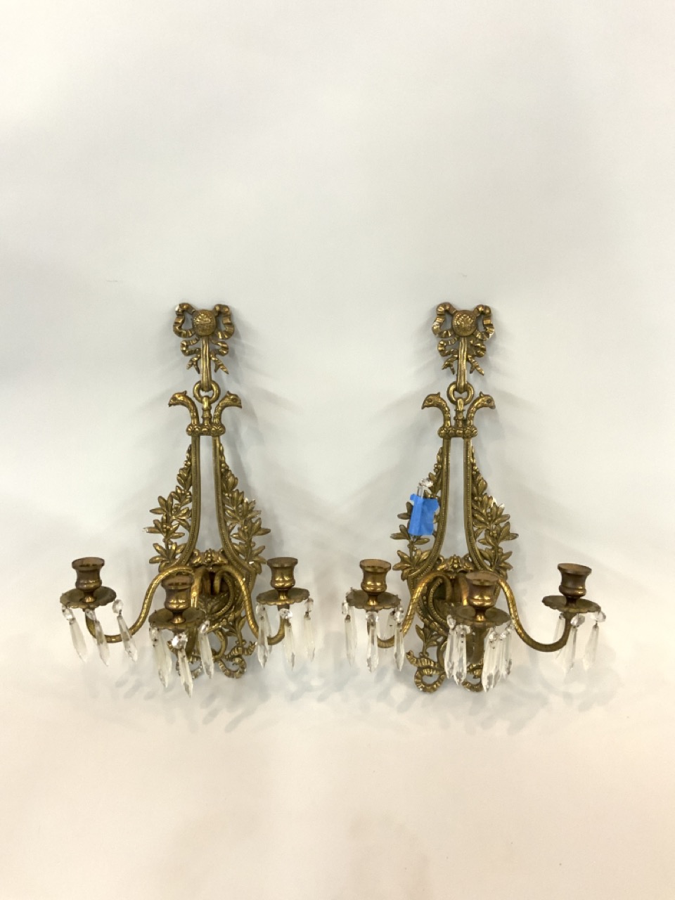 Pair of 3 arm wall sconces with crystal drops