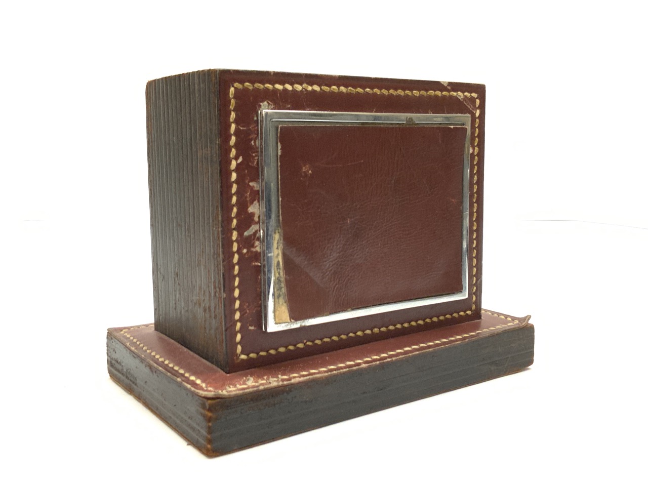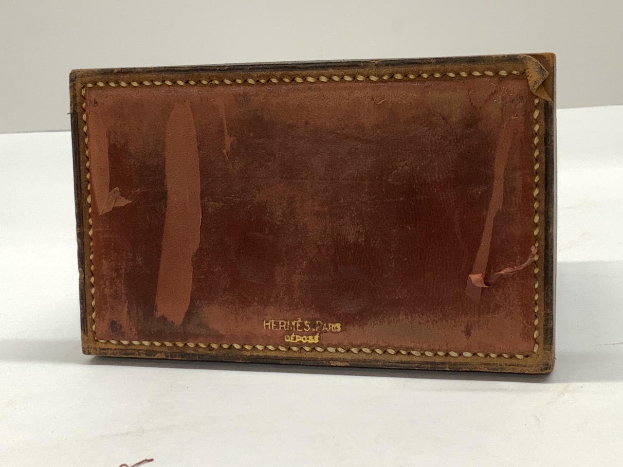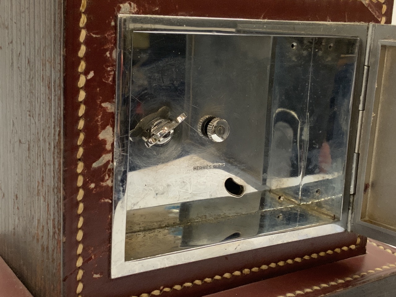 Signed at the base Hermes Paris France and Hermes, France inside the back door. The clock is in running condition. The clock has not been taken apart to view interior workings. The clock winds and is not overwound. It is running. There is cosmetic small dents to chrome, scratches to leather and other cosmetic damage as seen in photograph preview. Estate found in Chelsea, New York.
