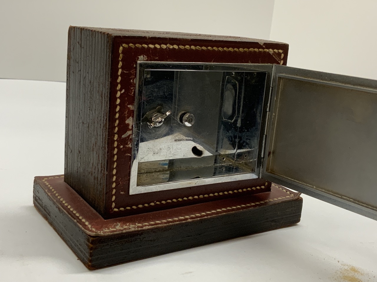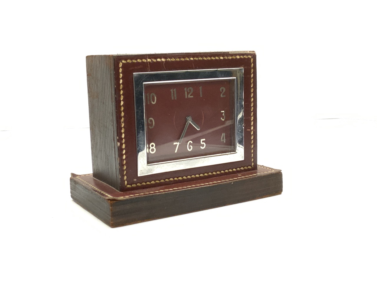An Art Deco period Hermes French desk clock. A square clock with chrome, wood and covered with oxblood red stitched leather.