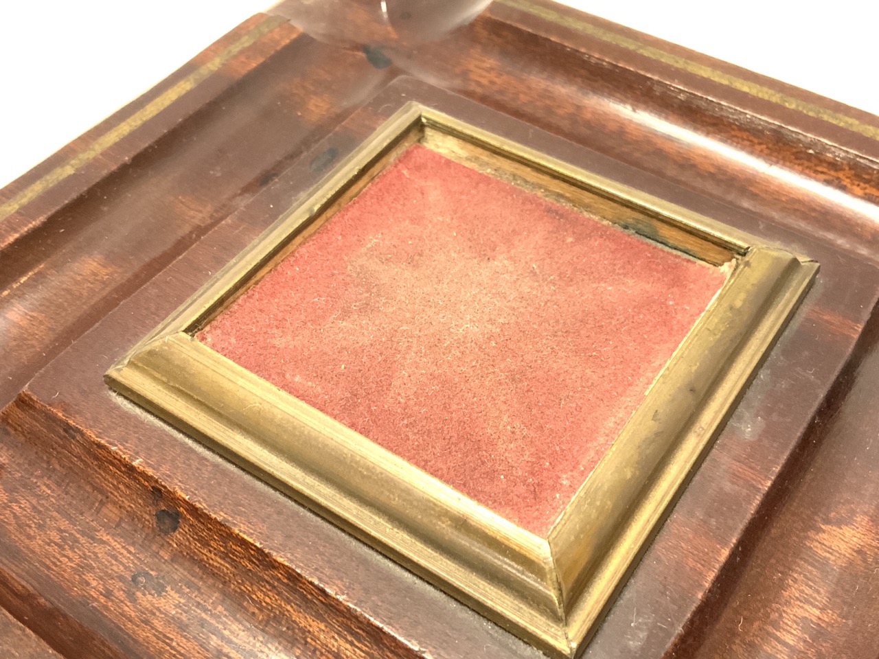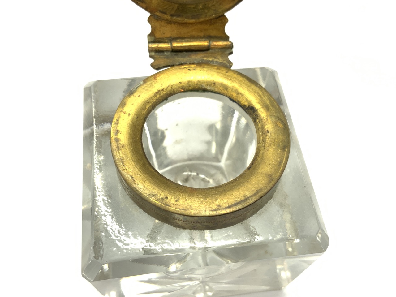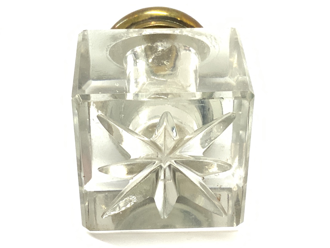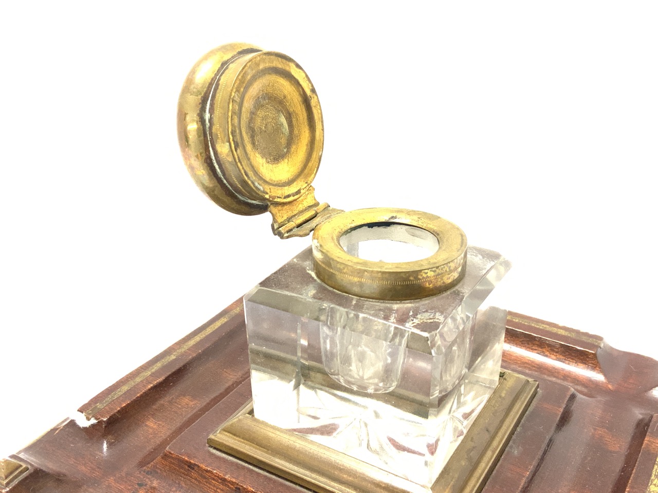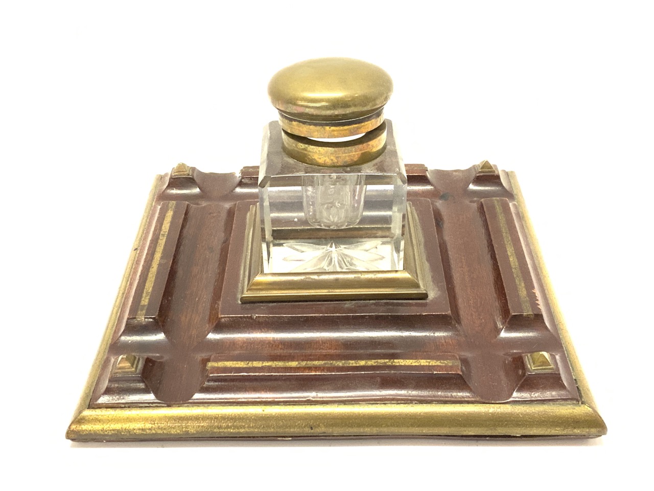 Ink well with square base with pen rest.