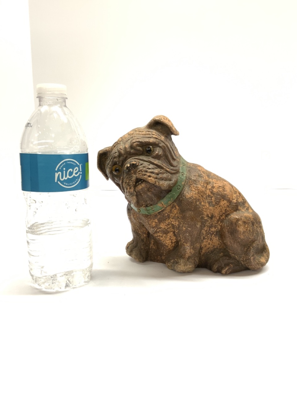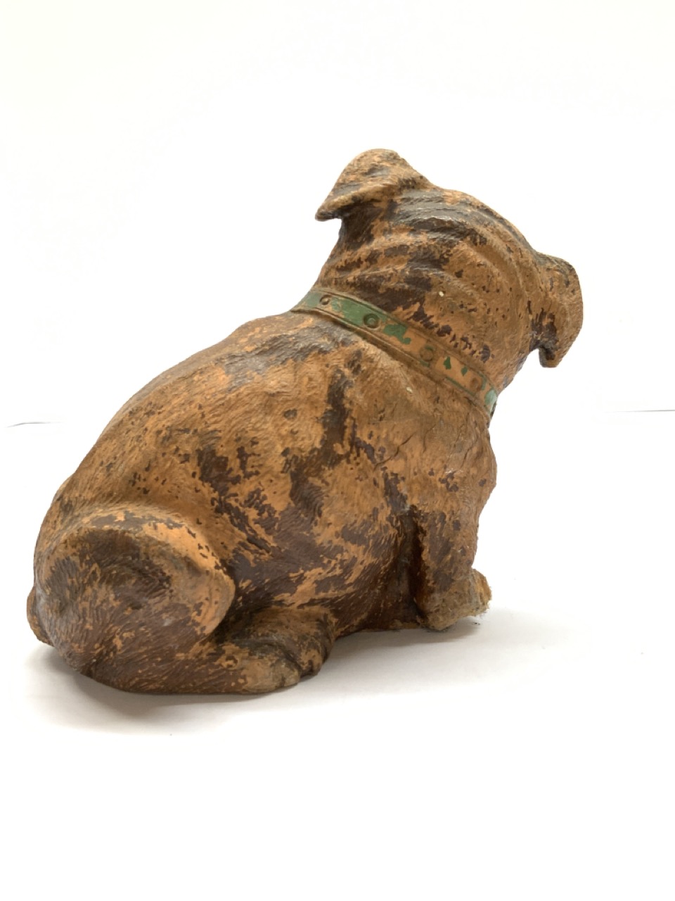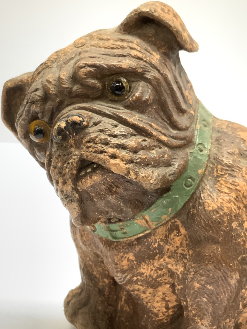 An antique composition bull dog statue with glass eyes. . Dimensions: 7 1/2” X 7” X 4”