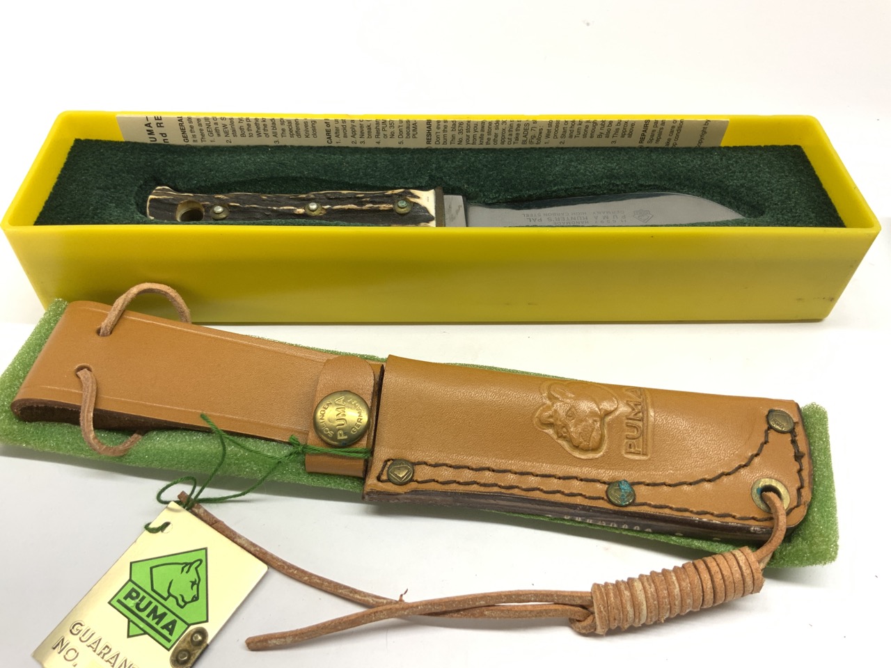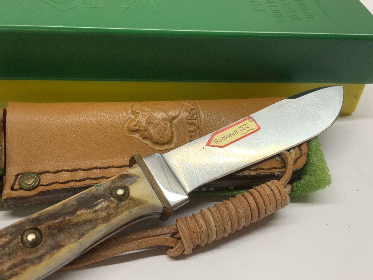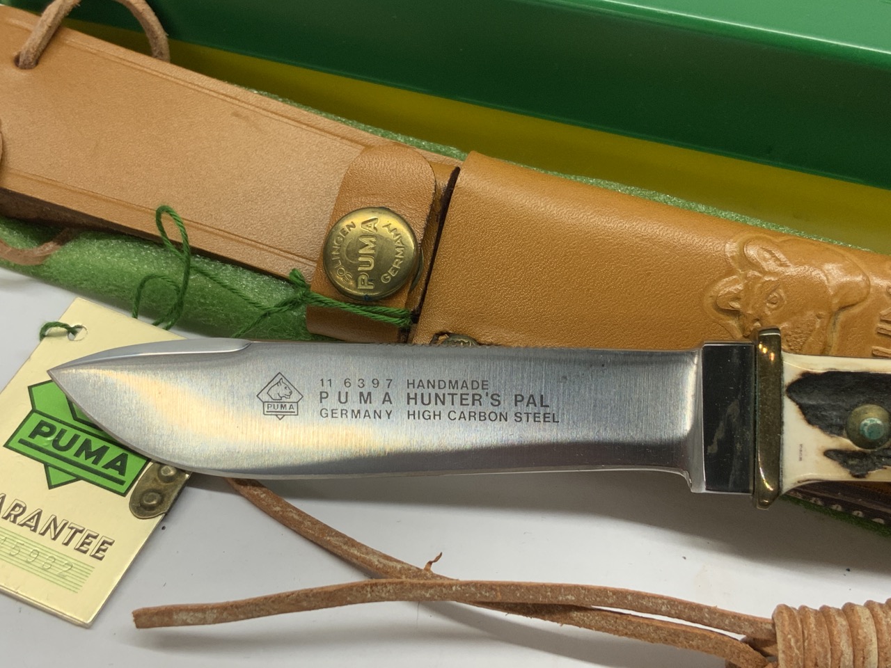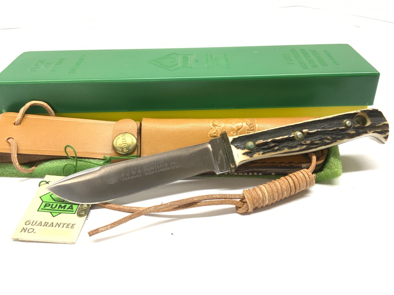 Puma “Hunter’s Pal” knife with stag handle. Blade has Rockwell sticker still intact on blade. Original box and sheath. Very minor spot of greening seen to metal in handle. Dimensions: 8” length.