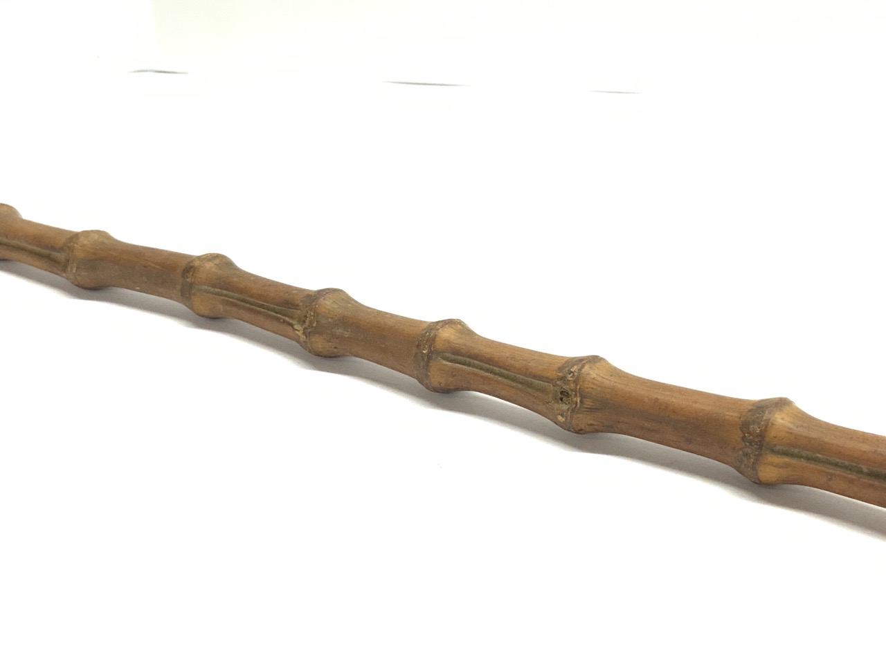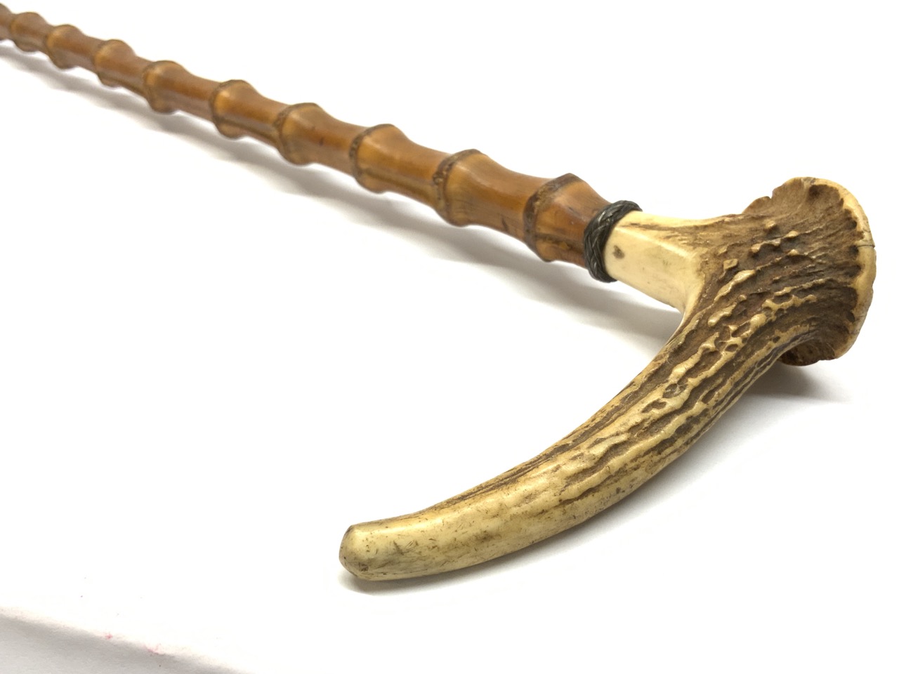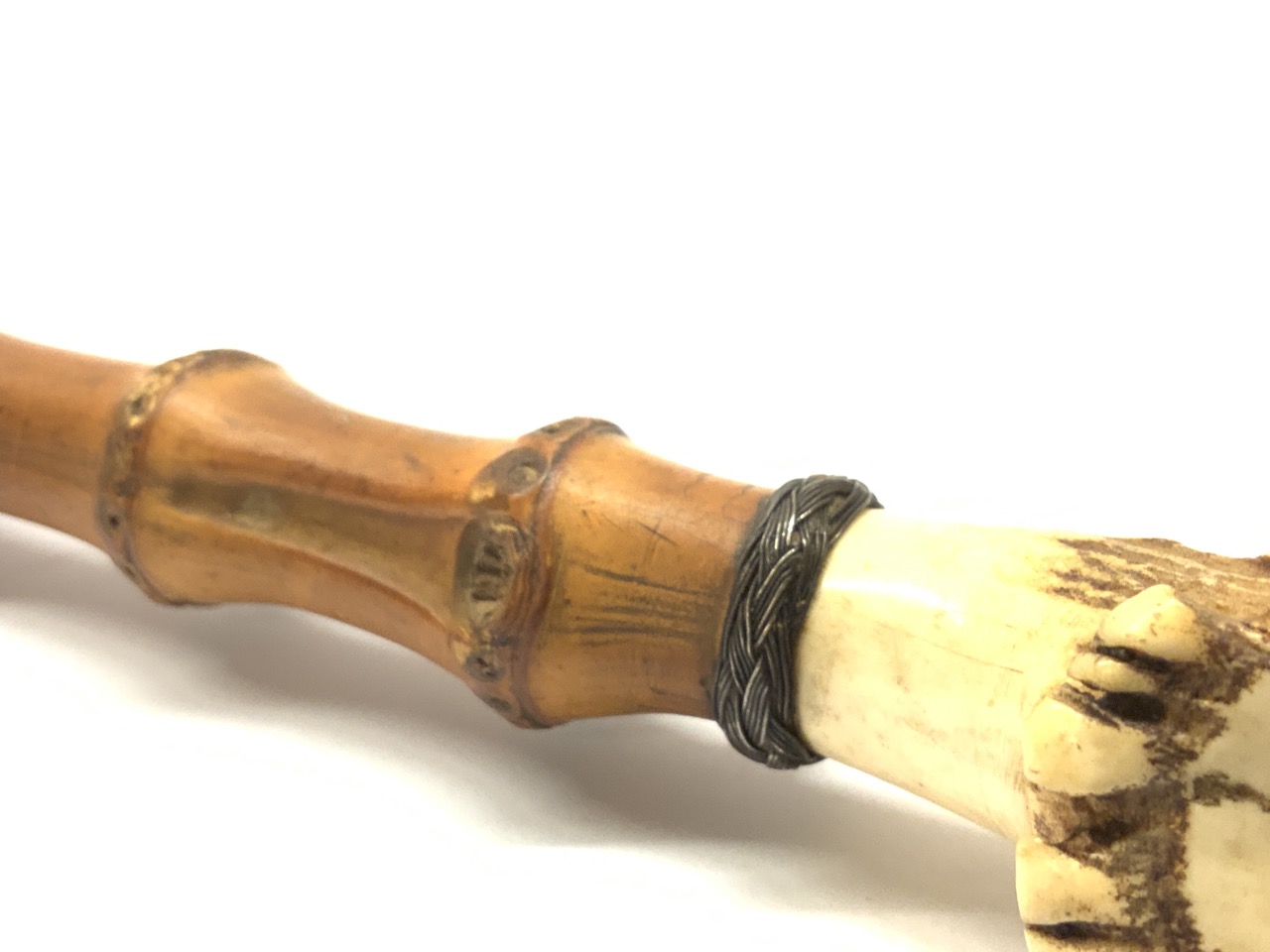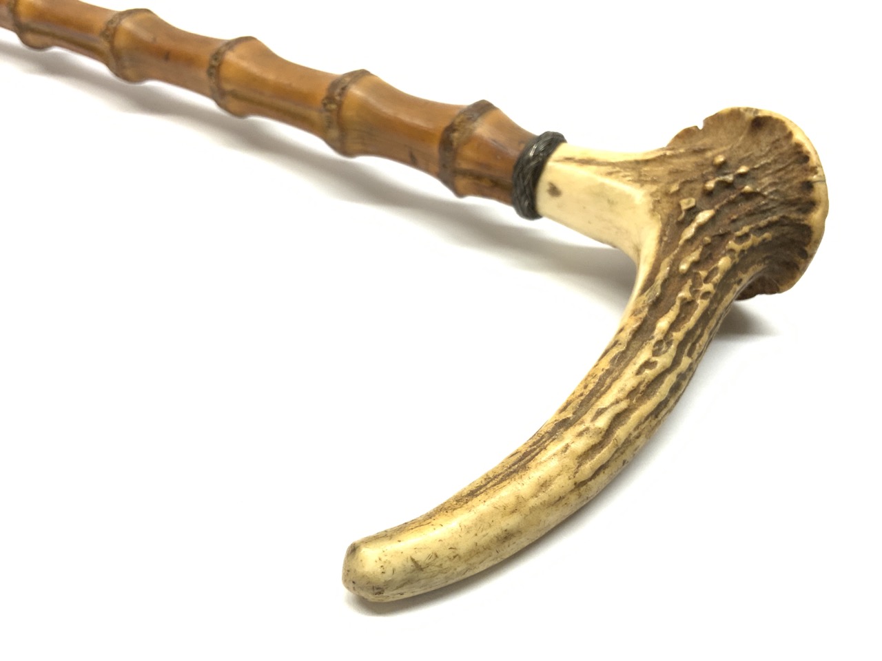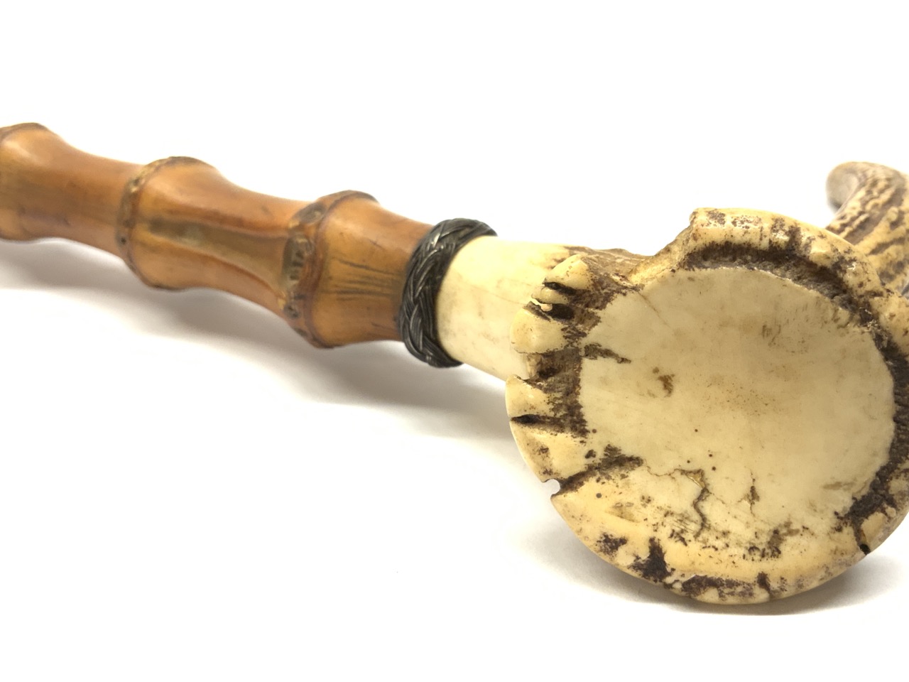 An antique bamboo and horn walking stick. A nicely done braided silver reinforcement sets between the stag horn and bamboo.