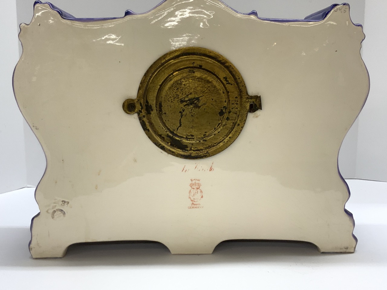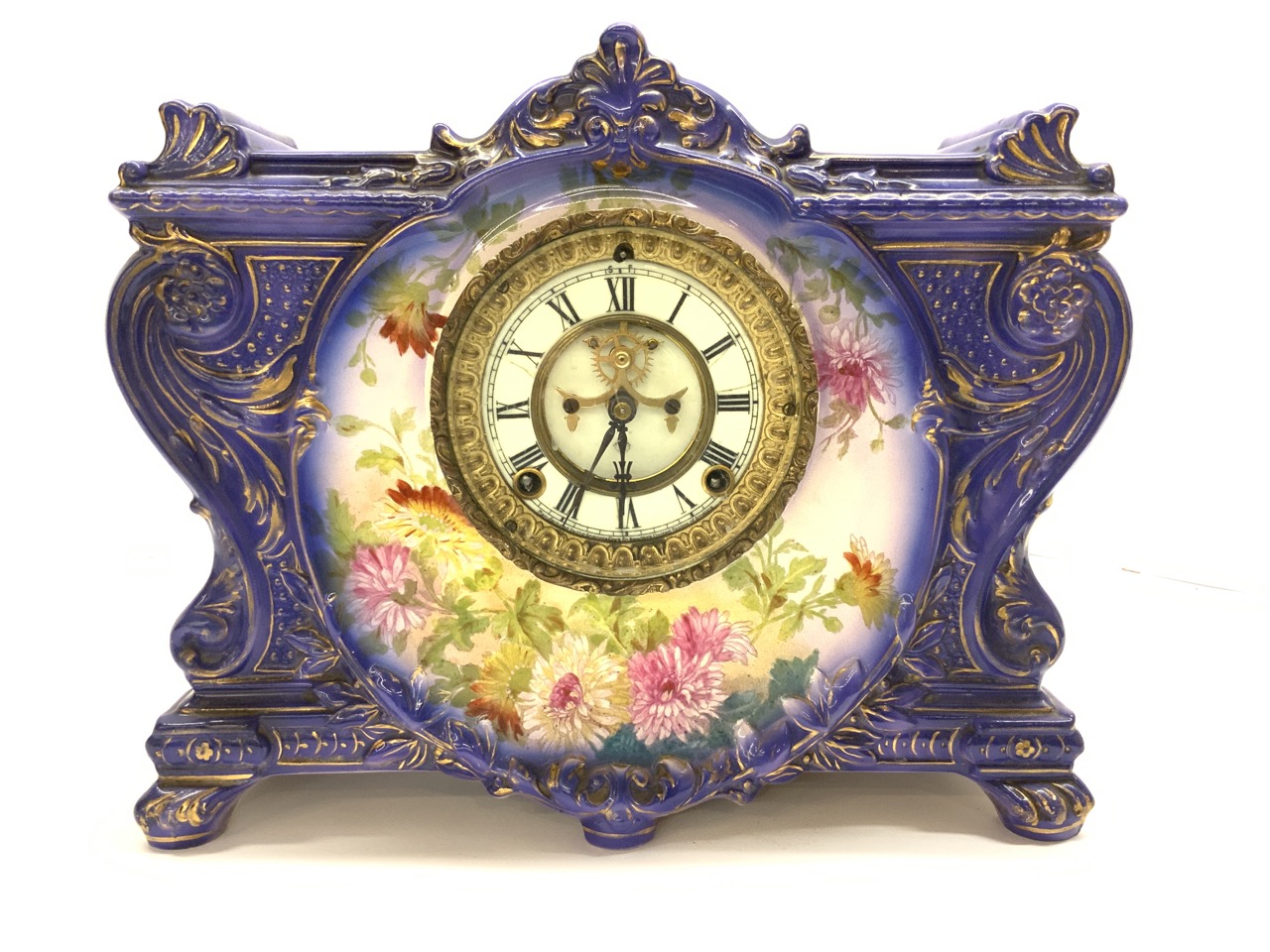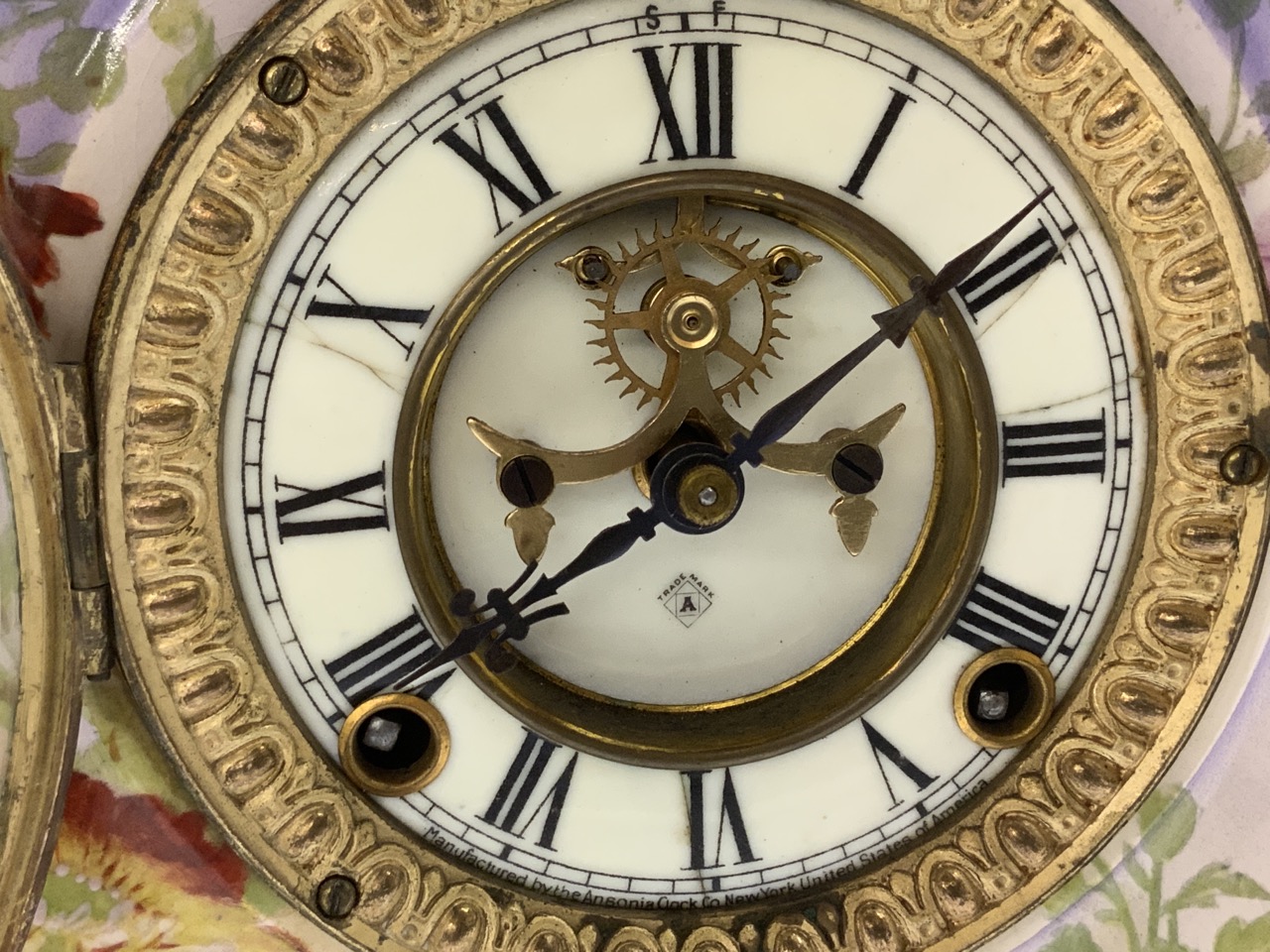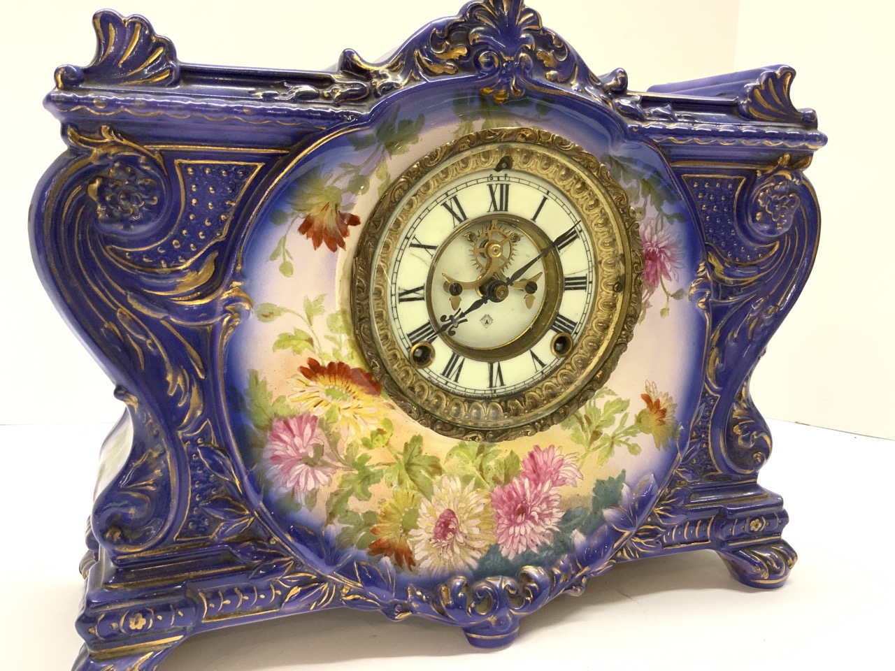 An Ansonia mantel clock with Royal Bonn German porcelain case. Signed reverse. Appearing to be all original works and pendulum.
