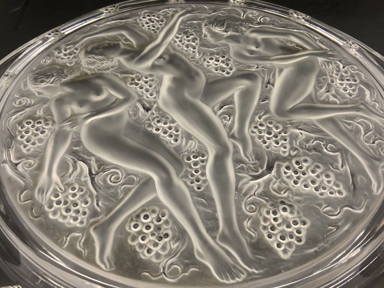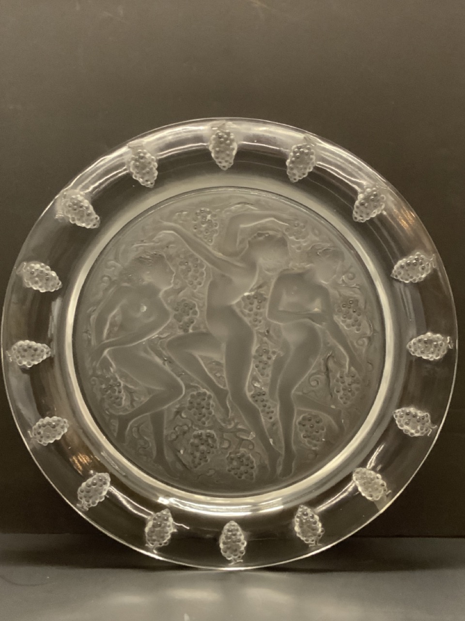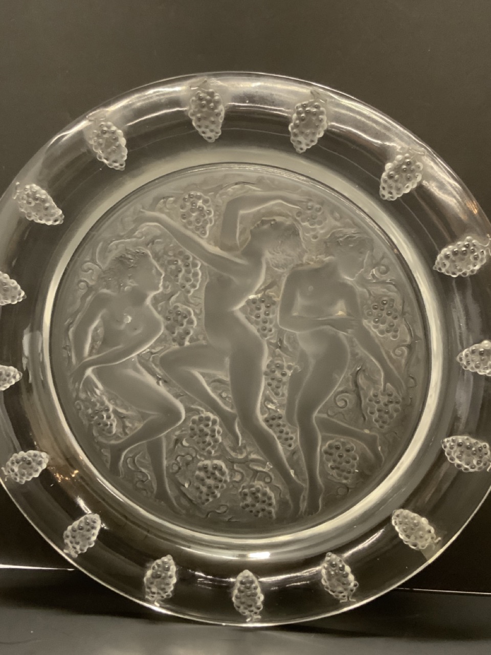 Côte d’Or or Three Dancing Nude Nymphs round charger with grape cluster border.