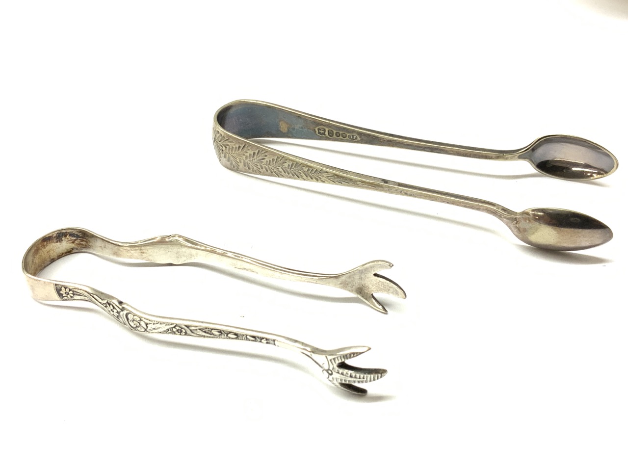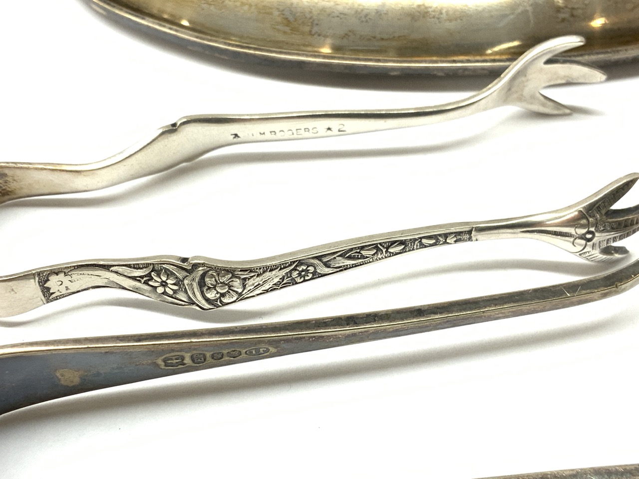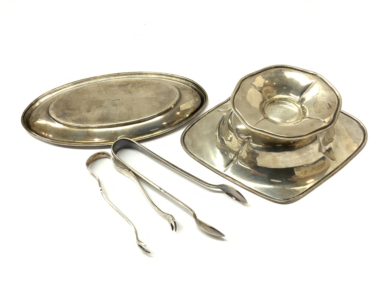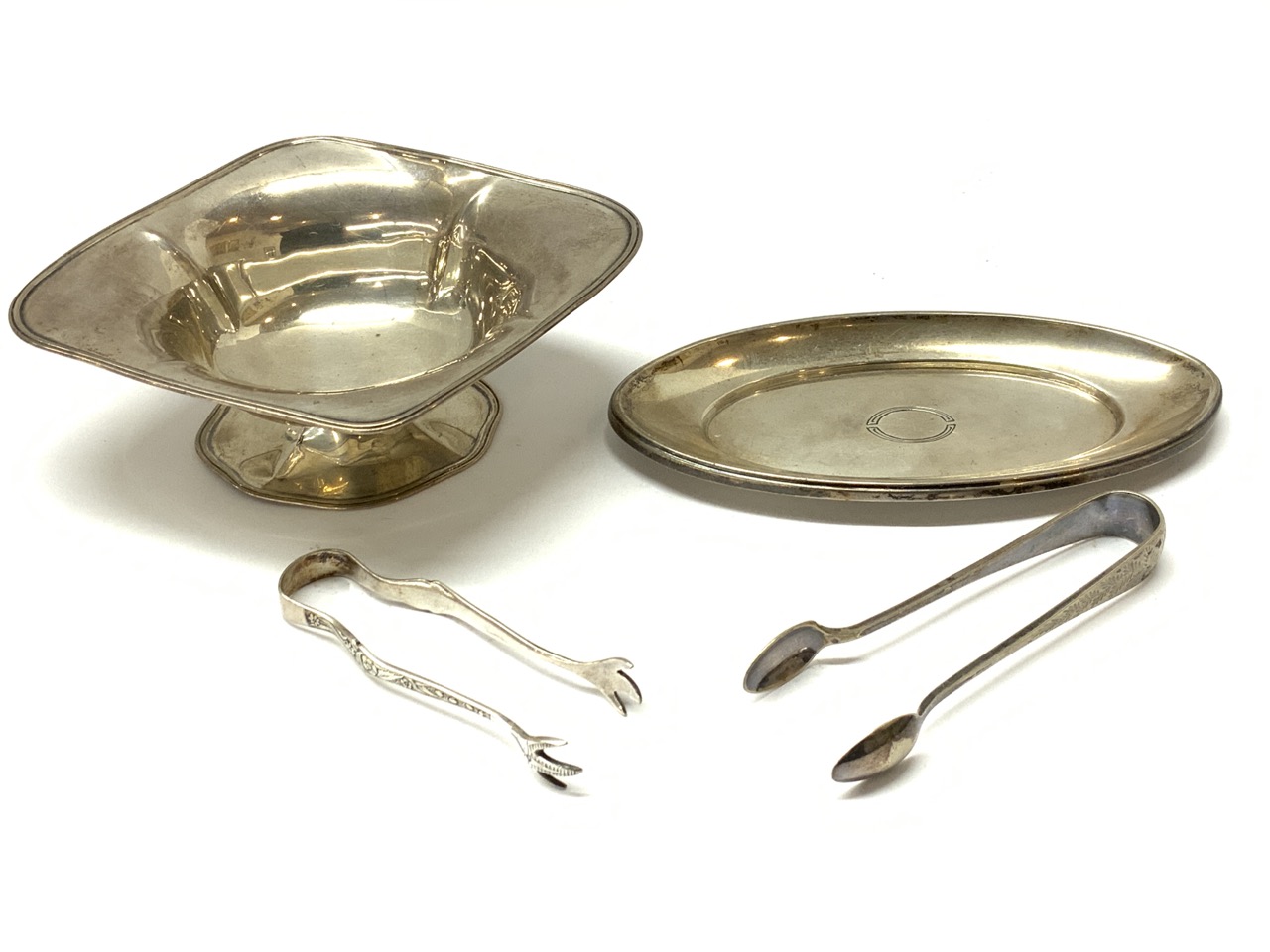 Estate compiled sterling silver bowl and tray along with two silver plated sugar coats.