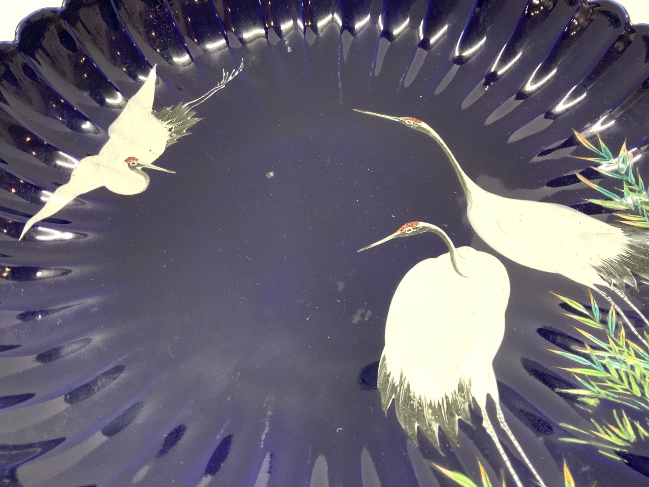 hand painted cranes on cobalt ground