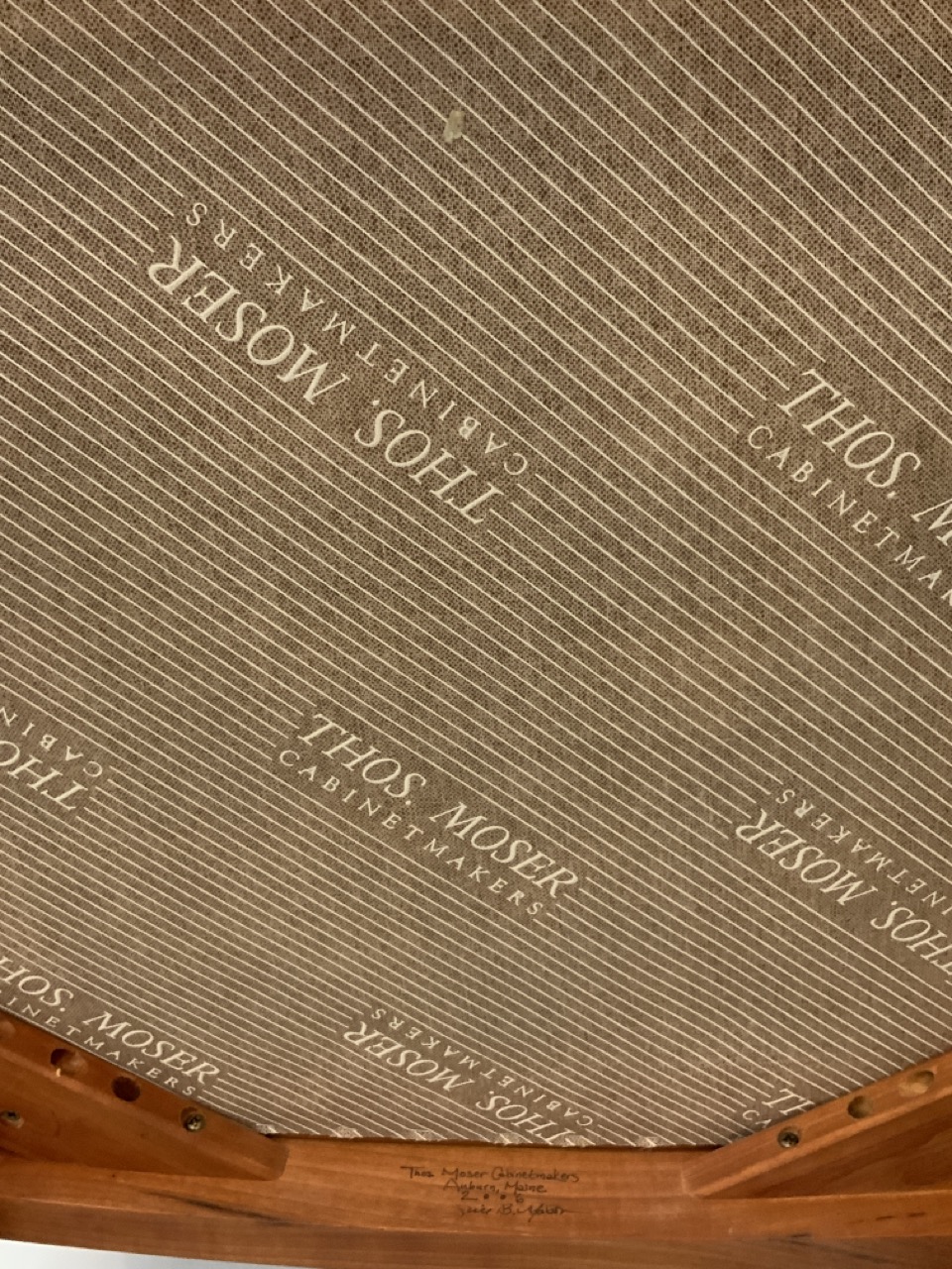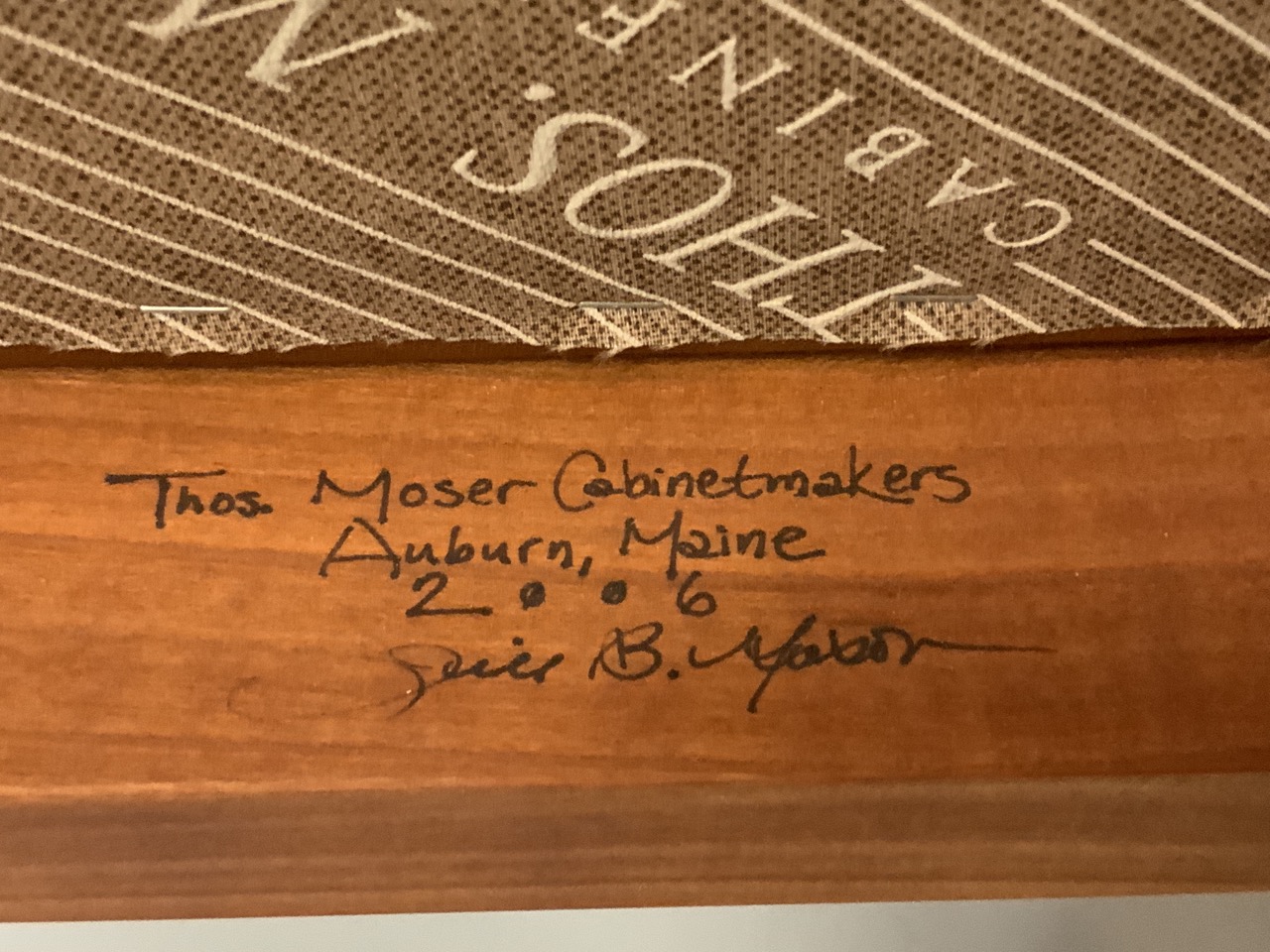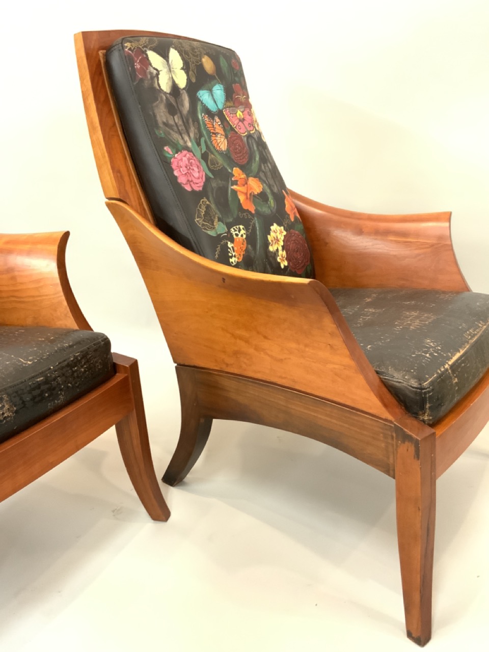 A pair of Thomas Moser, Auburn, Maine c. 2006. hand made and signed cherry wood and black leather wing Chairs.