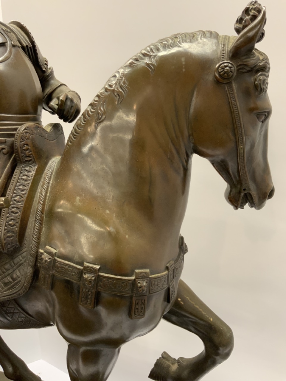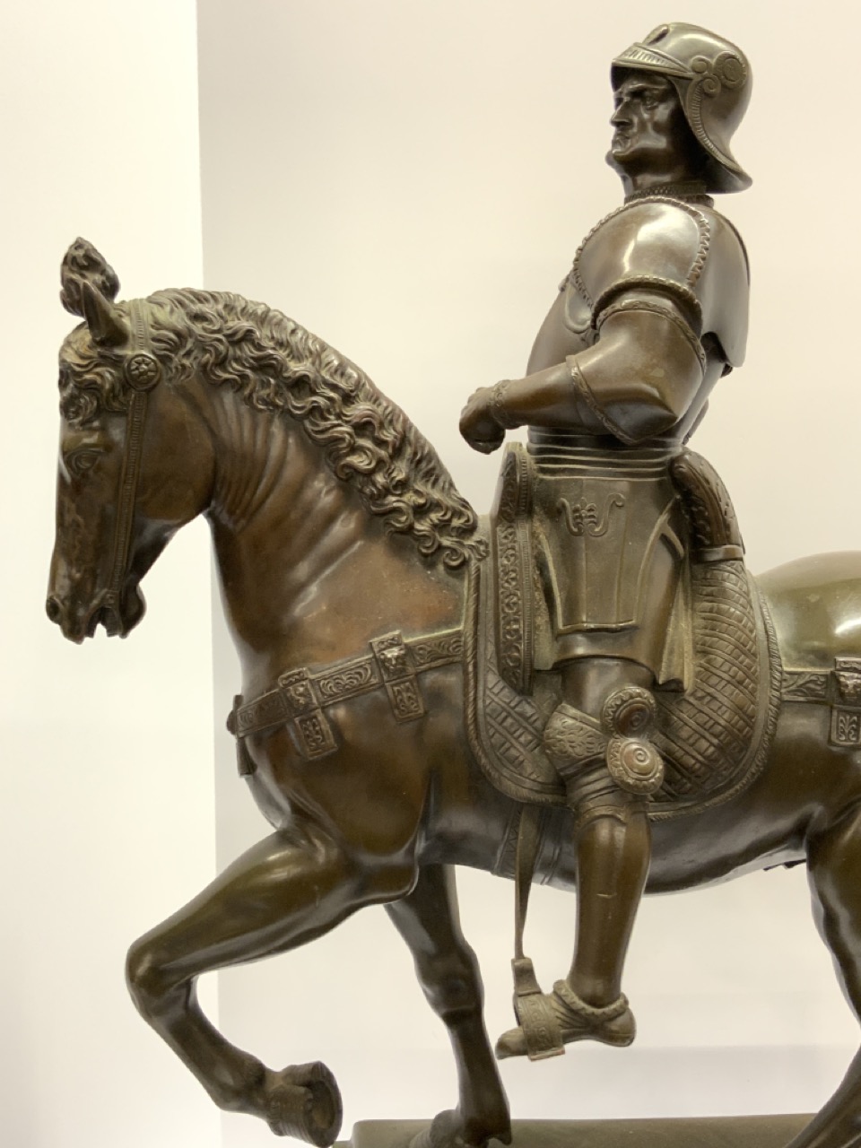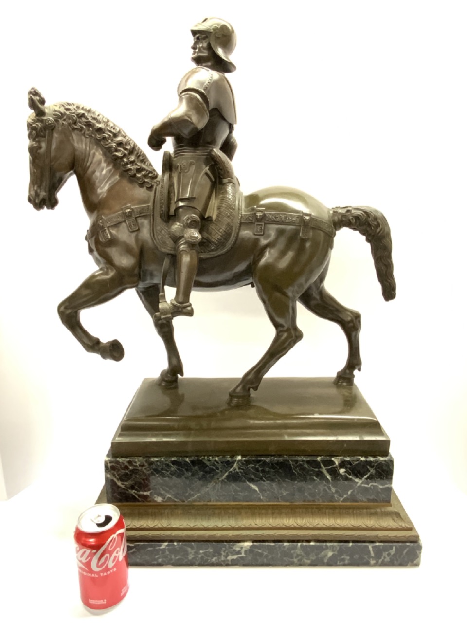 Bronze man mounted on horse with marble pedestal base.