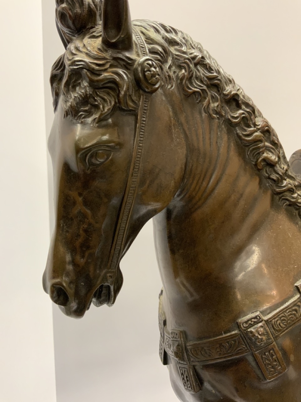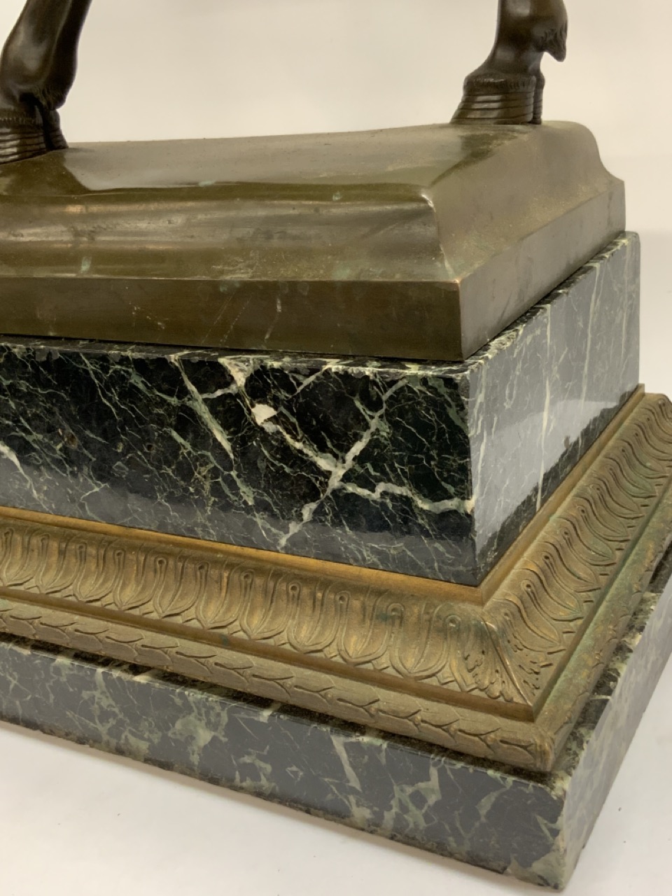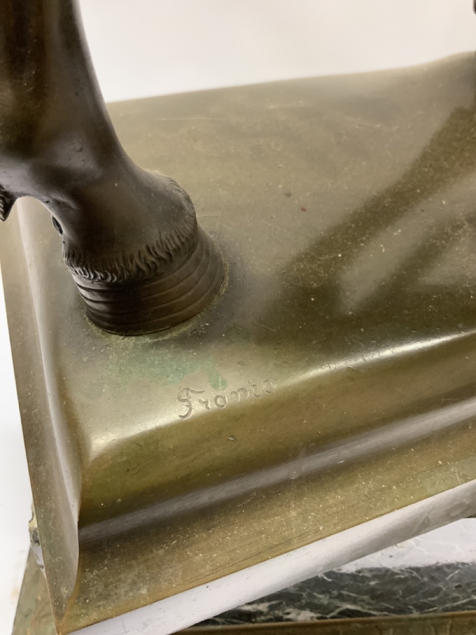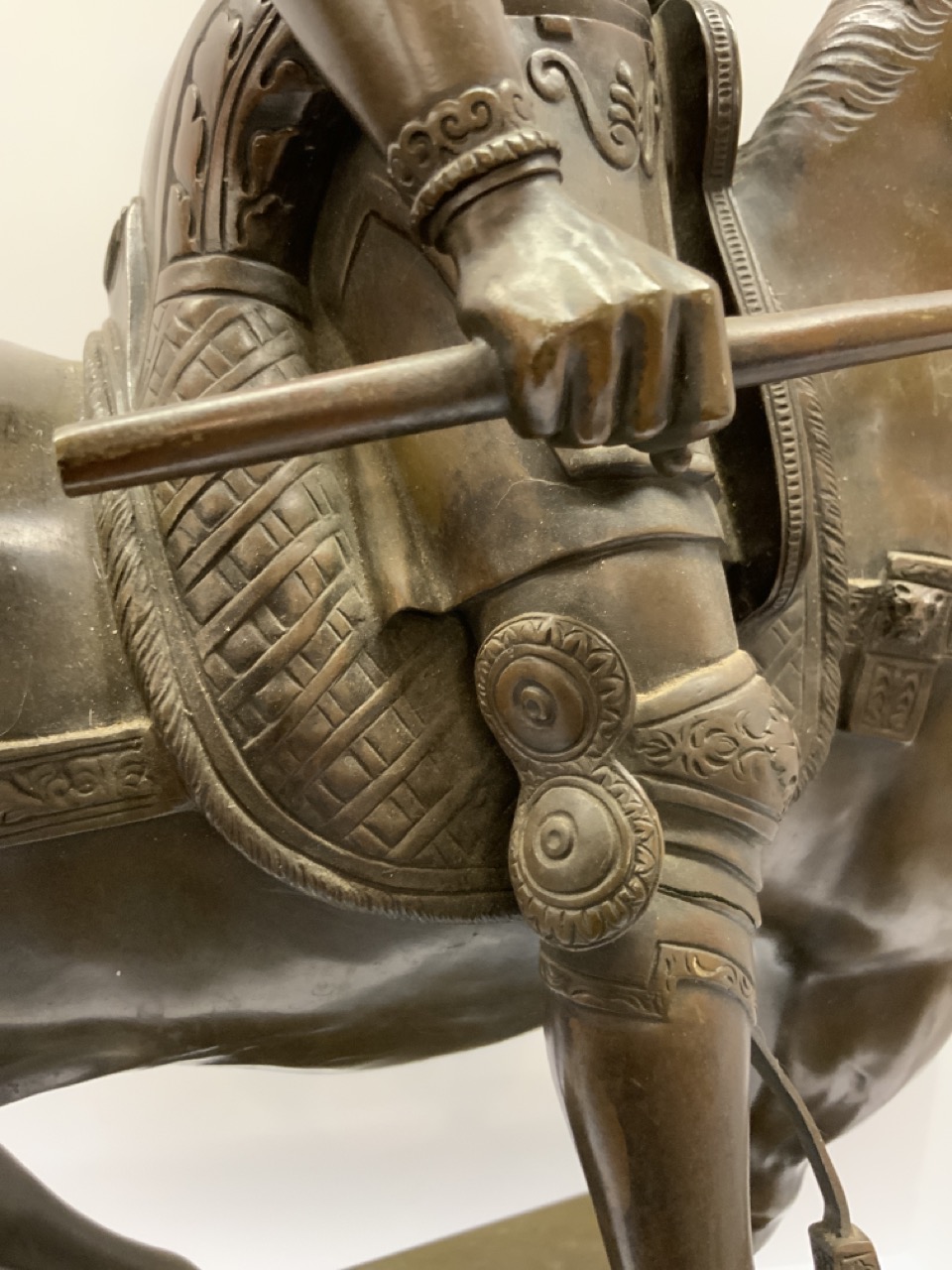 Bronze man mounted on horse with marble pedestal base.