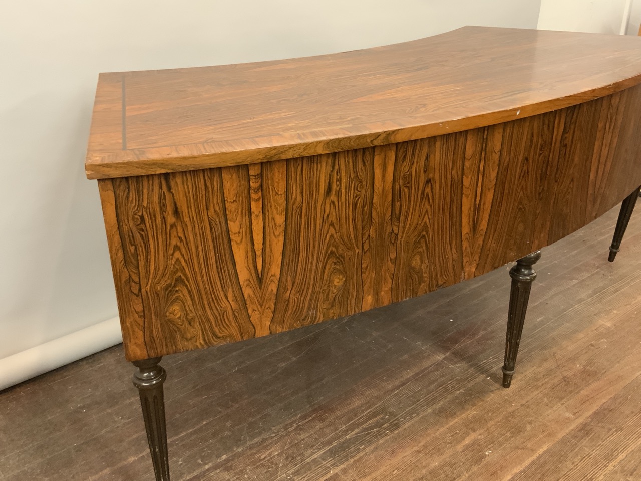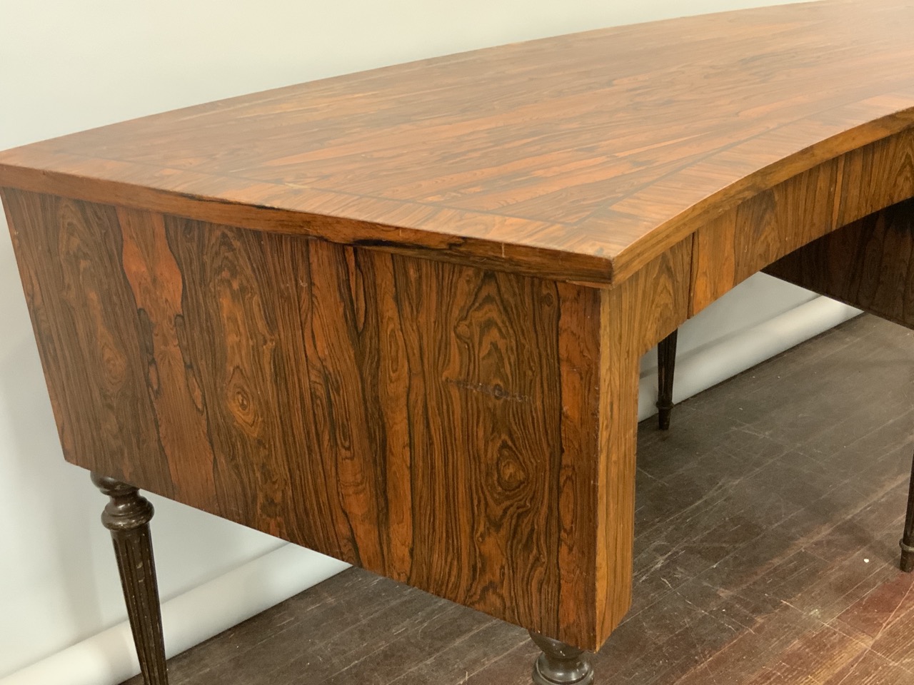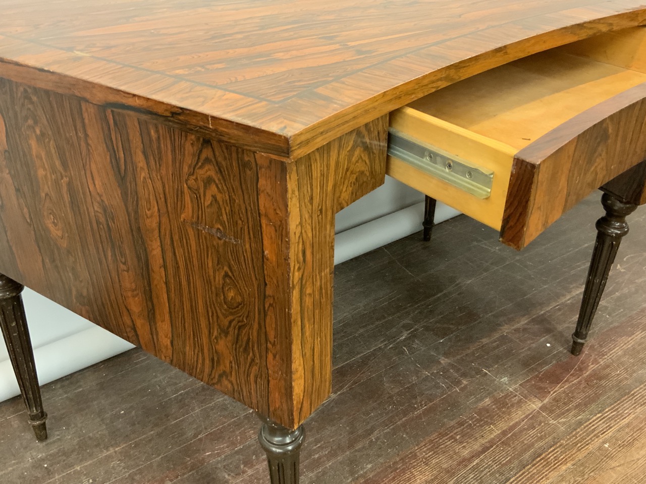 Rosewood desk with side drawer and file cabinet. Legs are very unsteady. Legs need replacing and some loss to banded inlay. Top is very fine rosewood and looks amazing. Custom glass top included.