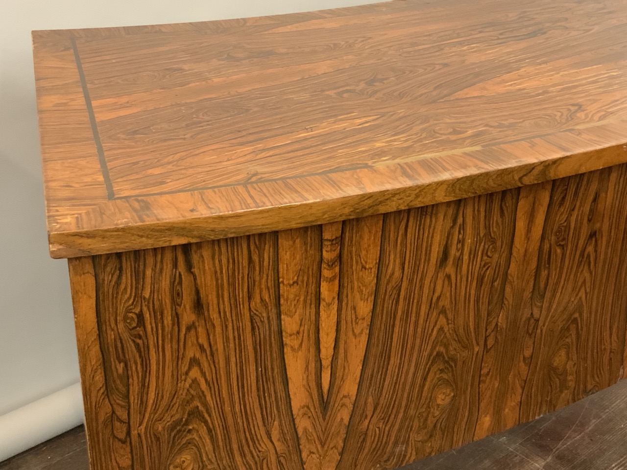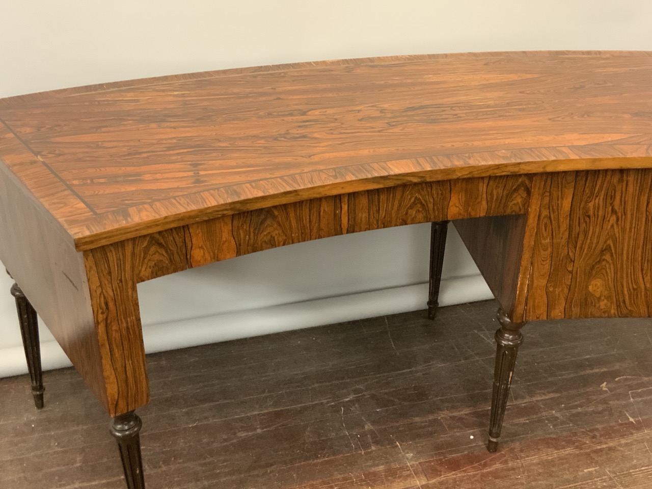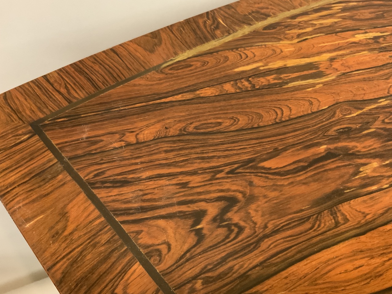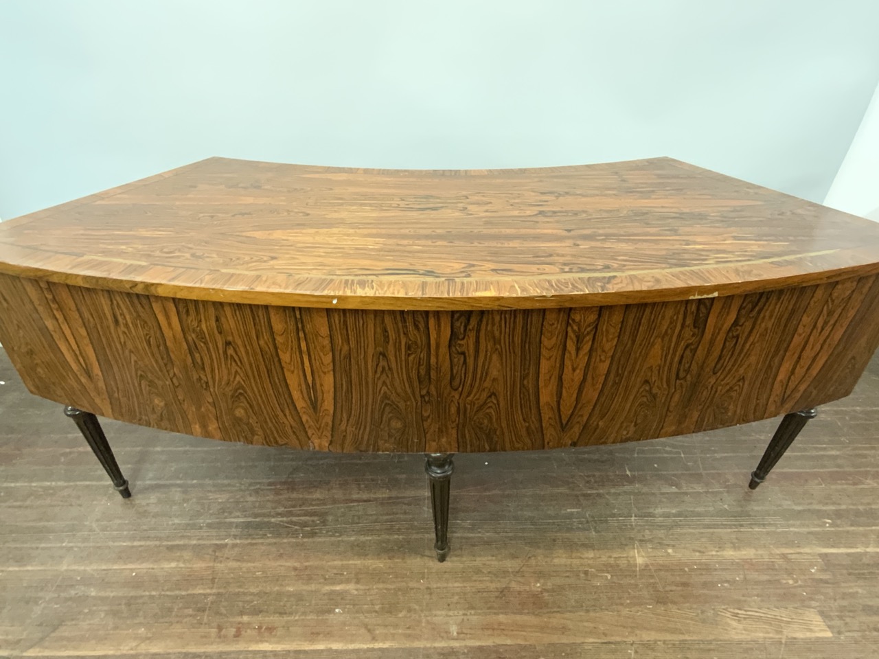 Rosewood desk with side drawer and file cabinet. Legs are very unsteady. Legs need replacing and some loss to banded inlay. Top is very fine rosewood and looks amazing. Custom glass top included.