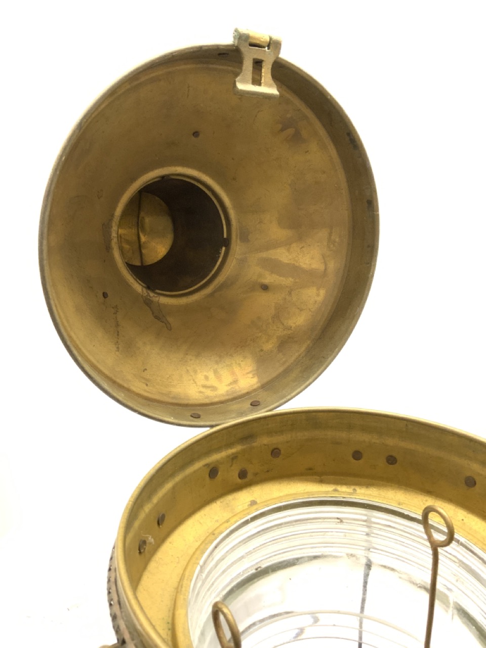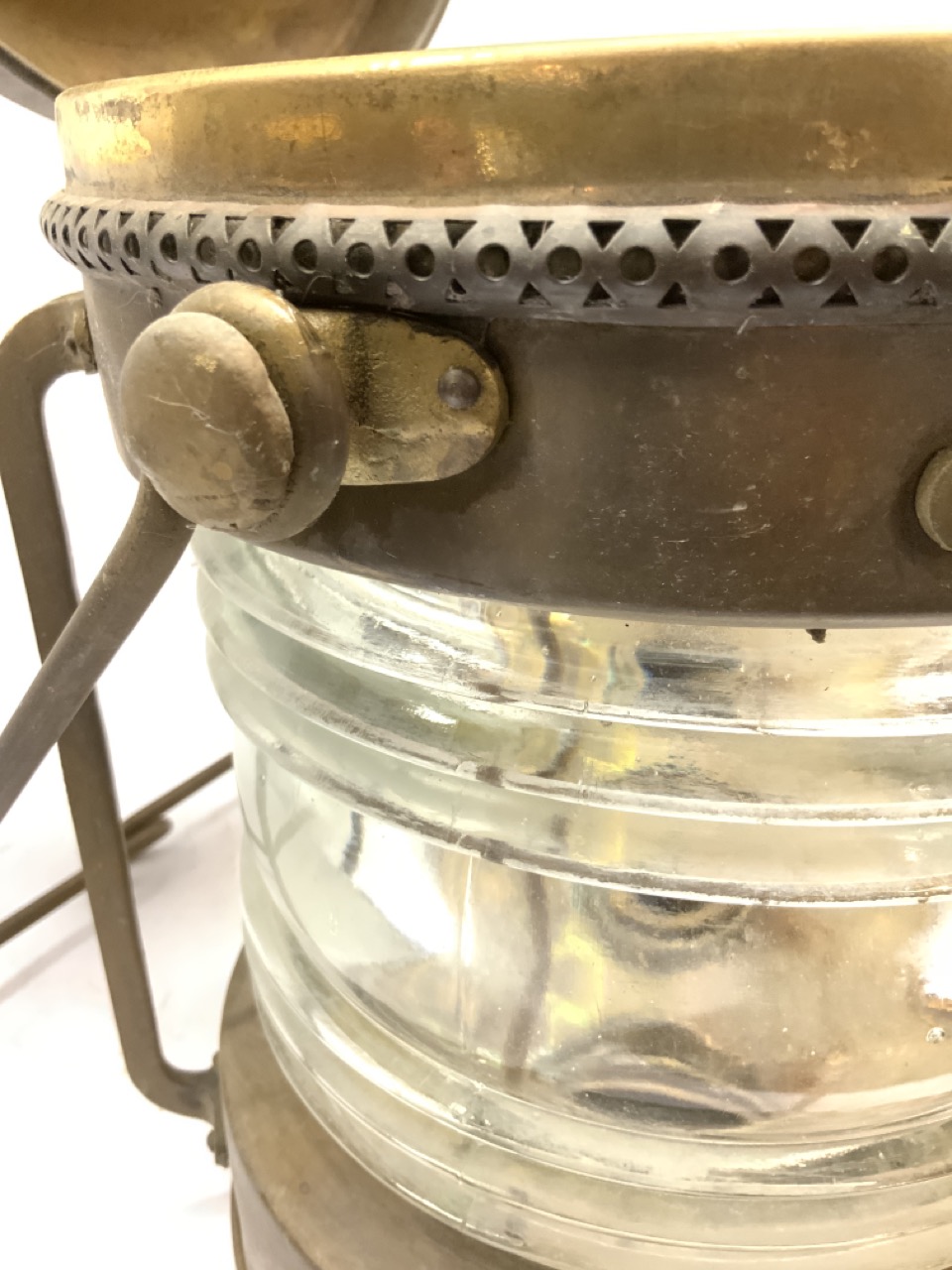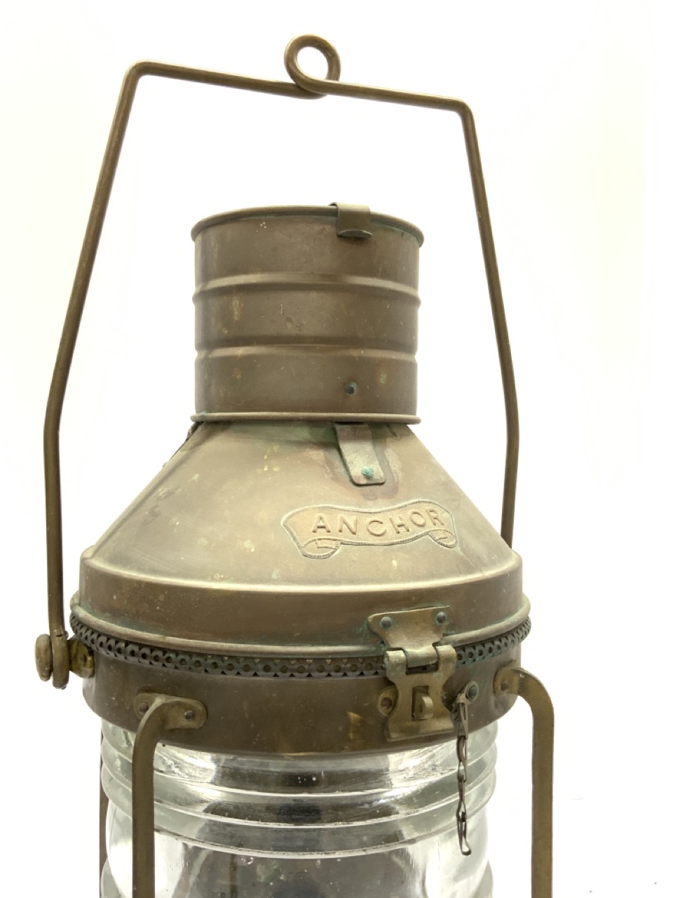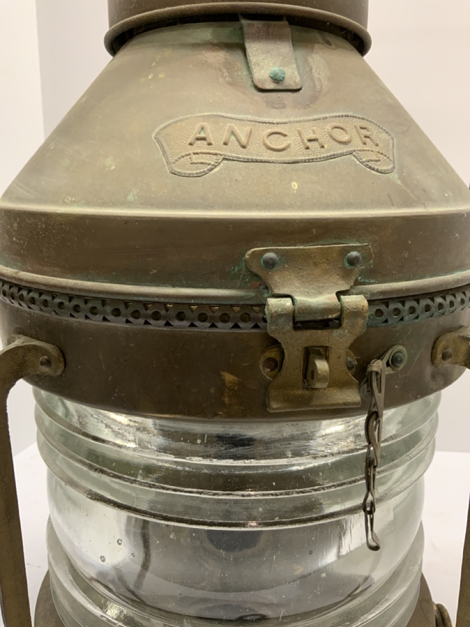 A c. 1950’s Brass Anchor Ship’s Lantern. A thick clear glass globe. Needs oil burner and polish.