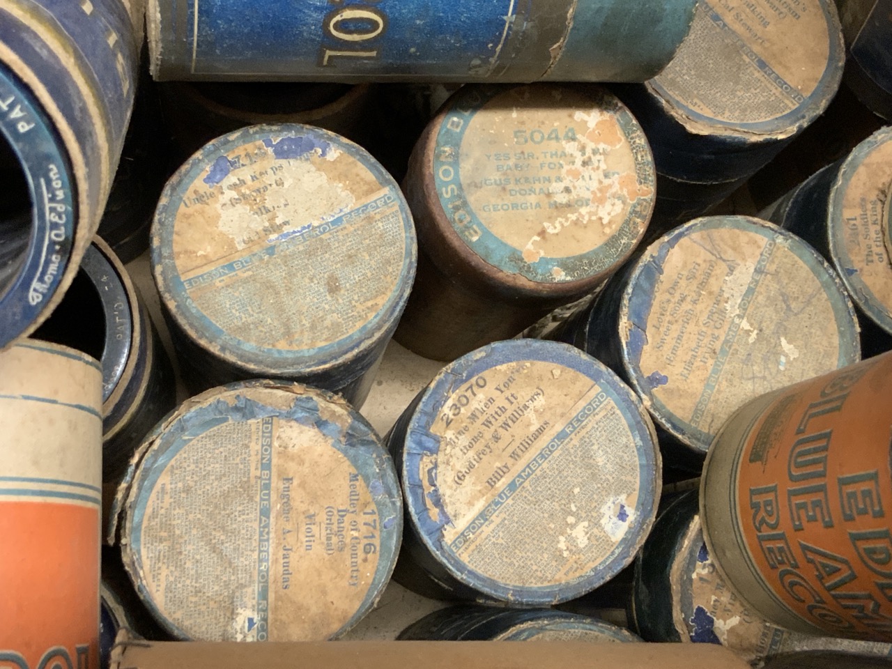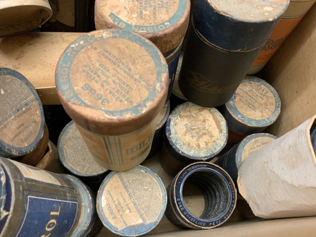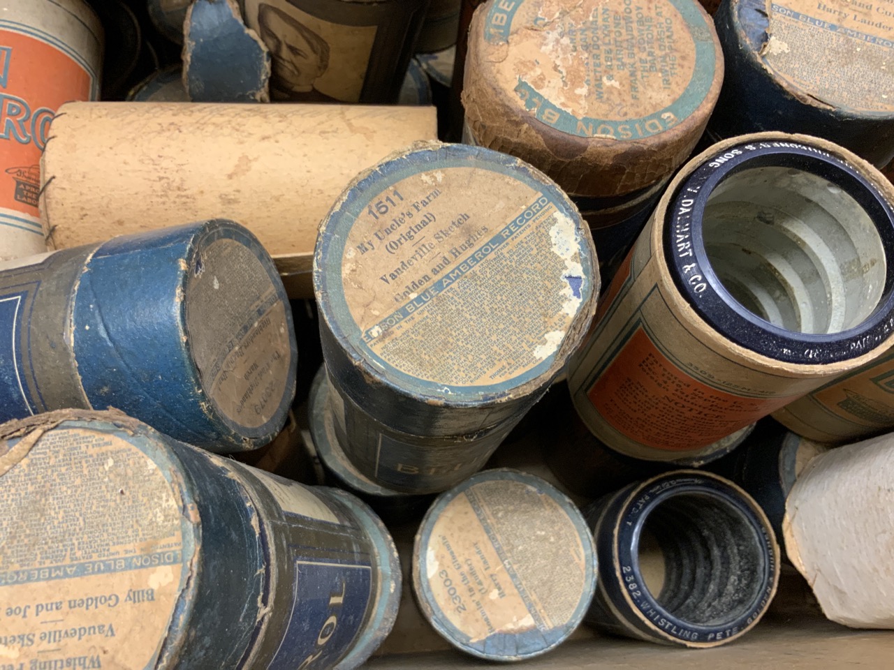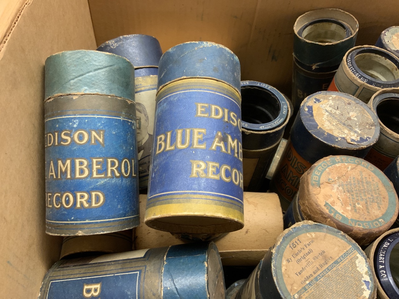 A Box of Assorted Edison blue amber roll cylinder records approximately 30+ pieces. As is.