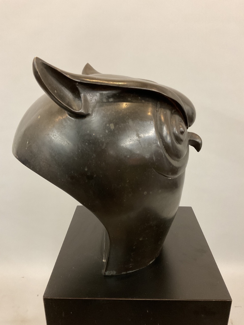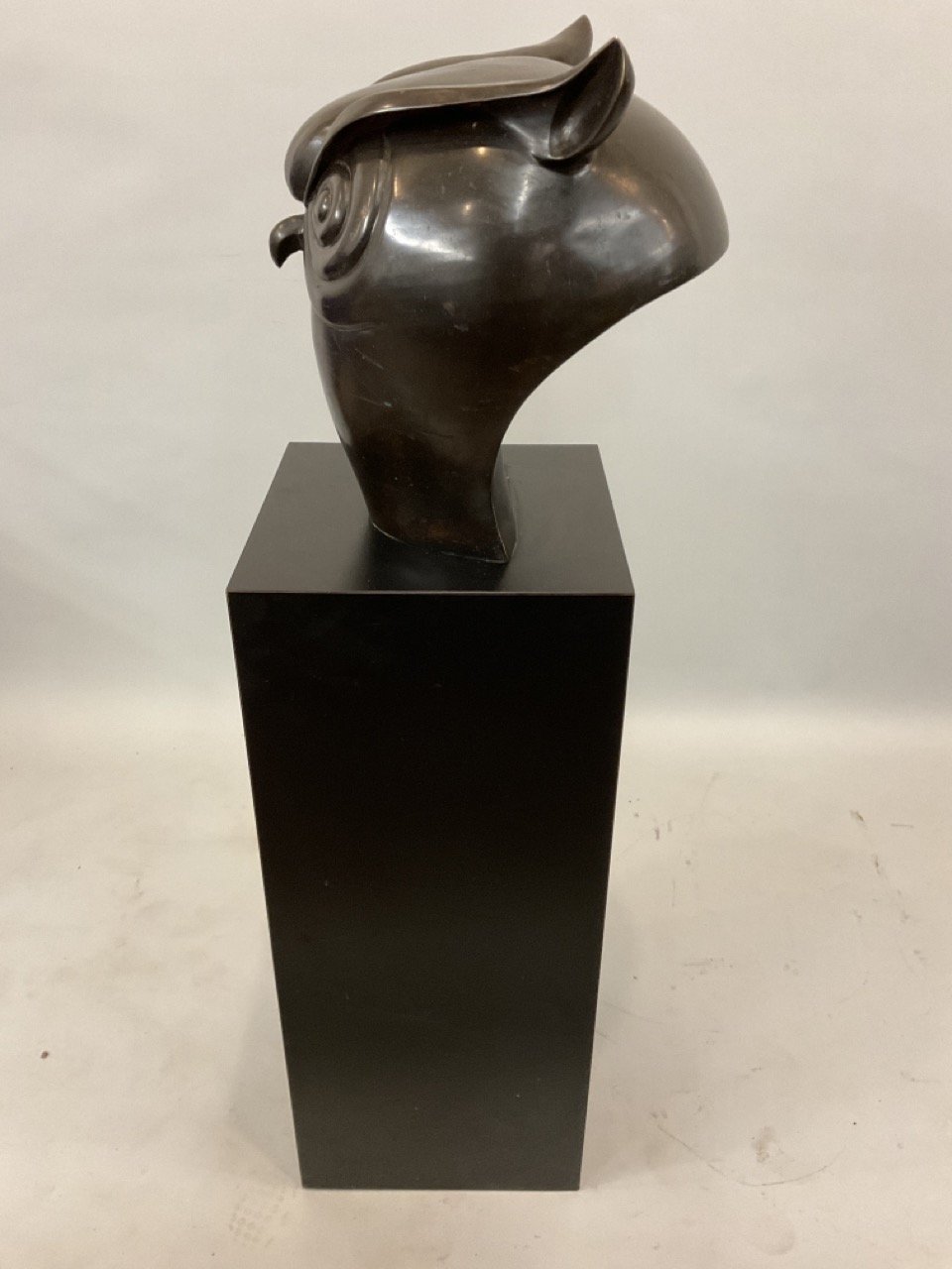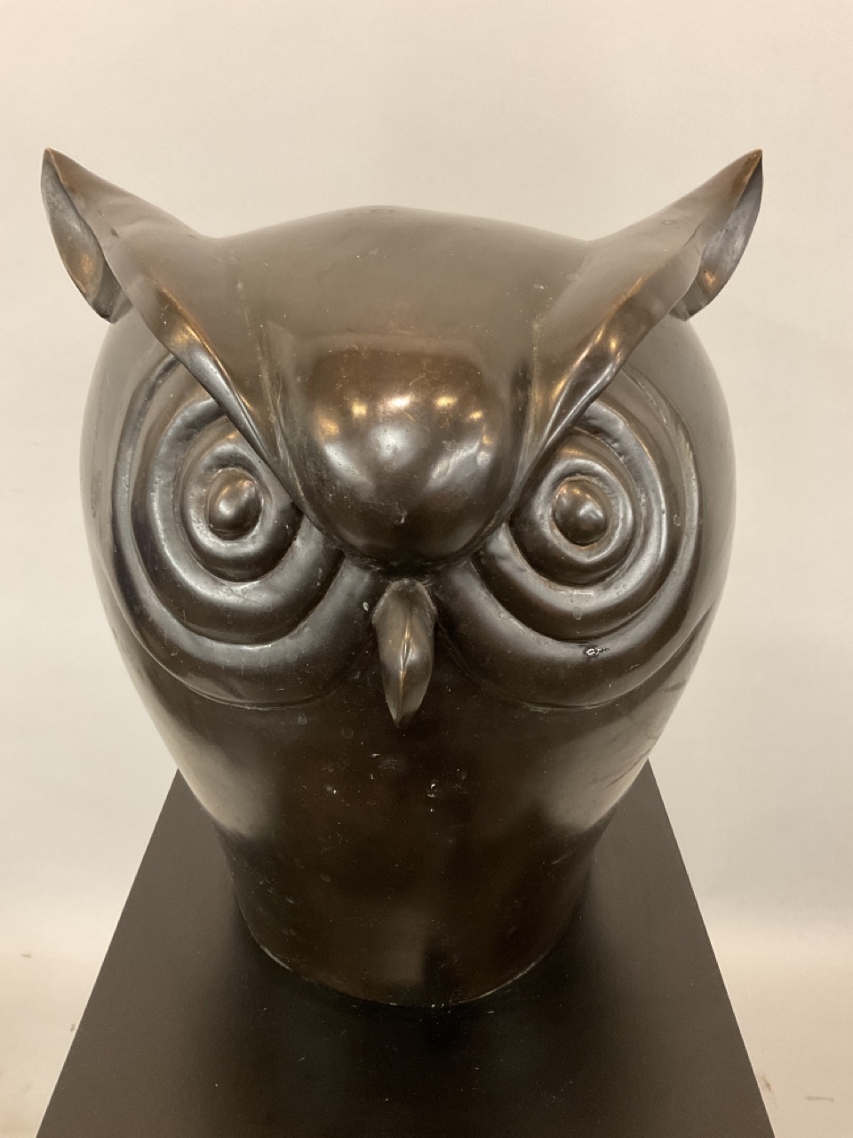 A contemporary designed sculpture of an owl mounted on black pedestal base. In the style of Botero, this piece is unsigned.