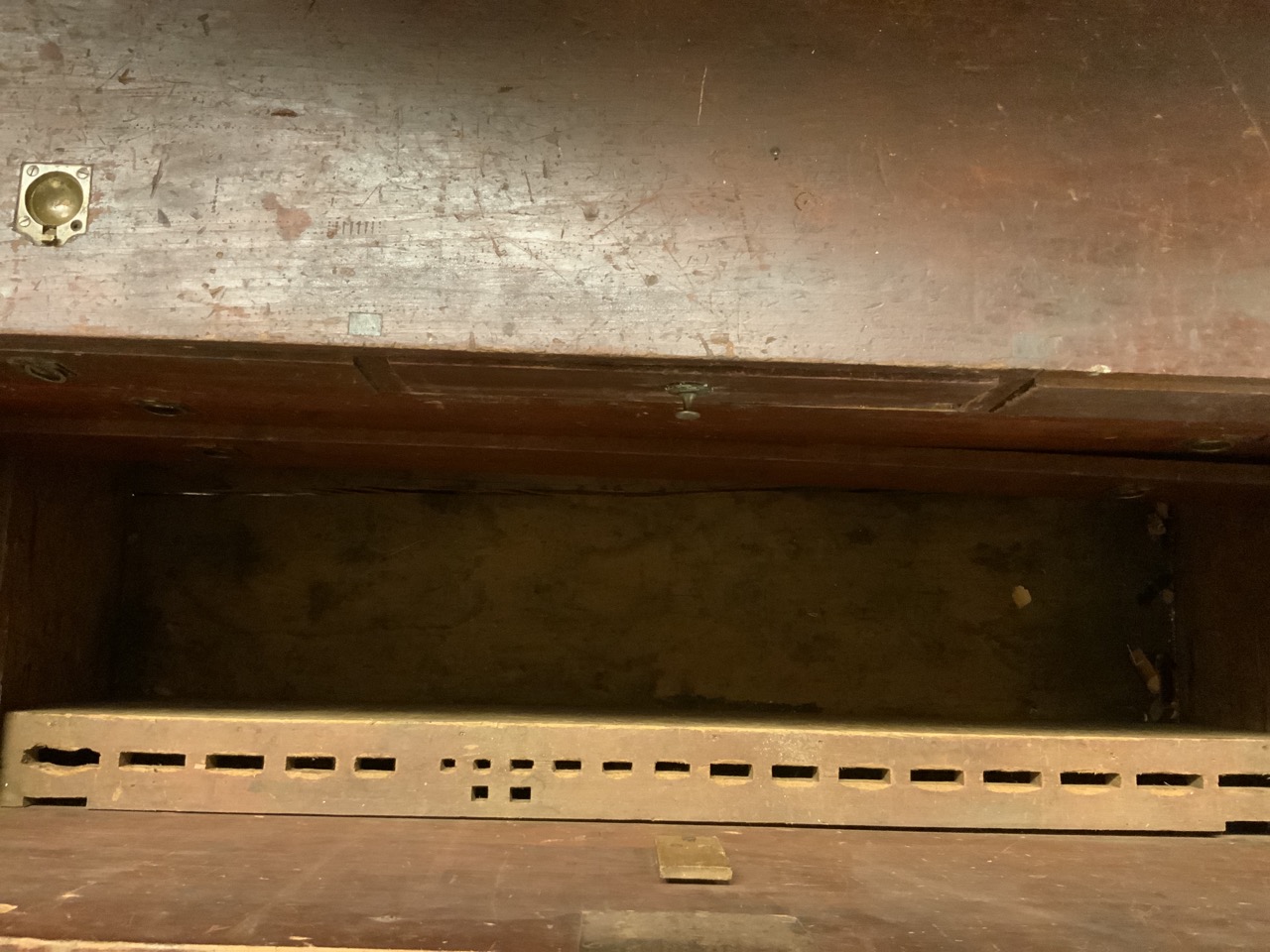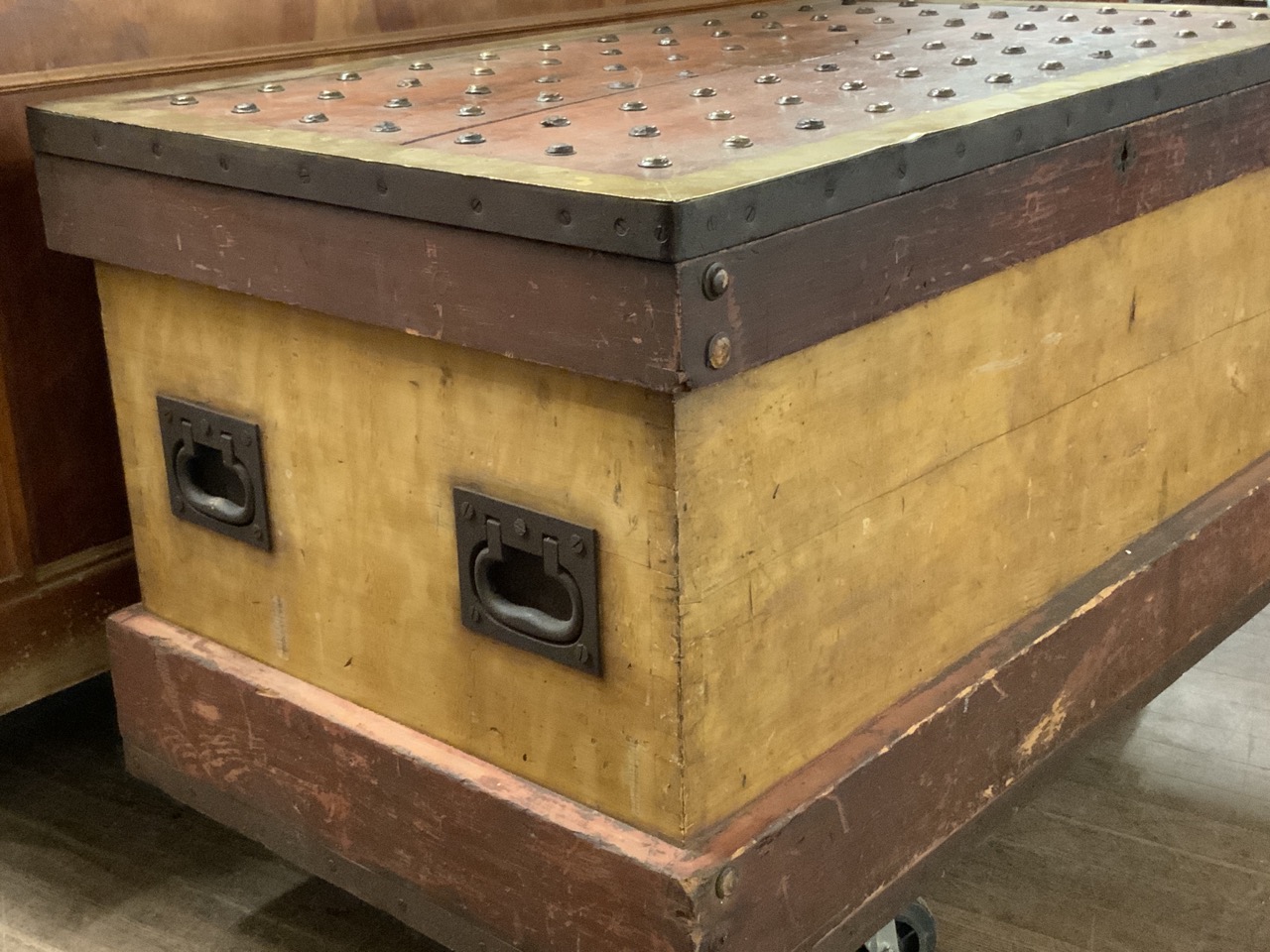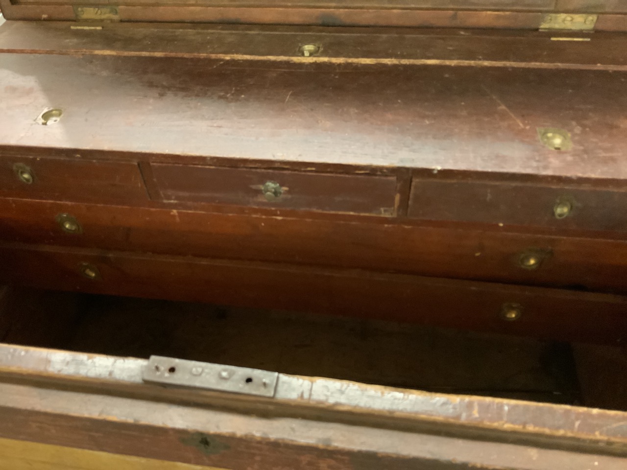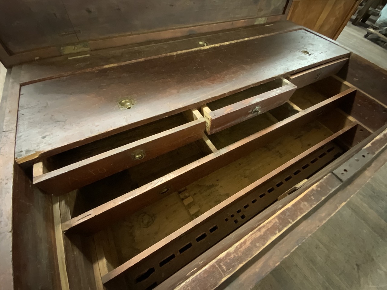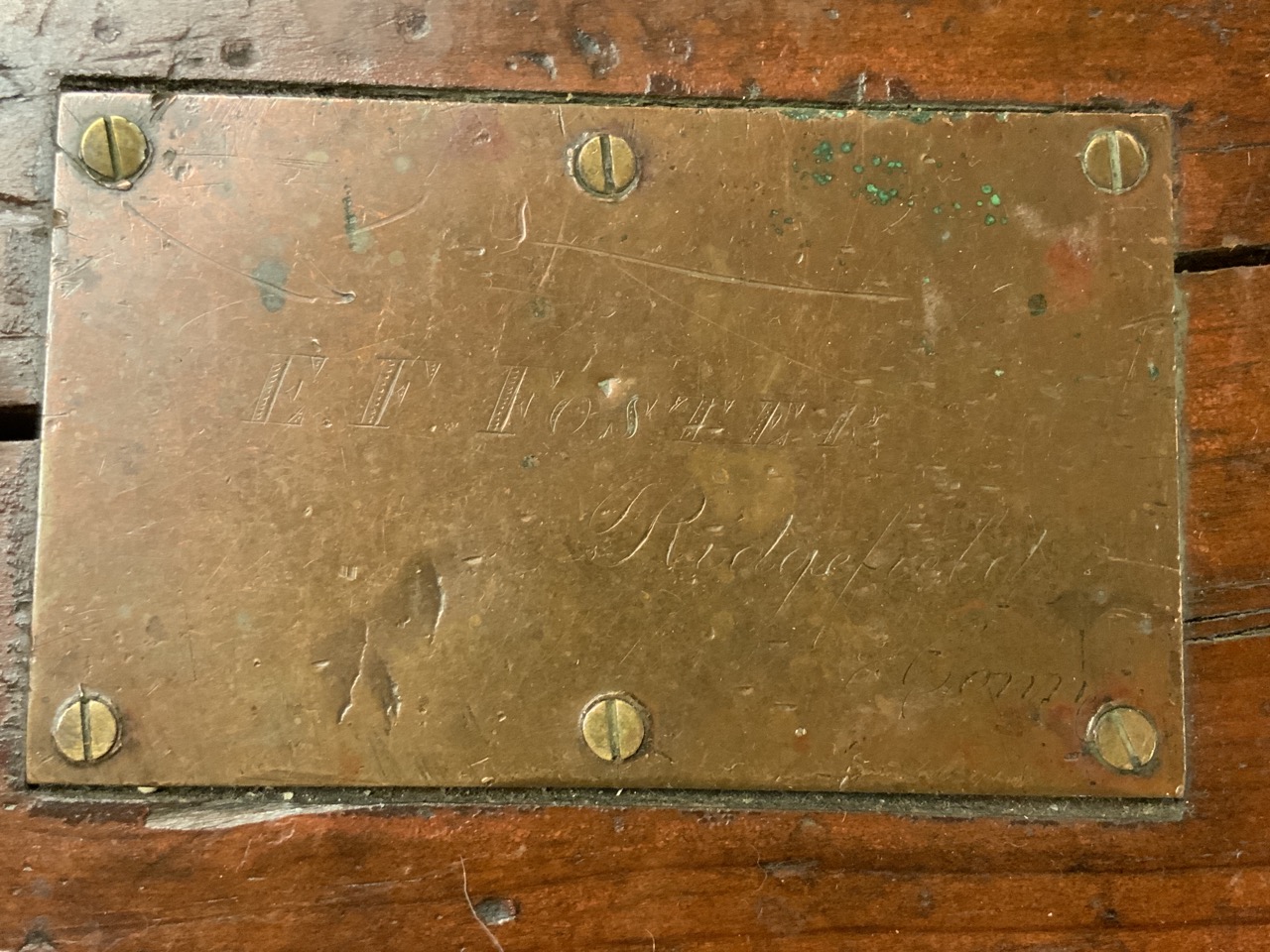 An antique carpenter's chest. Large oversize with brass reinforcement. Studded top. A brass plaque centered at top readls E.A. Foster Ridgefield, CT Interior is filled with drawers an slots to house woodworking tooks, chisels, drills, woodplanes etc. A very impressive chest. Dimensions:41 1/2” x 24 3/4” x 22 1/4”