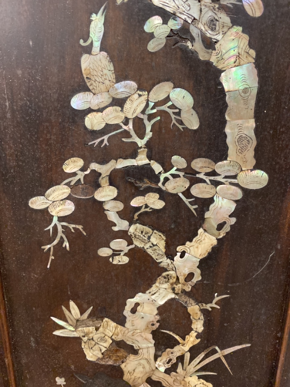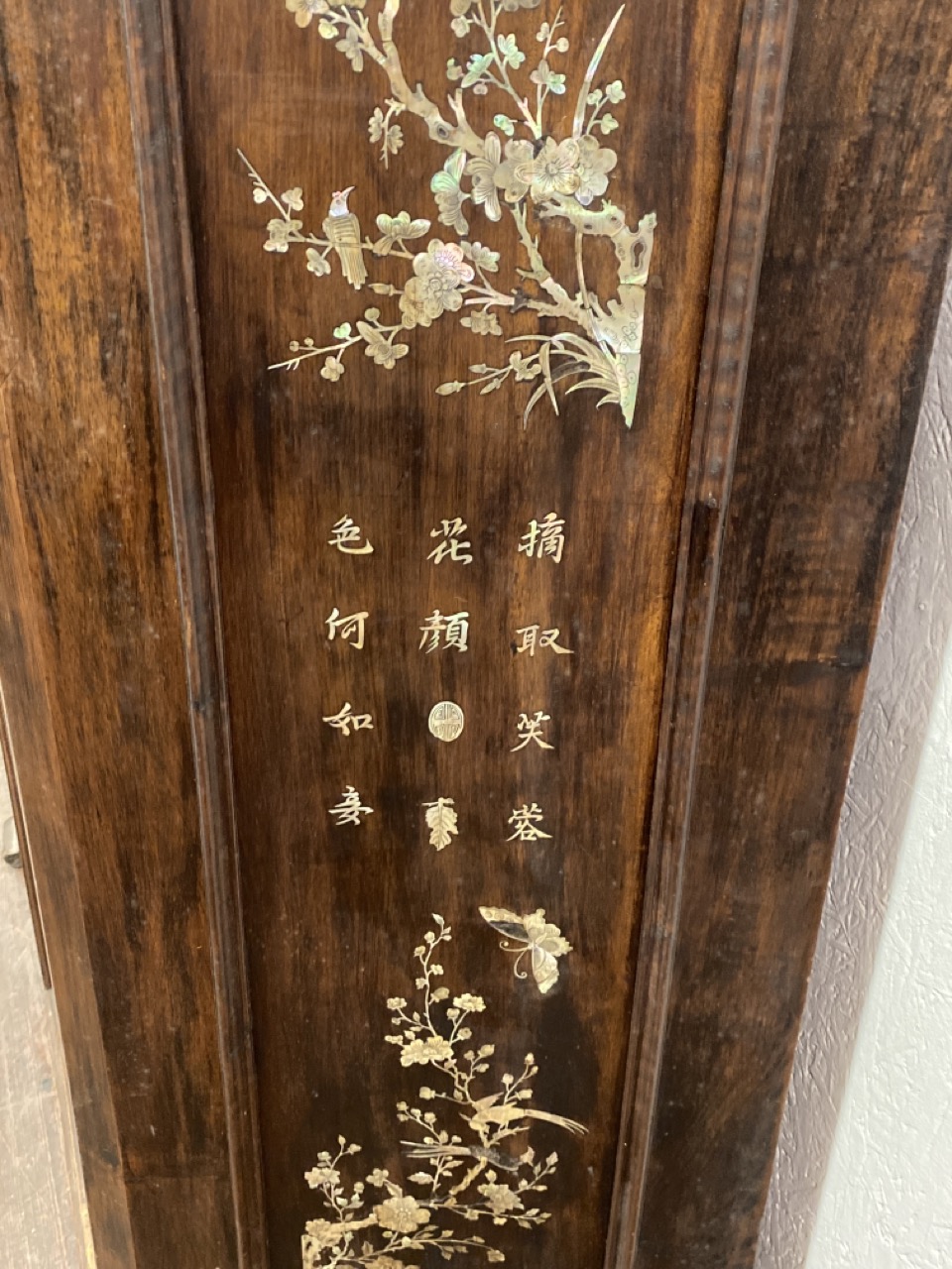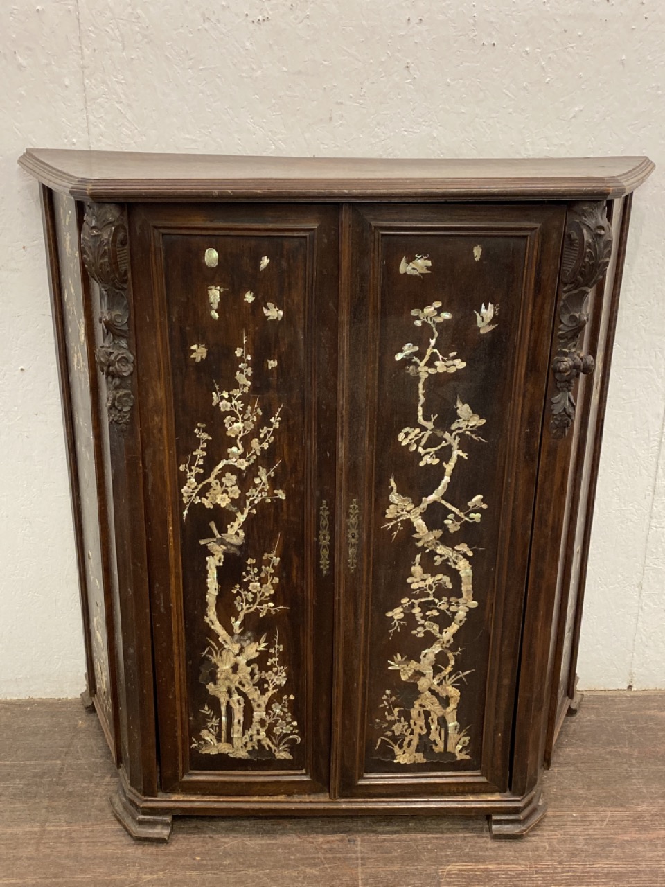 19th Century French Chinoiserie two Door Cabinet. Highly ornate mother of pearl inlays. Dimension: 51 1/2” x 49 1/2” x 18”