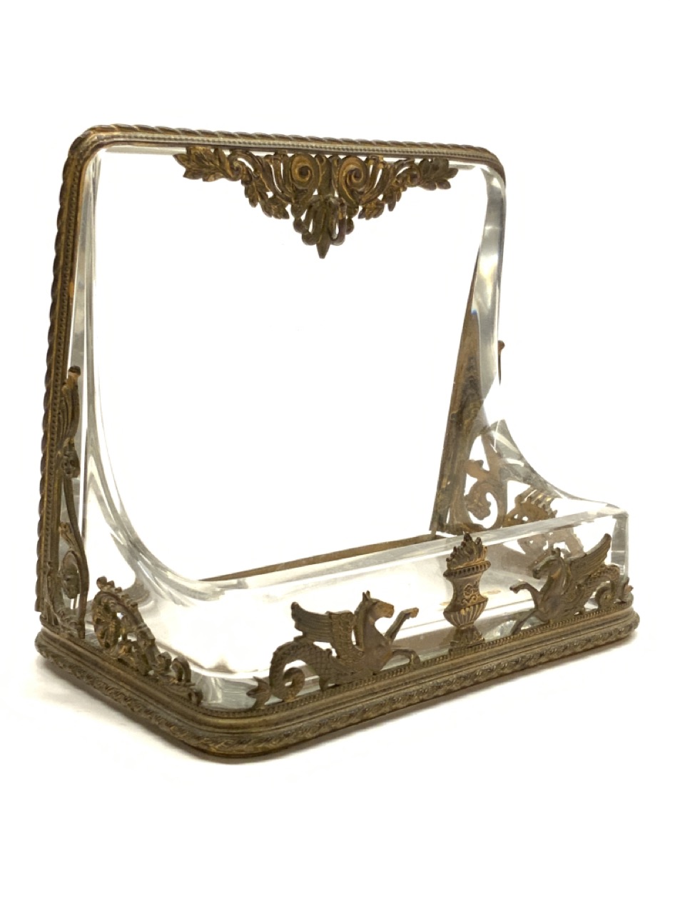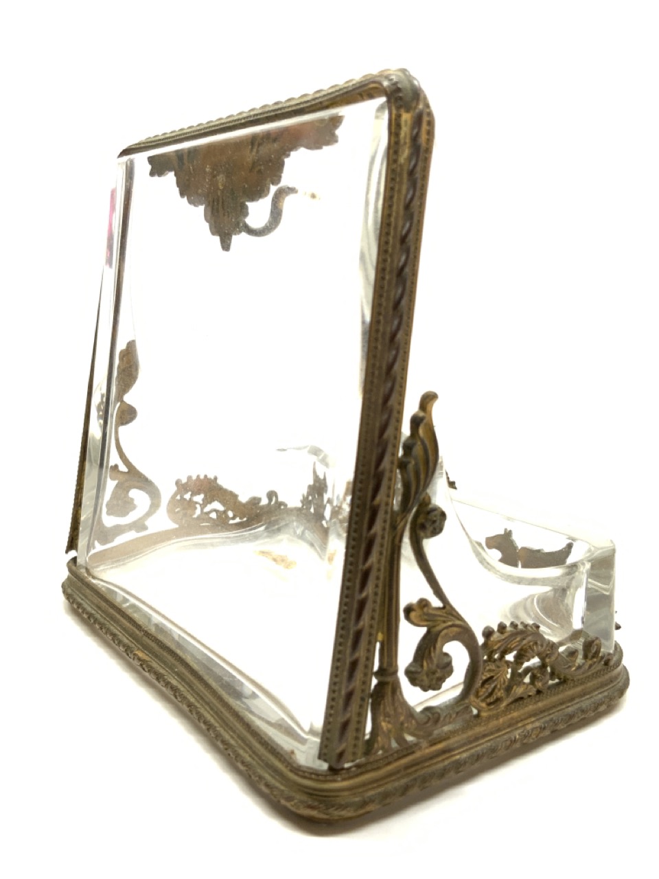 An antique pocket watch holder. Crystal insert with dore bronze frame.