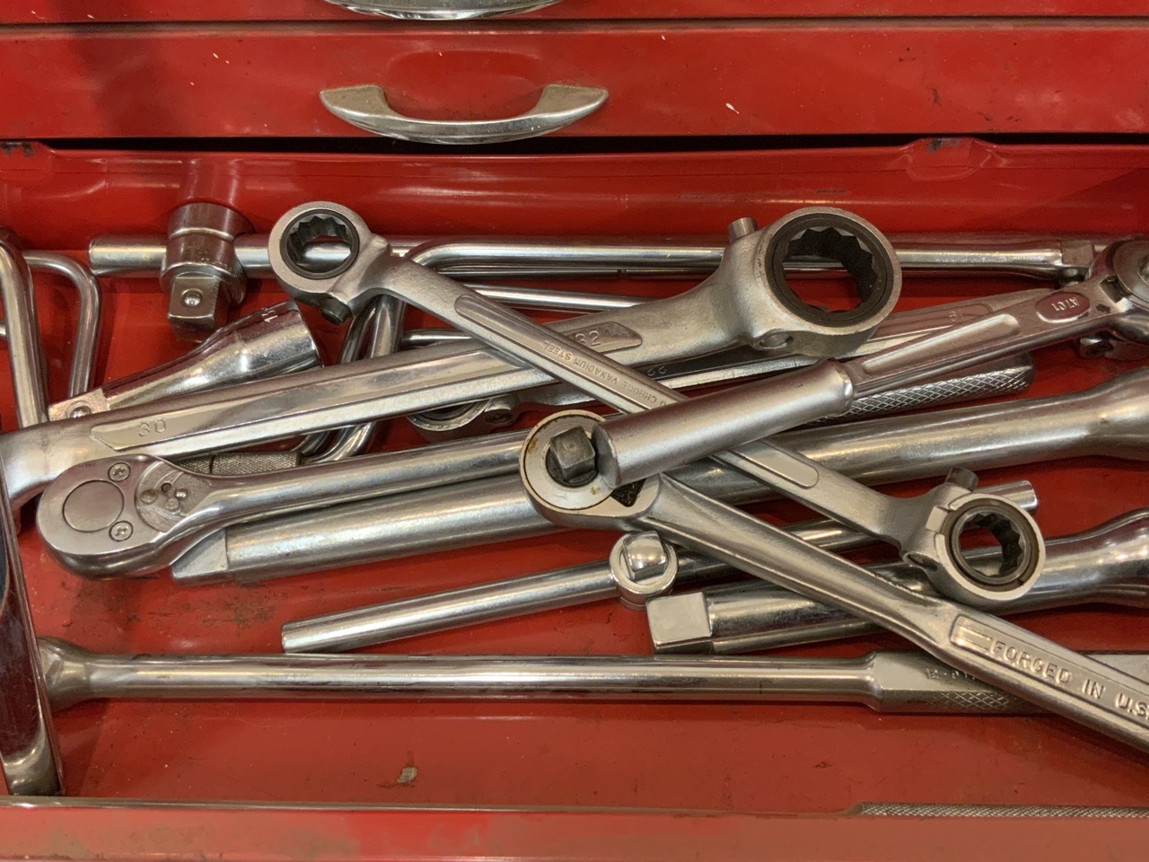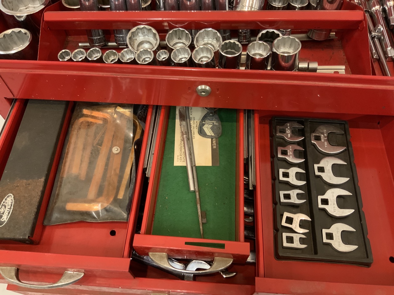 A tool chest with multiple size sockets and wrenches as seen in photograph preview.