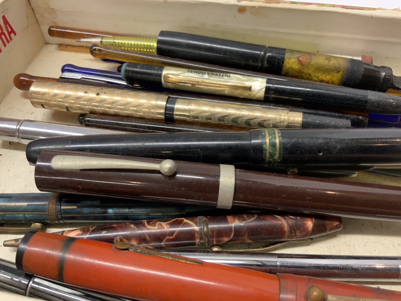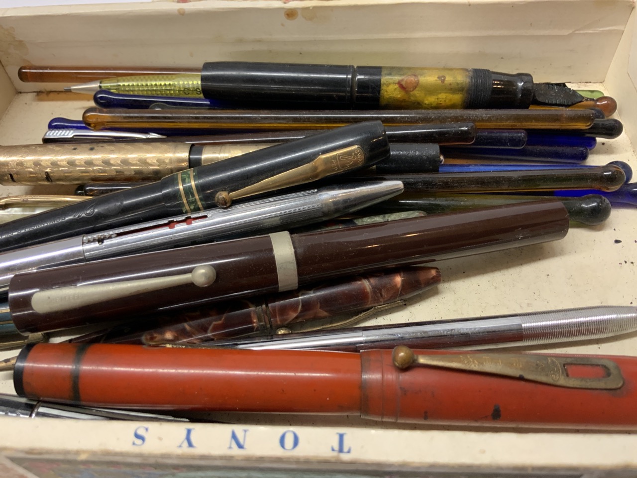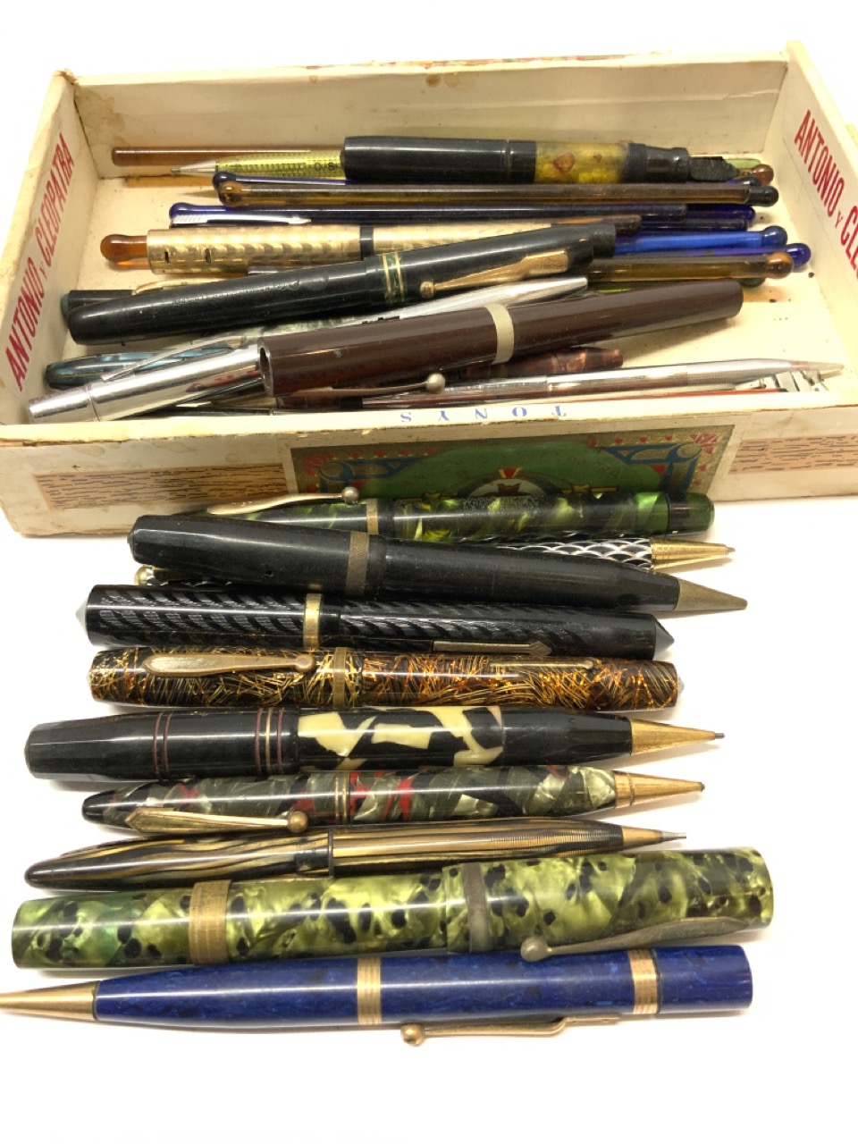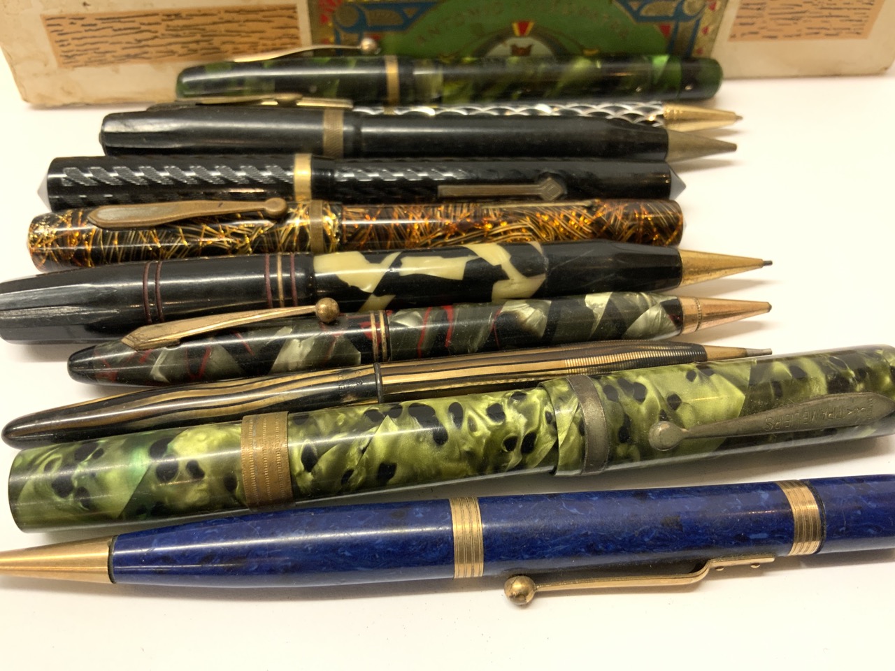 A compiled grouping of vintage pens, mechanical pencils and fountain pens. As seen in photograph preview.