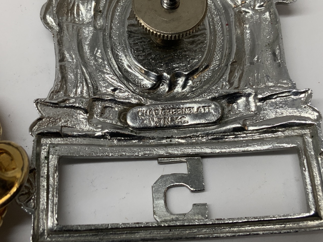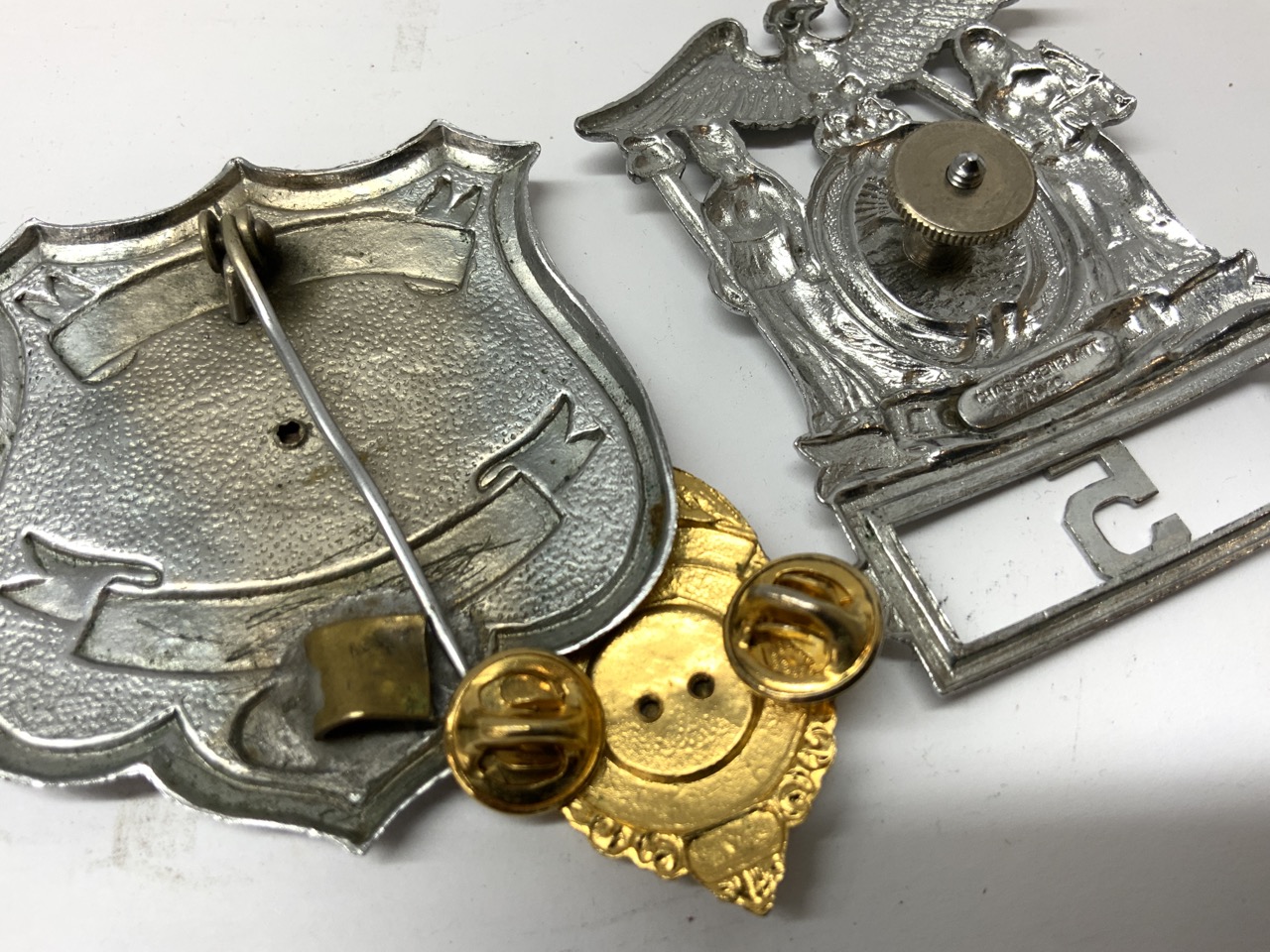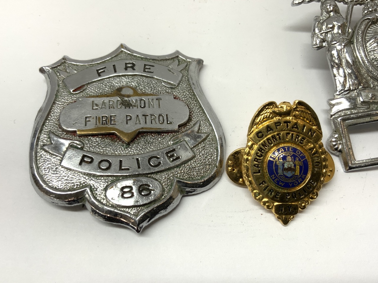 Vintage Larchmont fire department badges. As seen in photograph preview.