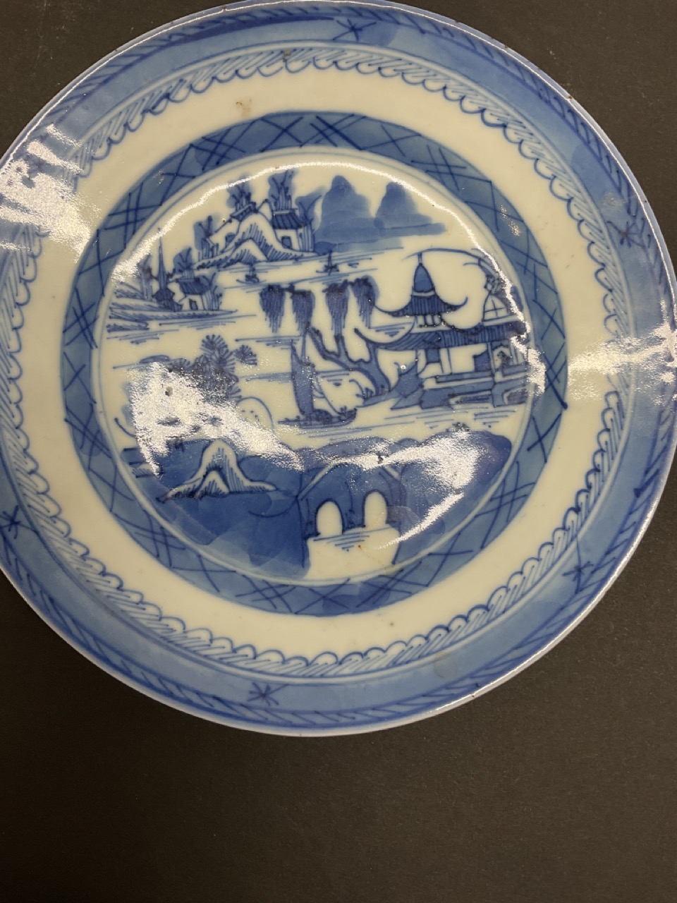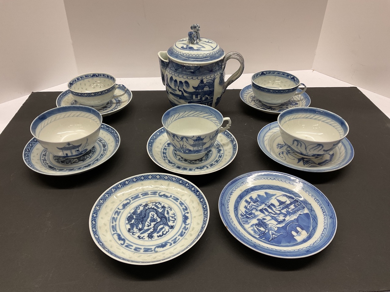 (7) plates, (5) cups, (1) teapot