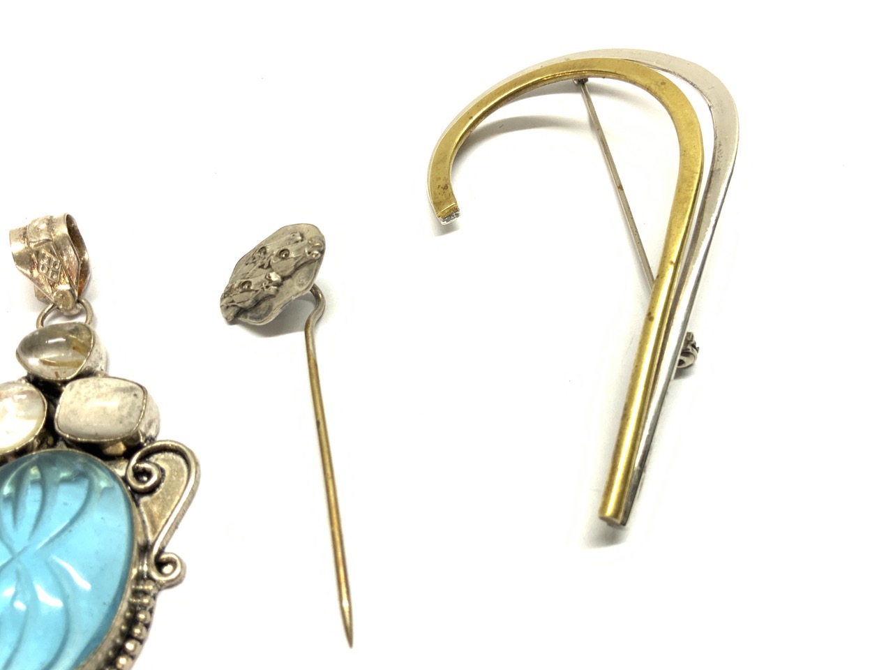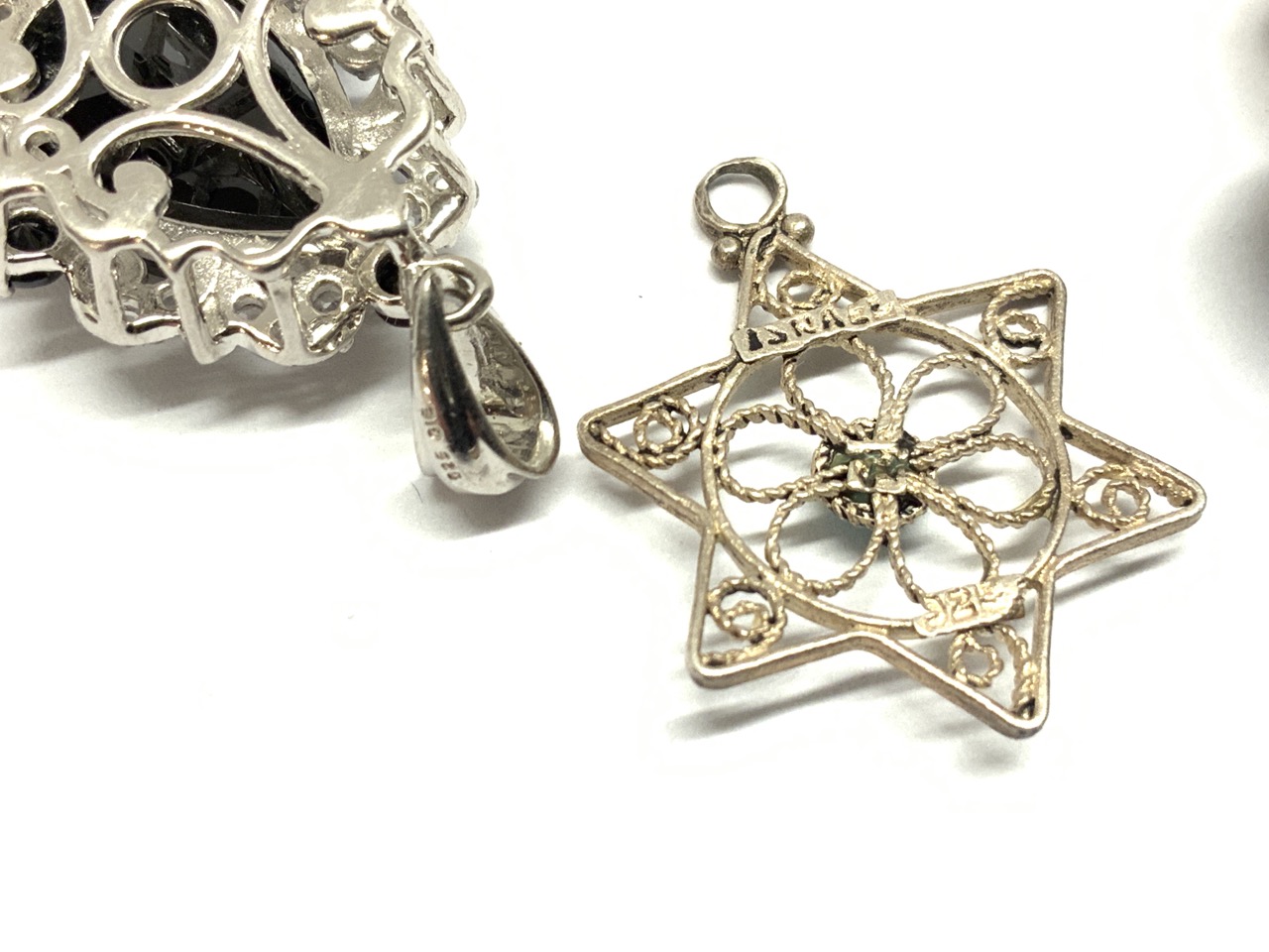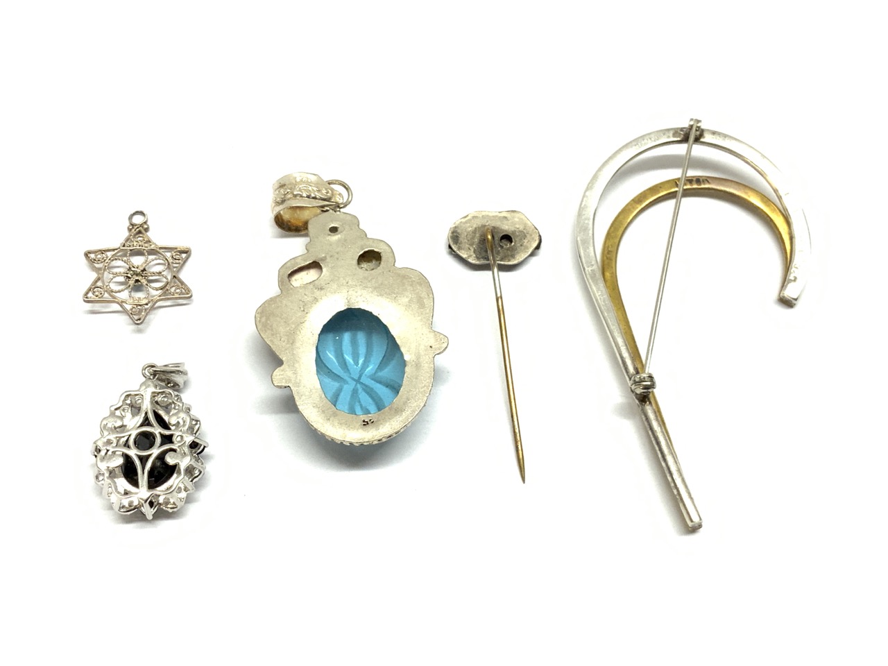 Five piece sterling silver jewelry. Pins and pendants. As seen in photograph preview.