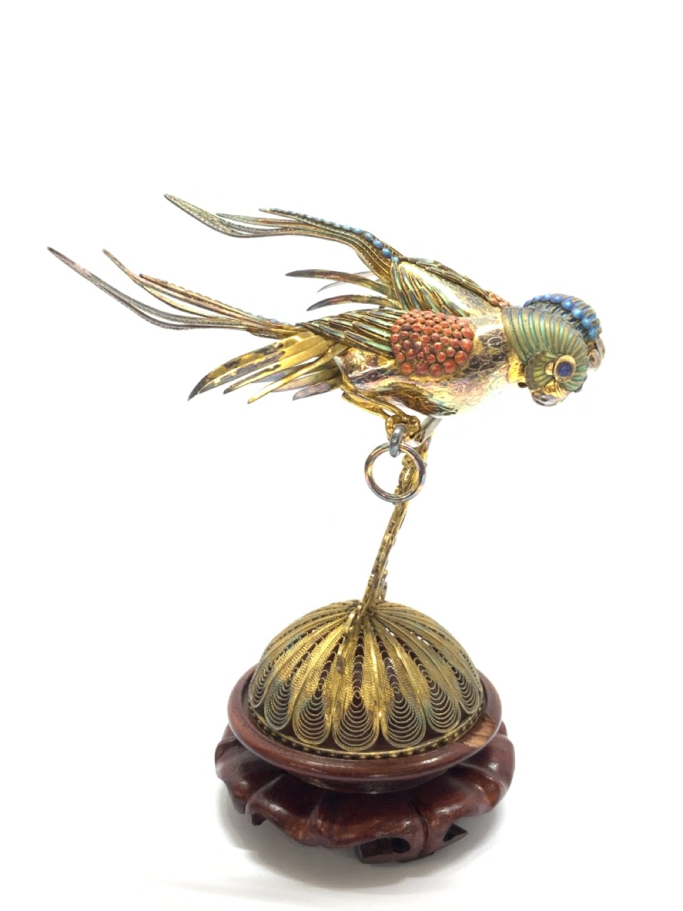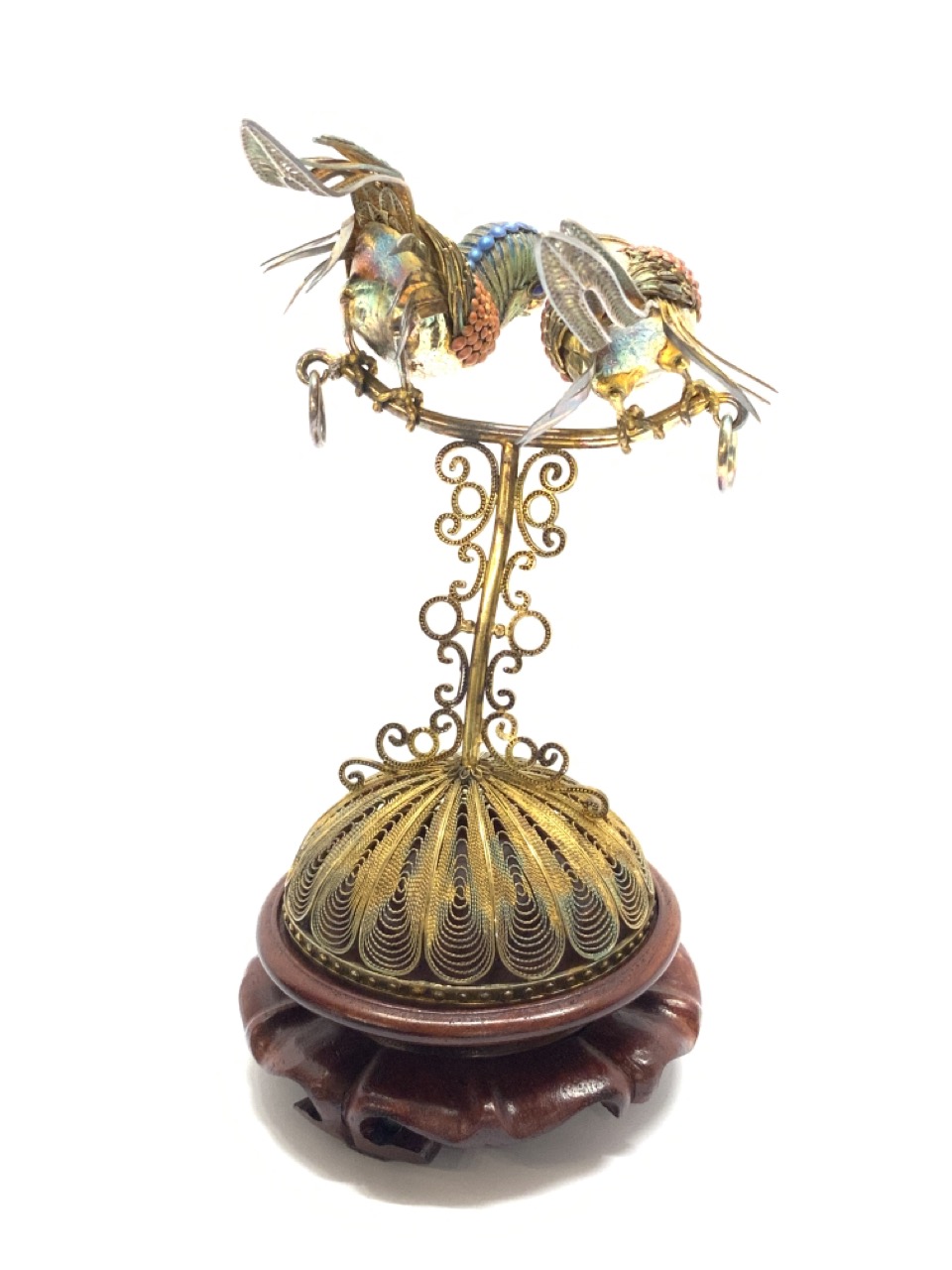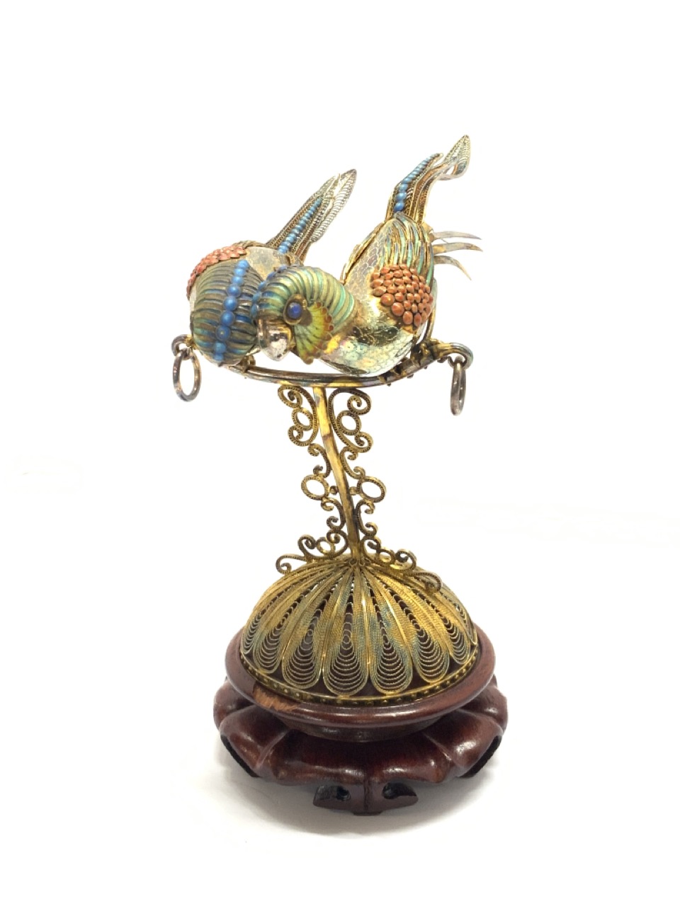 Chinese enameled silver and vermeil birds.