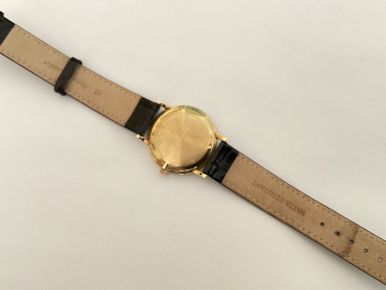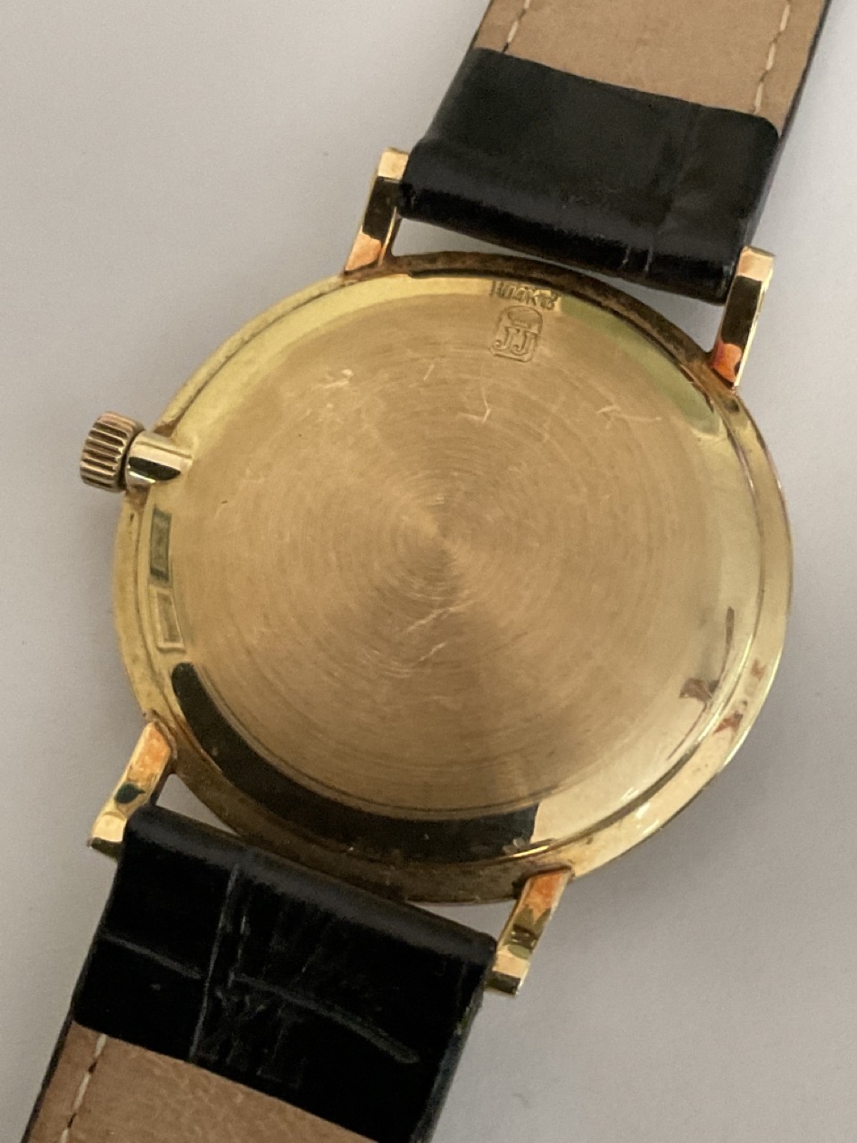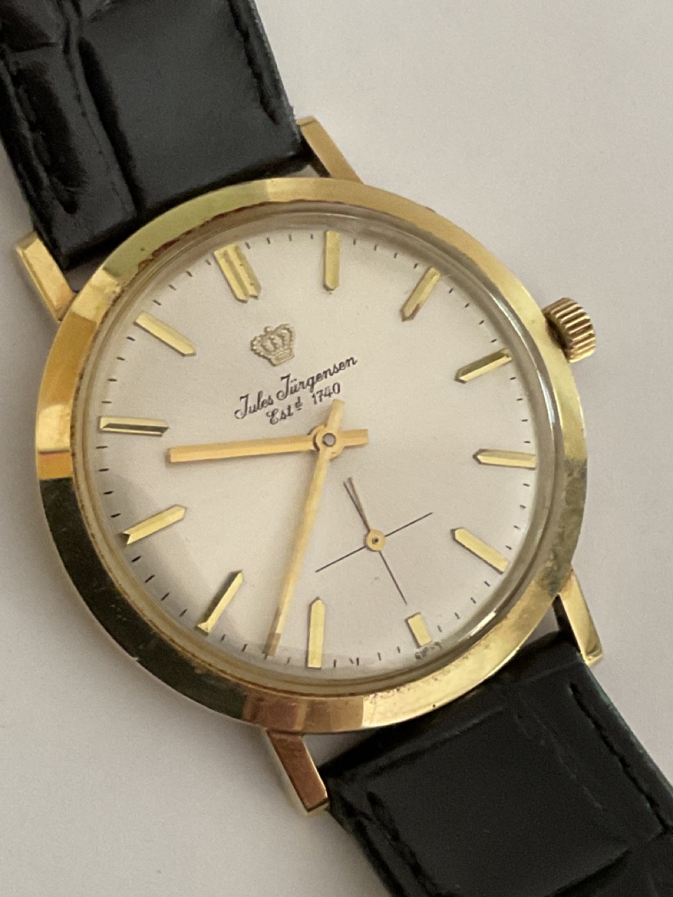 Julese Jorgenson 14k yellow gold men's wristwatch with leather band.