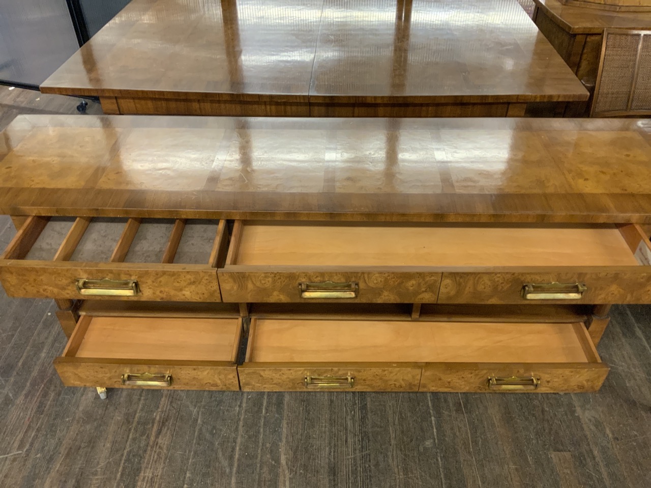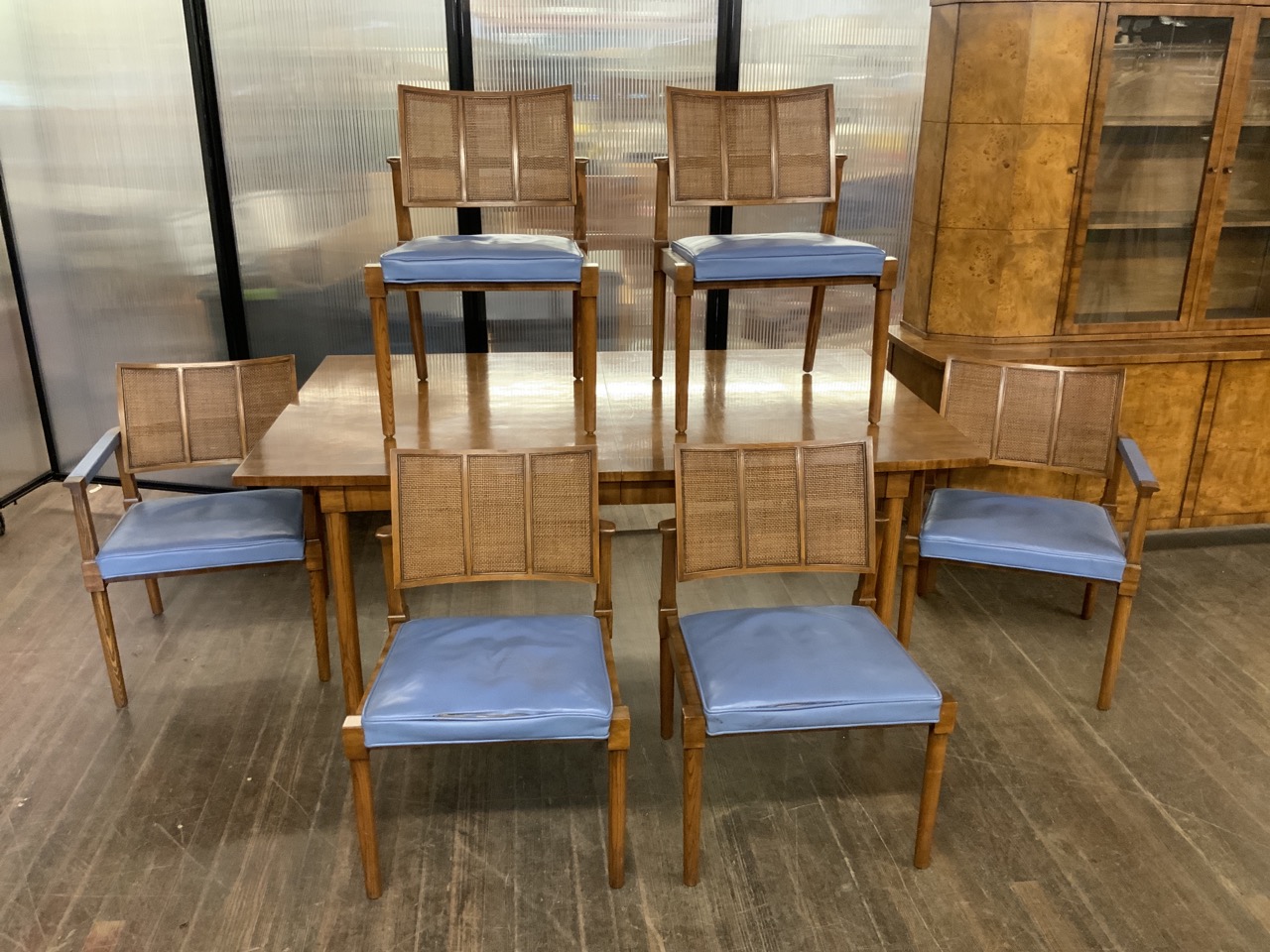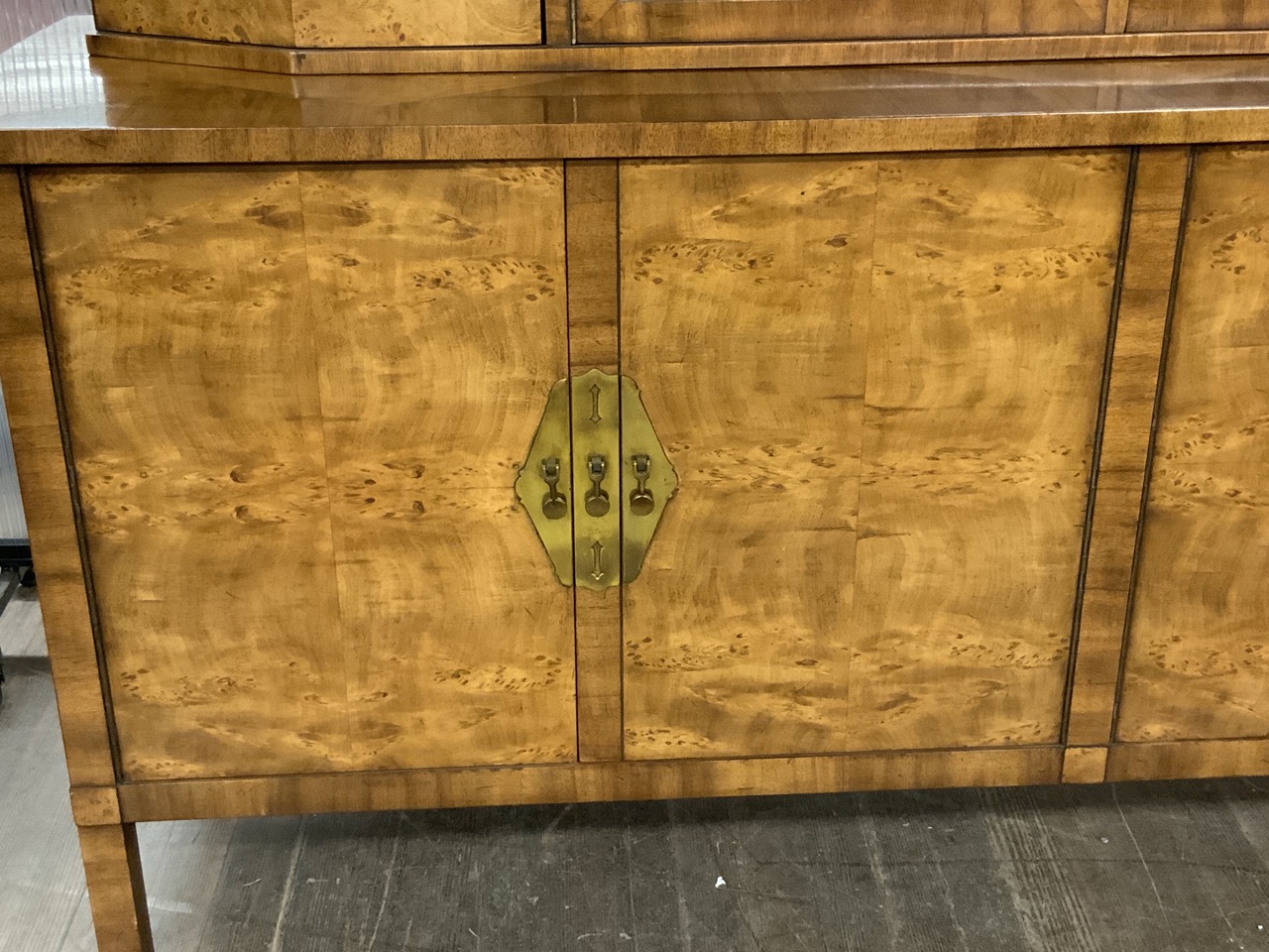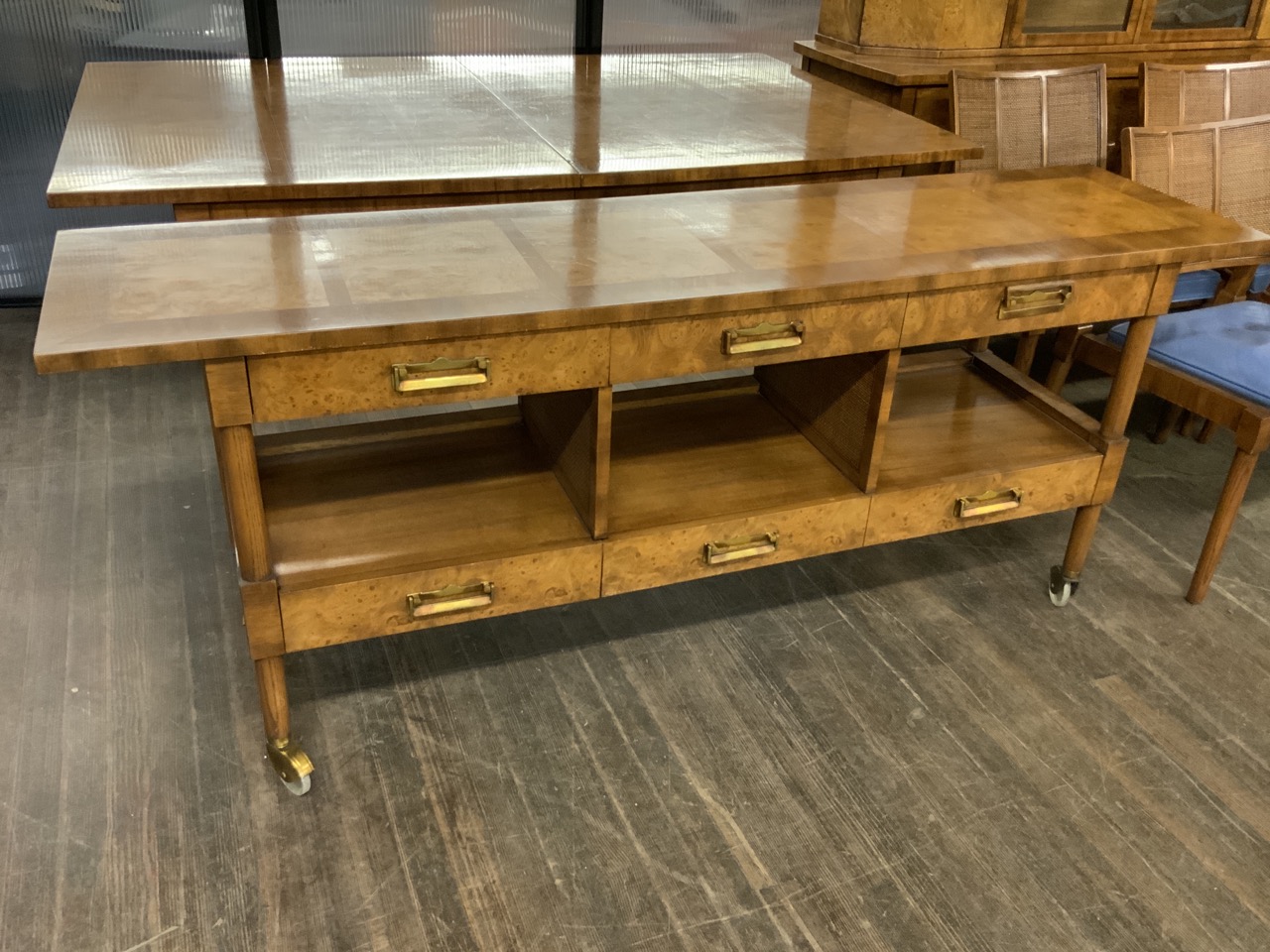 Hollywood Regency Mastercraft dining room suite. Breakfront, Credenza, Table with six chairs. Burlwood veneered tops. Very fine condition.