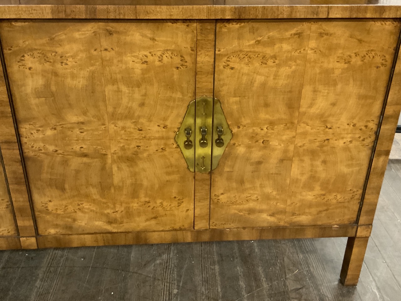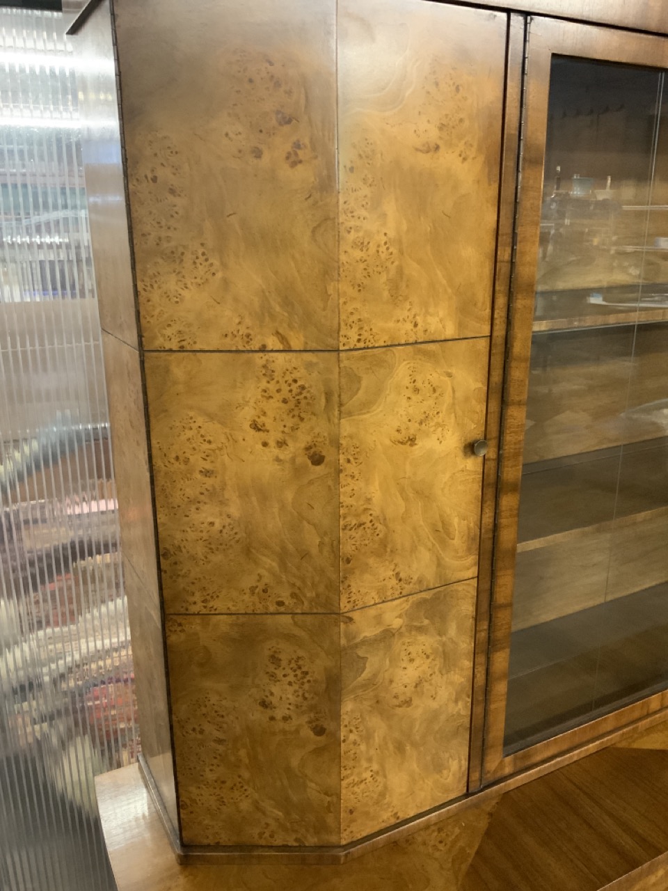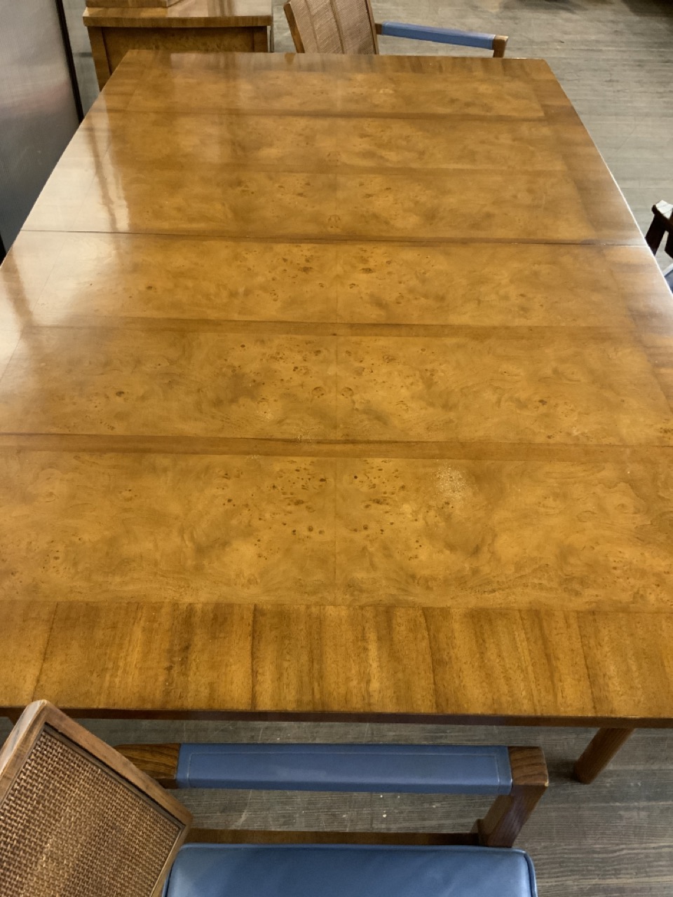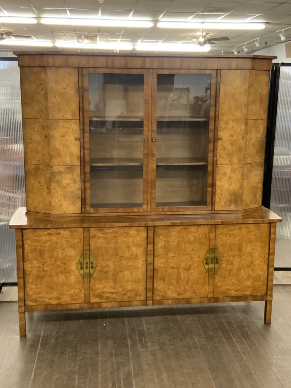 Hollywood Regency Mastercraft dining room suite. Breakfront, Credenza, Table with six chairs. Burlwood veneered tops. Very fine condition.