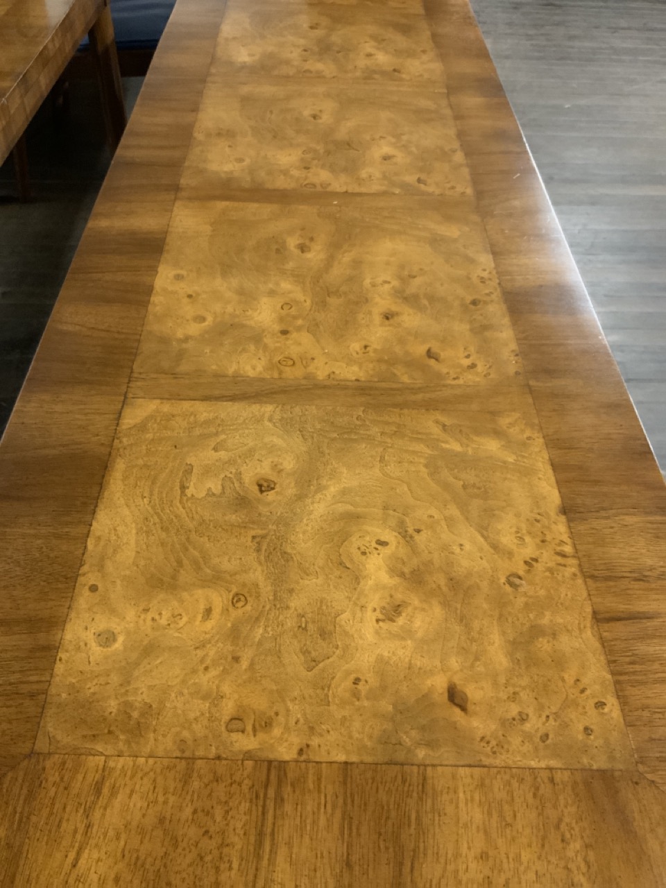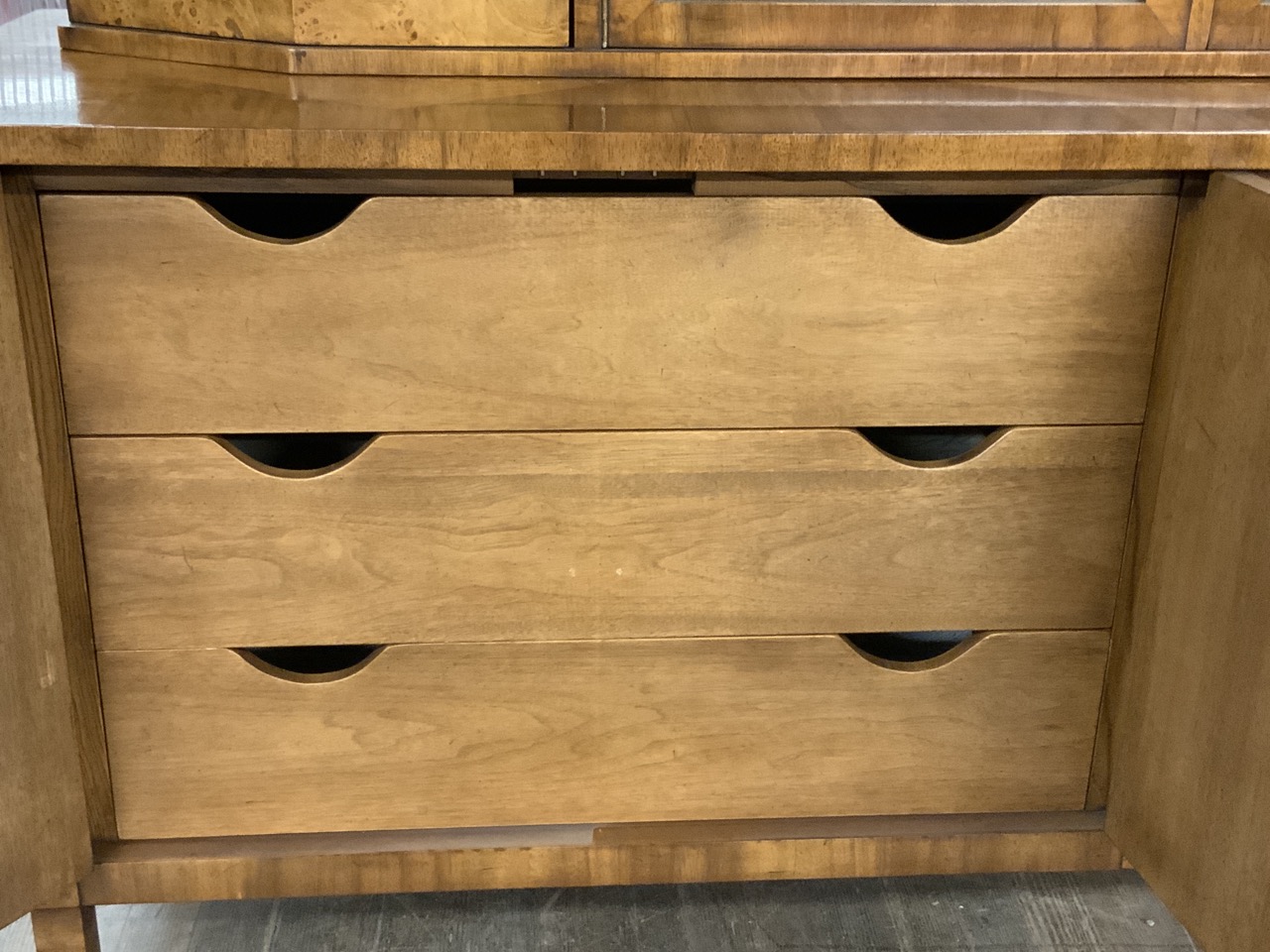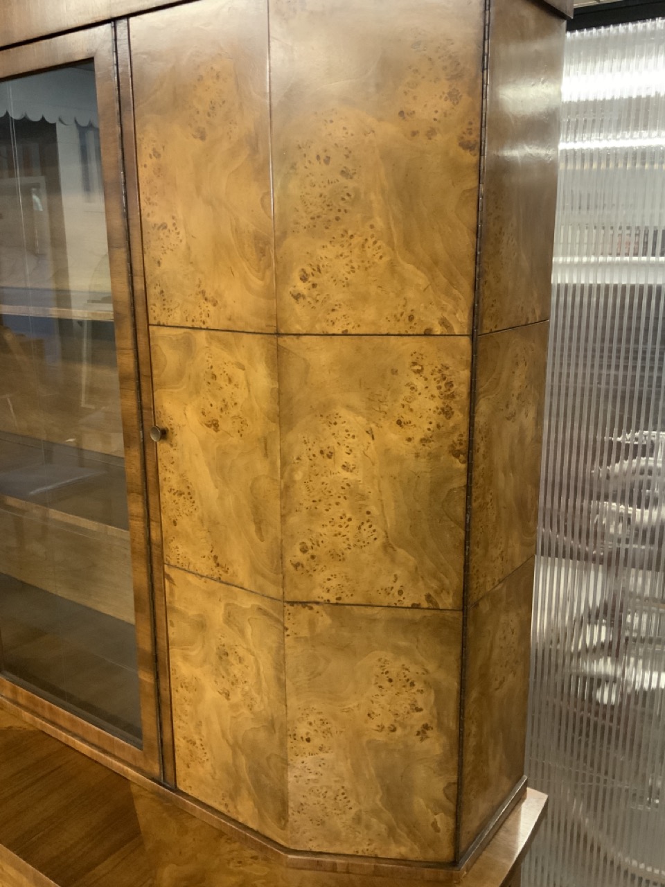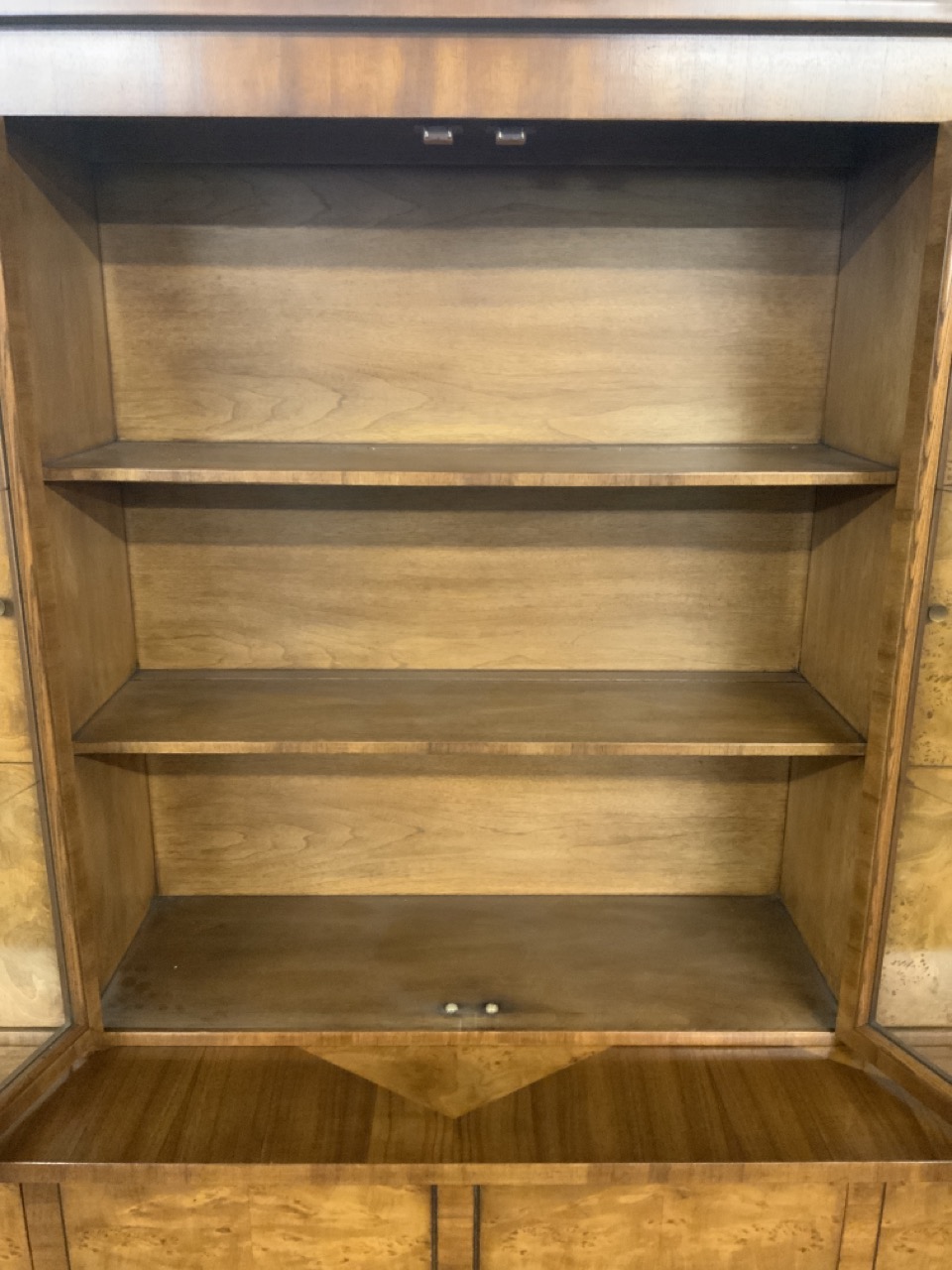 Hollywood Regency Mastercraft dining room suite. Breakfront, Credenza, Table with six chairs. Burlwood veneered tops. Very fine condition.