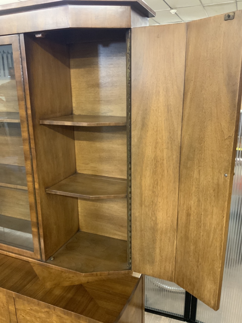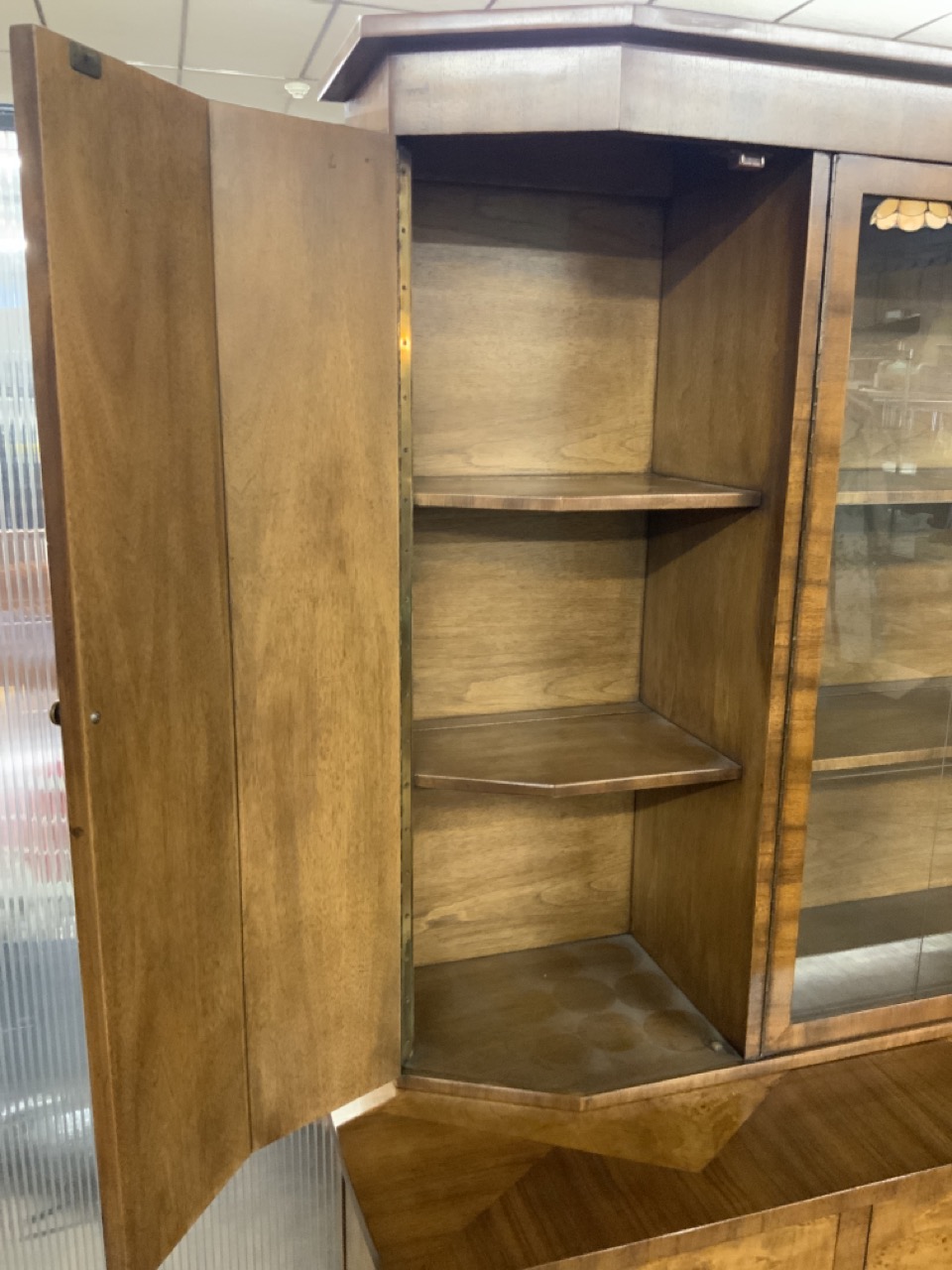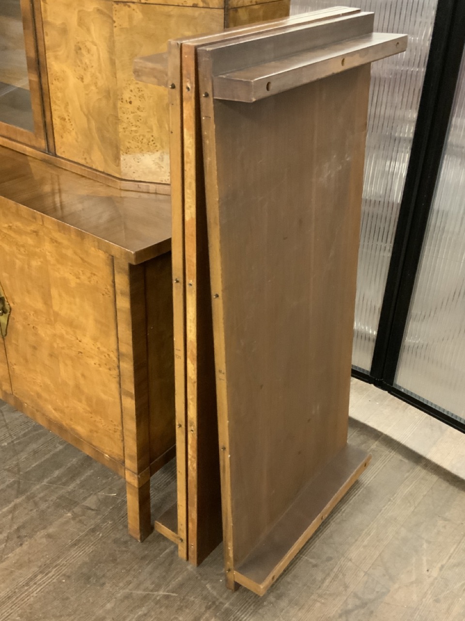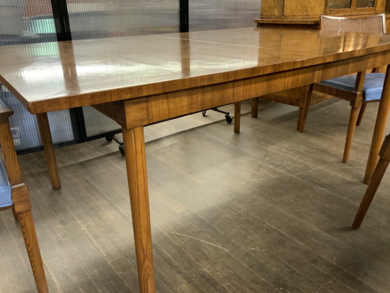 Hollywood Regency Mastercraft dining room suite. Breakfront, Credenza, Table with six chairs. Burlwood veneered tops. Very fine condition.