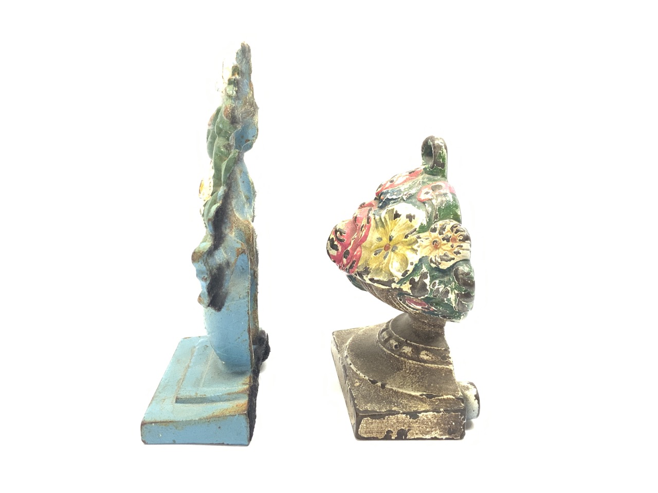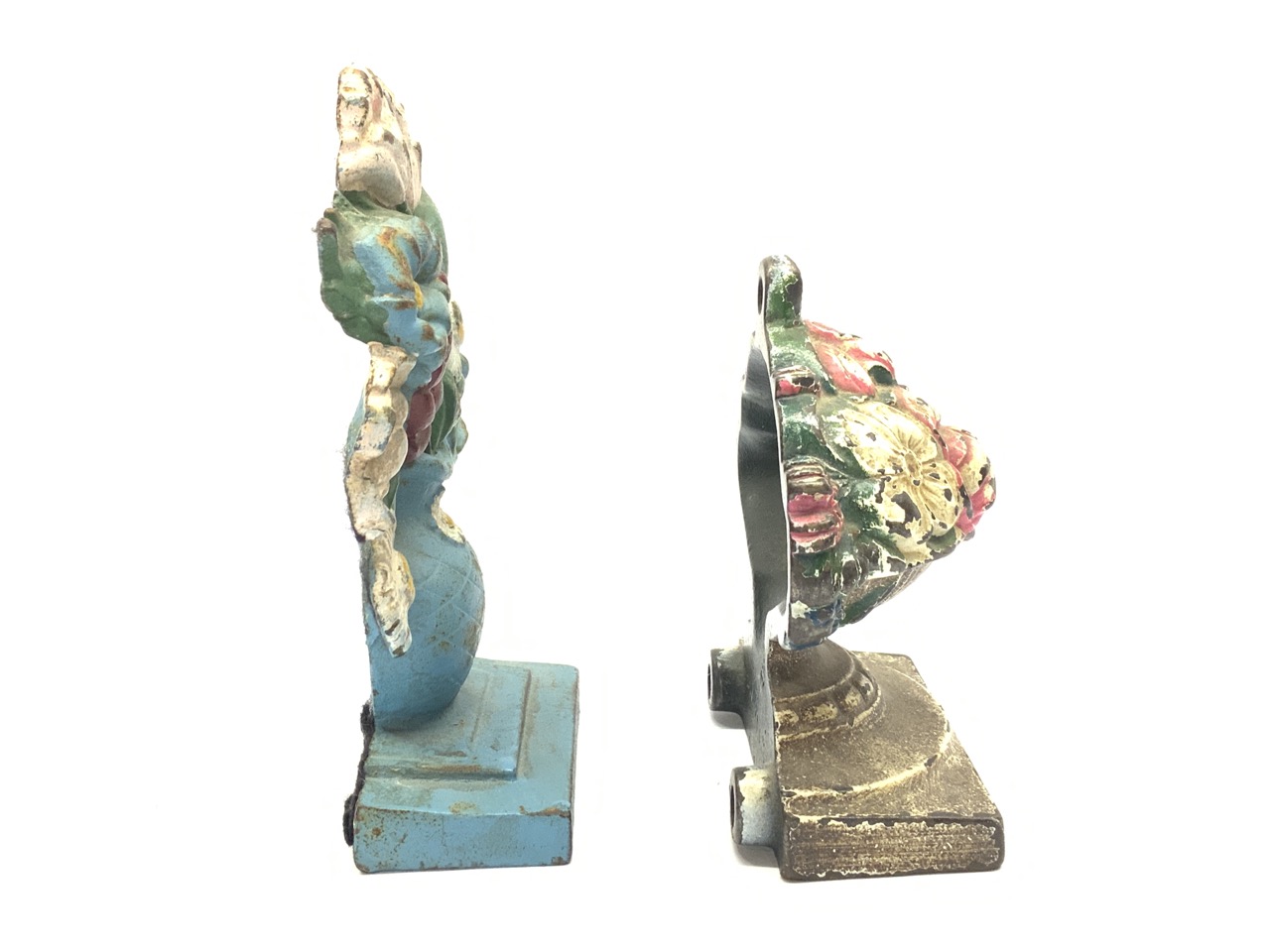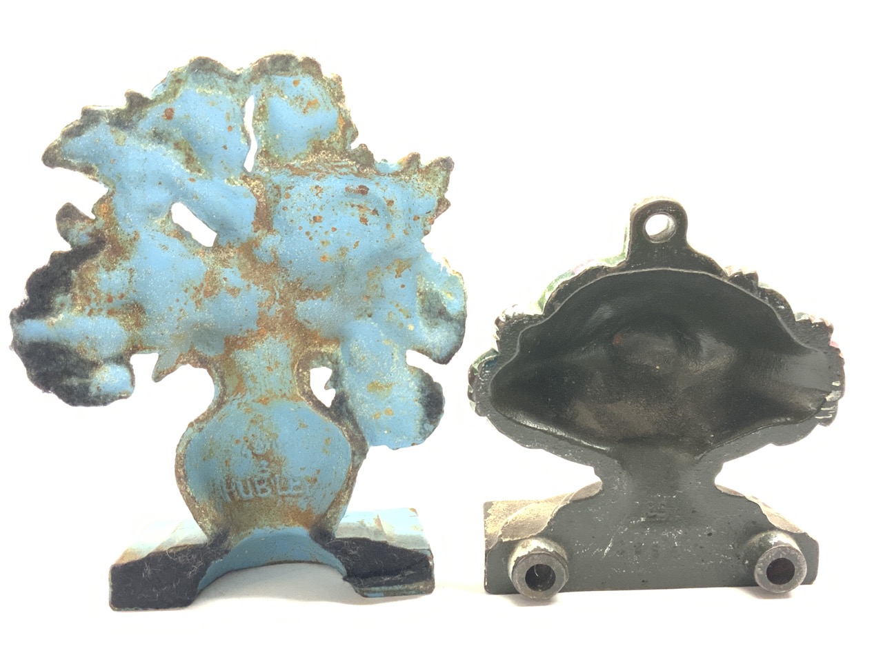 Two (2) Cast iron flower doors stops signed.