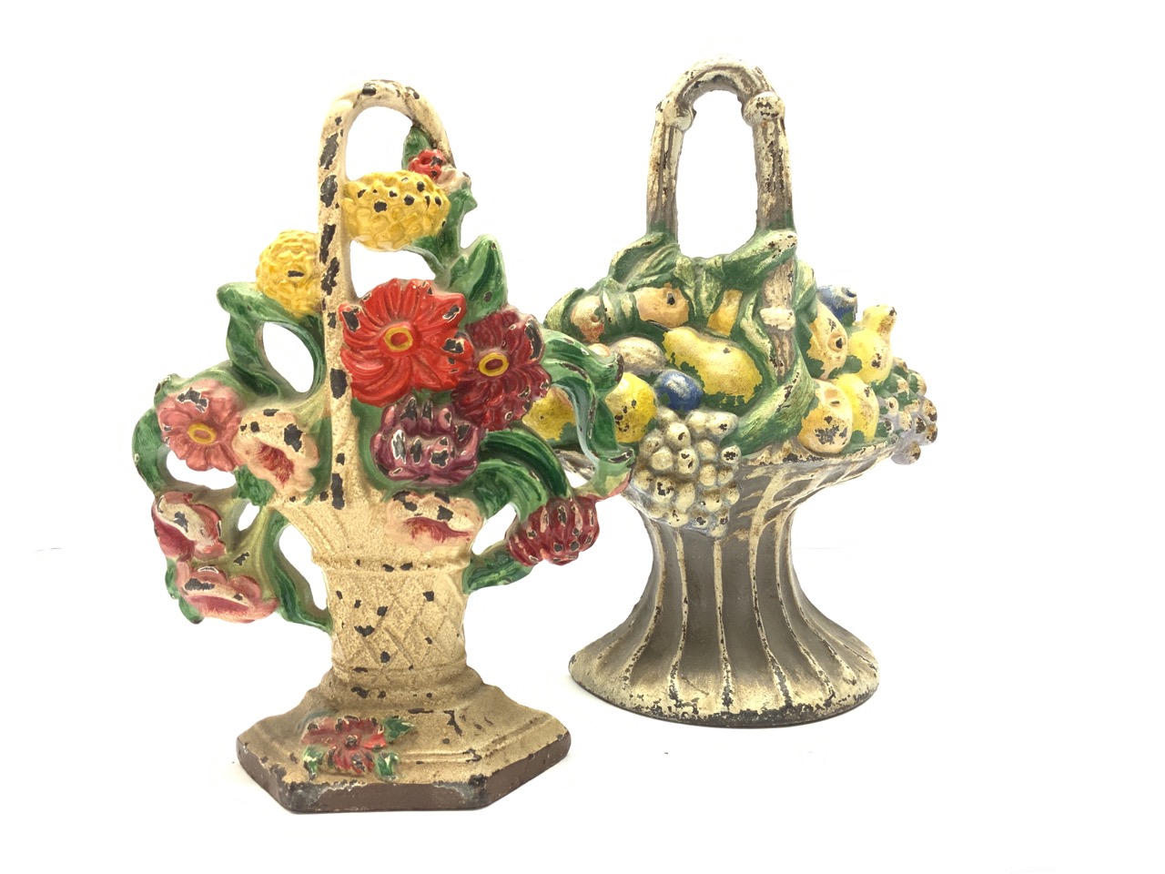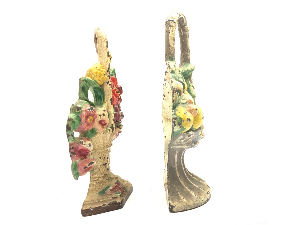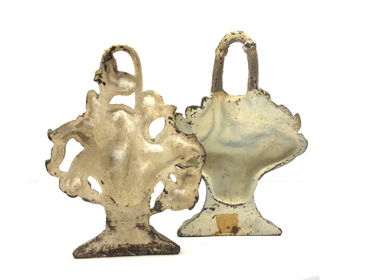 Two (2) Antique cast iron floral basket bouquet door stops.
