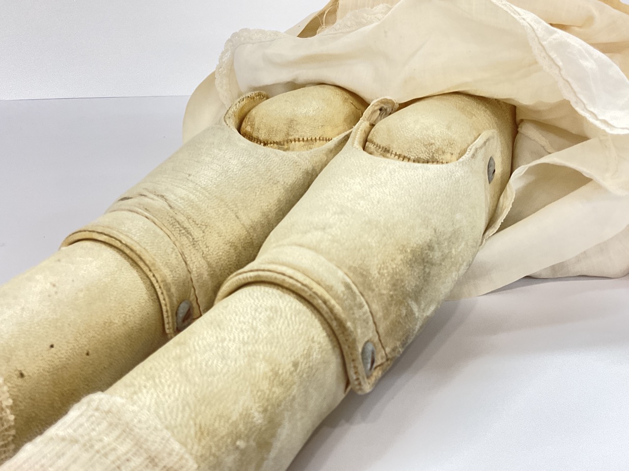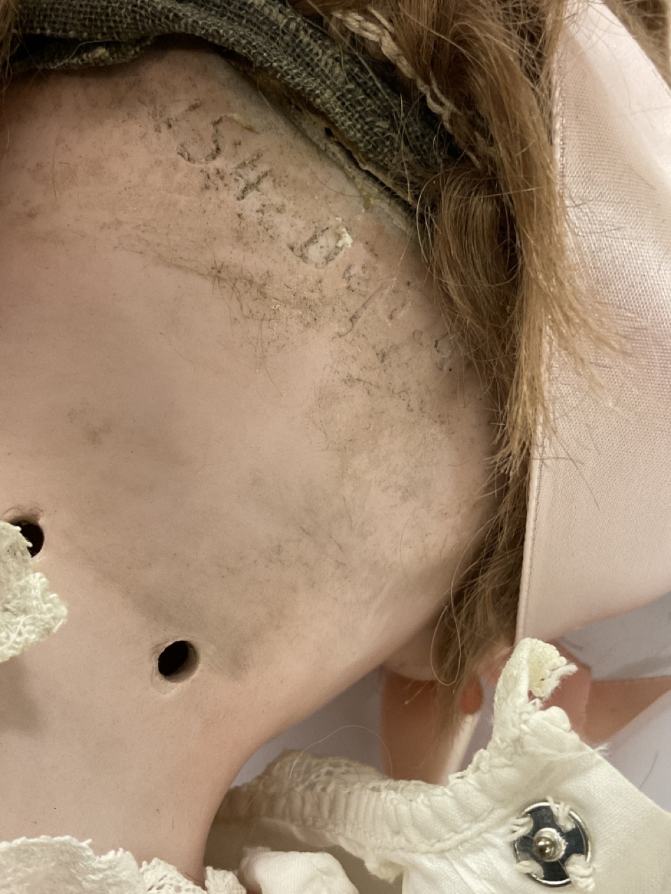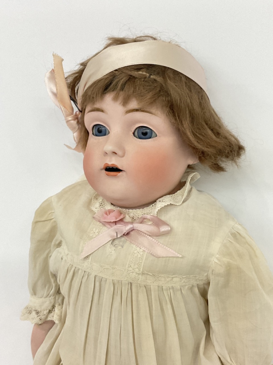 A German bisque doll with kid leather body. Overall appearing all original. Marked DEP 154 at neck.
