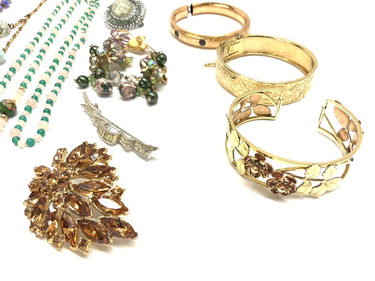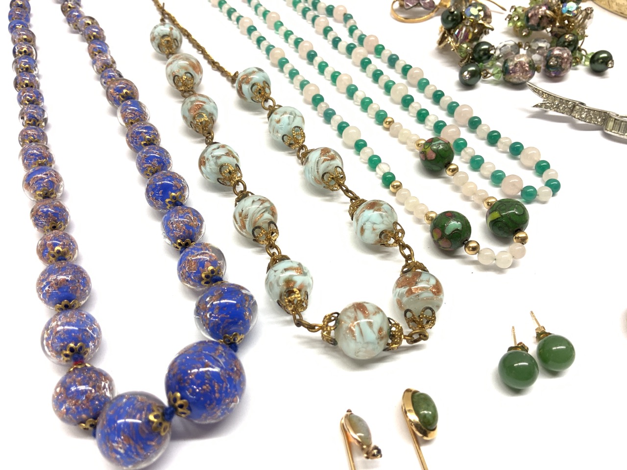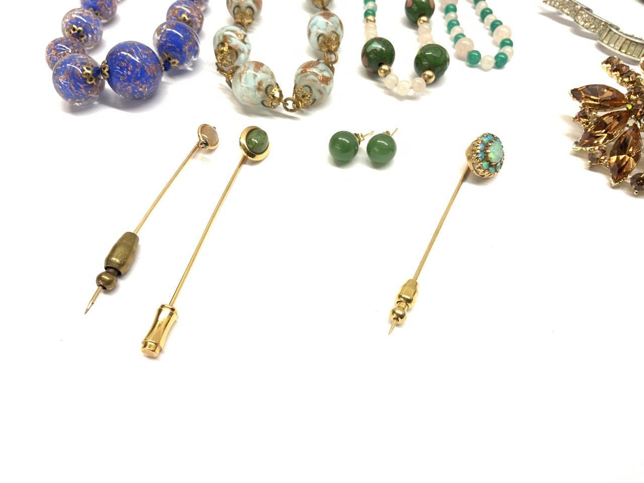 Assorted costume jewelry group. Murano, Weiss, Stick Pins, Rhinestones, Bangles etc.