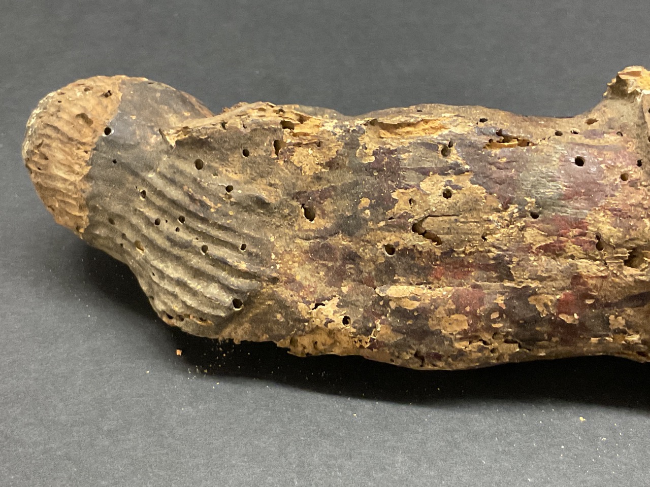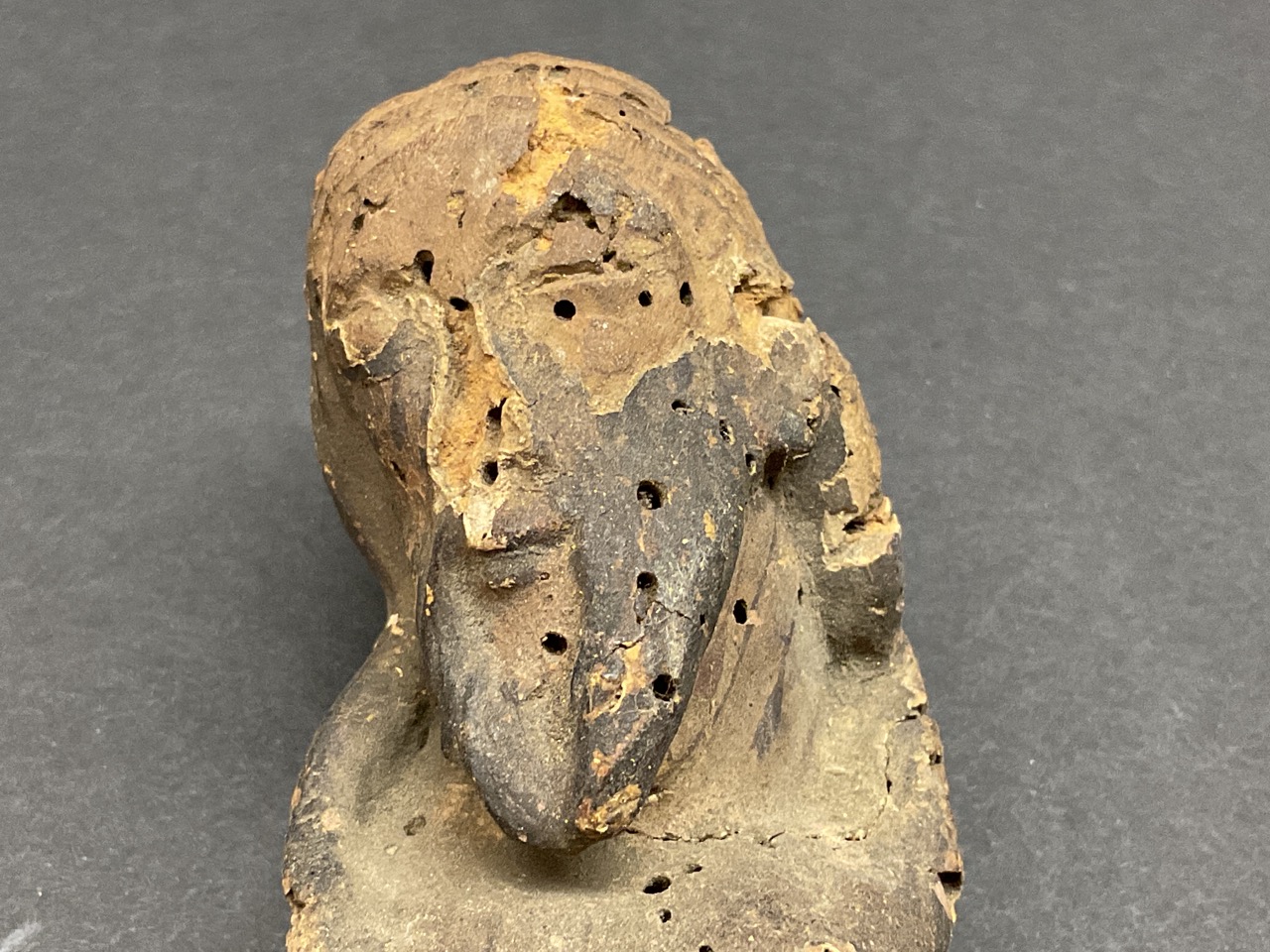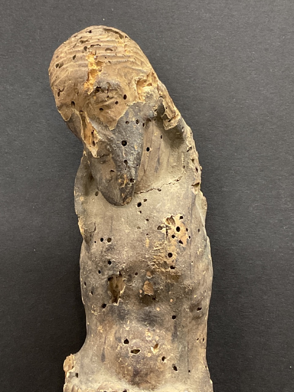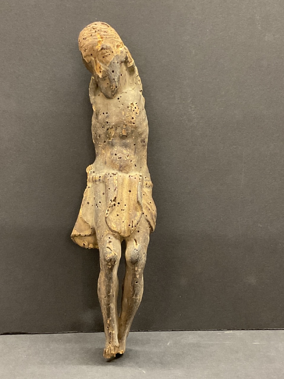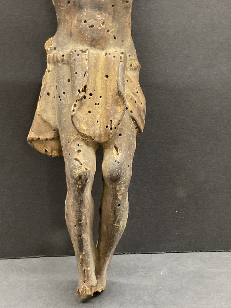 An early probably Spanish Colonial carved wood statue of Jesus originally mounted to a crucifix. Faint paint still present. Many worm holes as seen in photograph preview.