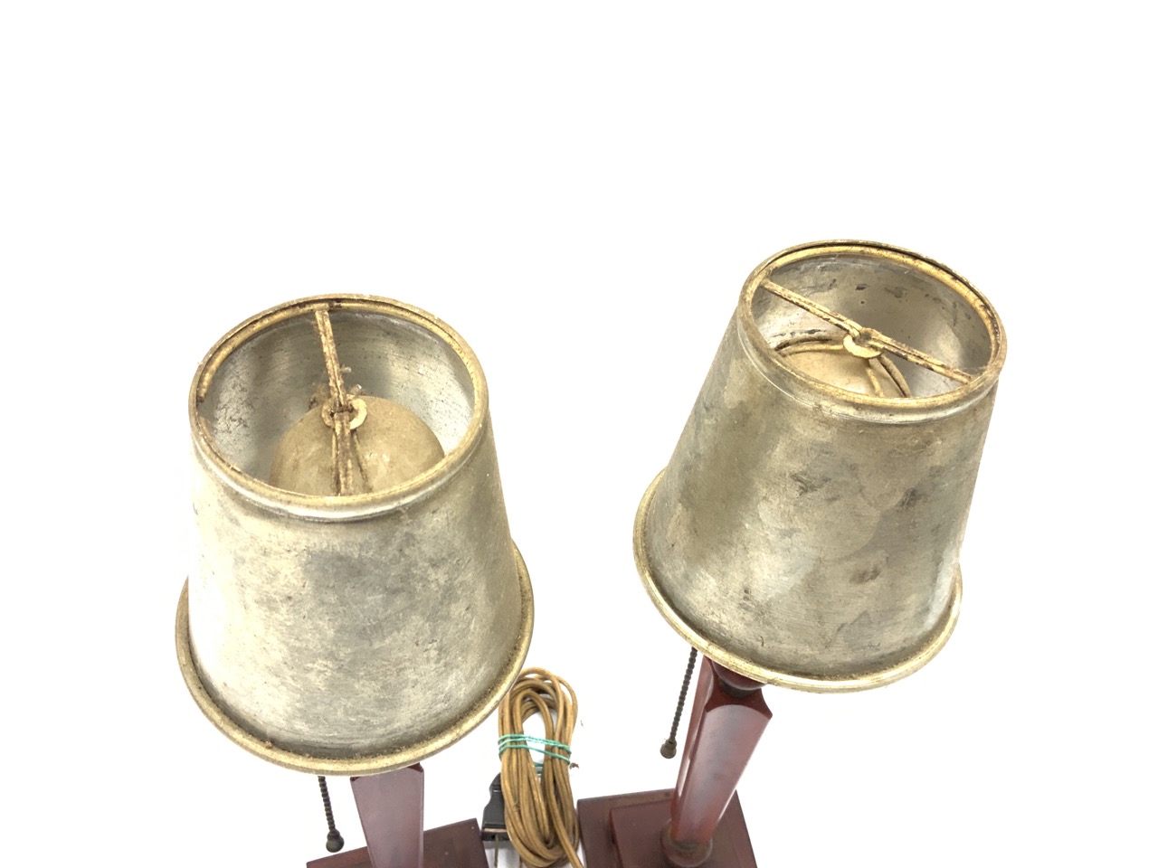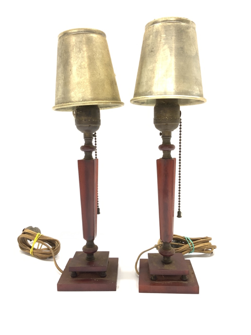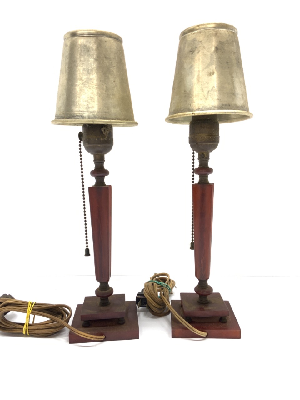 A pair of cherry bakelite boudoir lamps with tin shades.