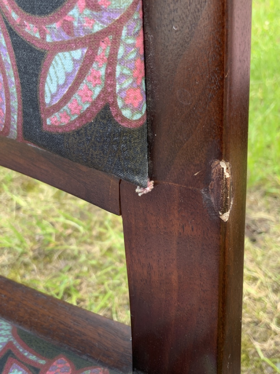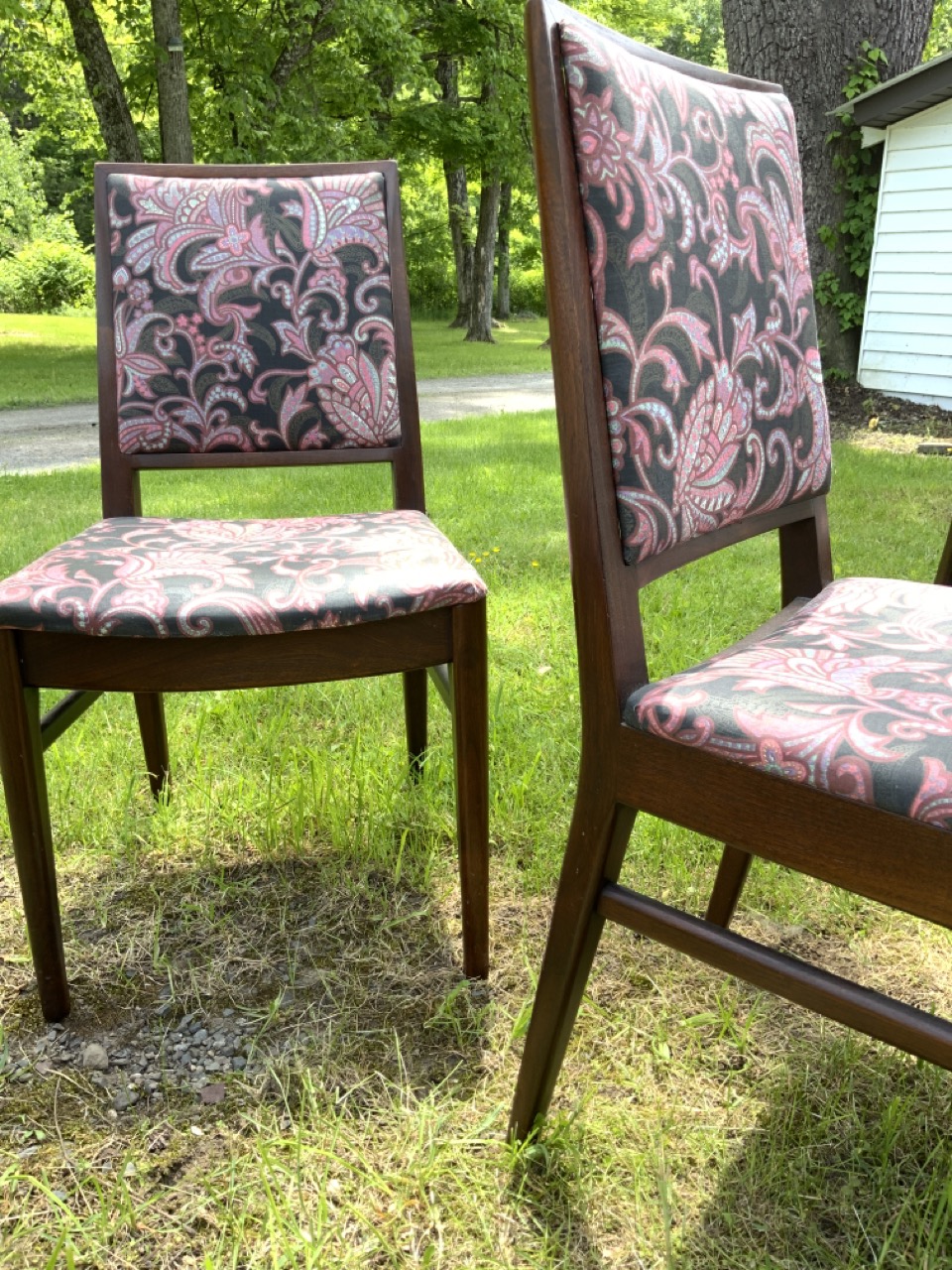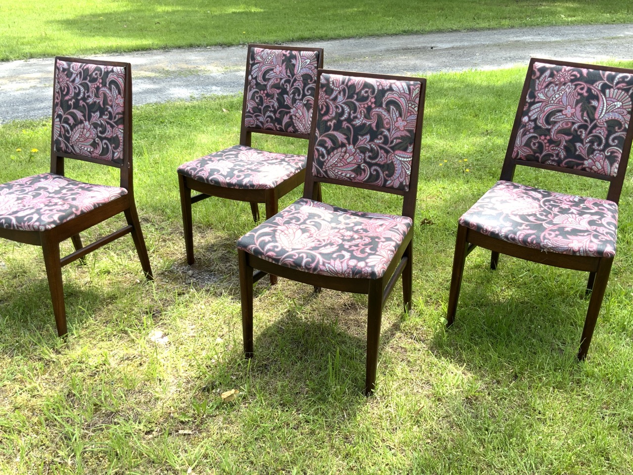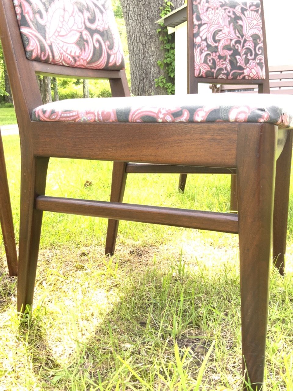 Later fabric coverings, easy to change. Very good condition. Solid chairs, some wear as seen in photograph preview. No damage or repaired legs.