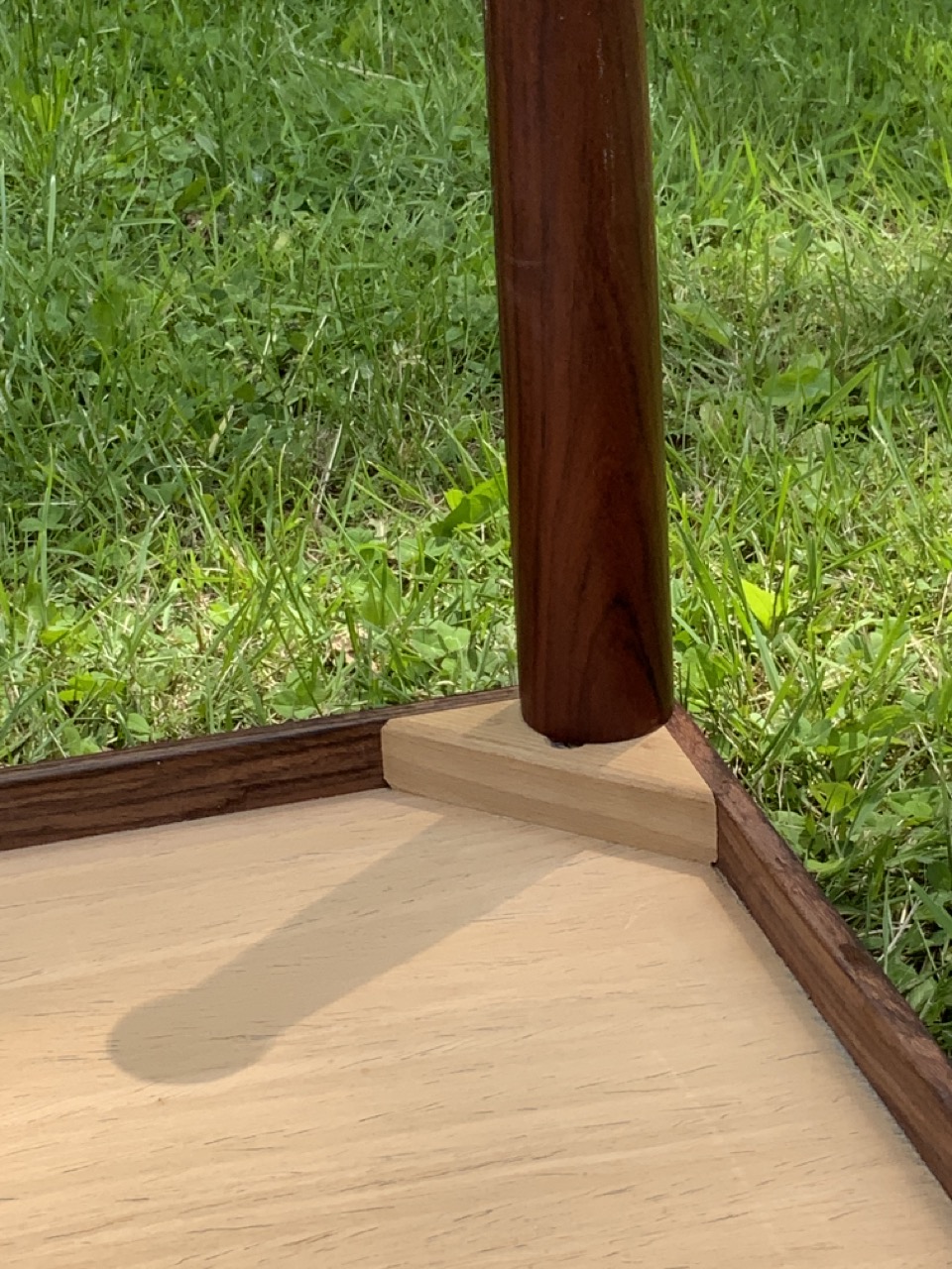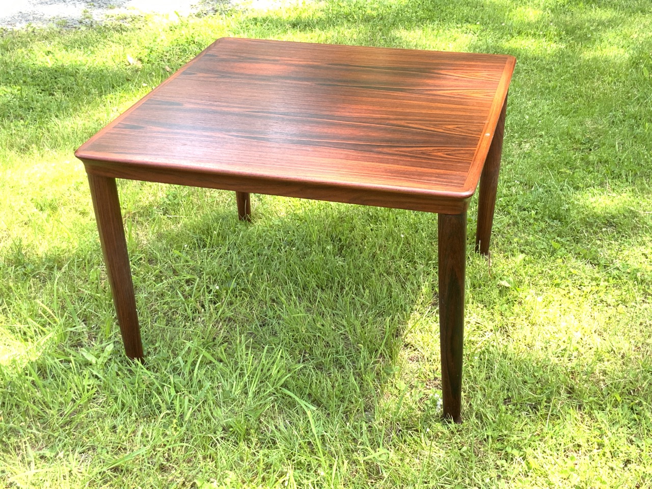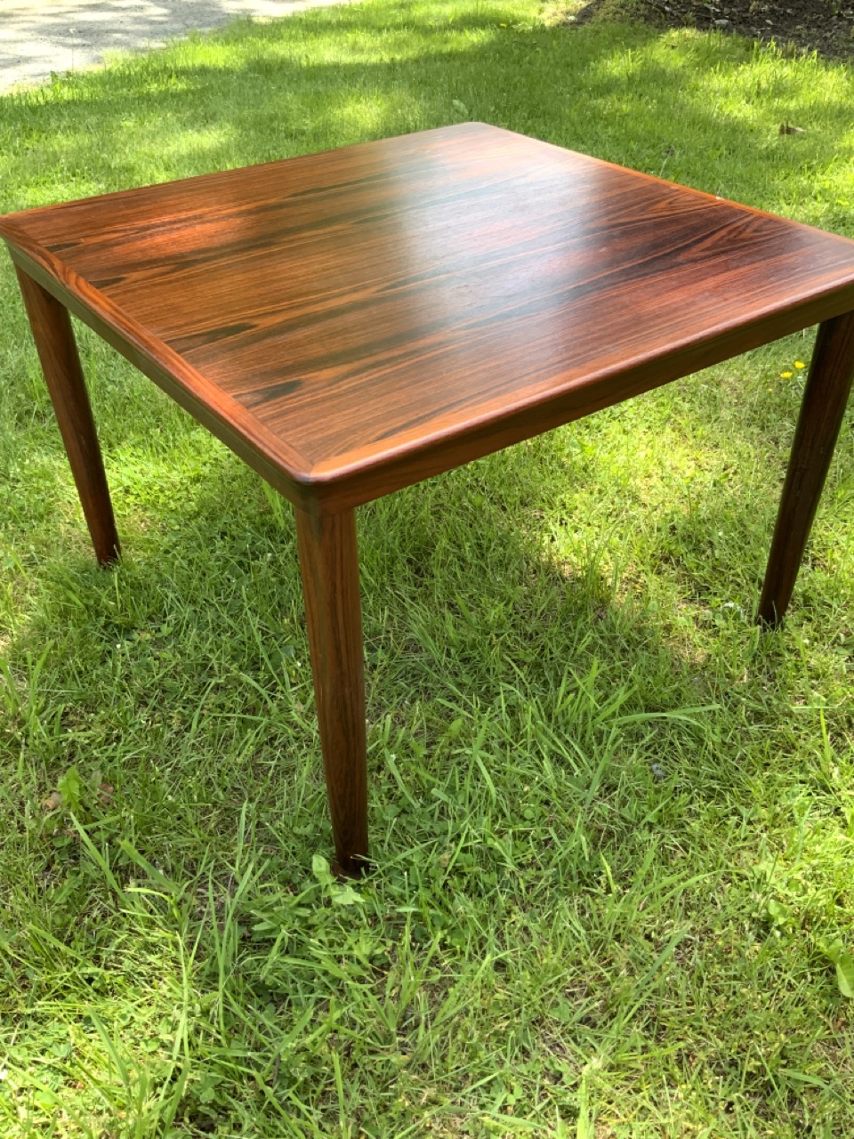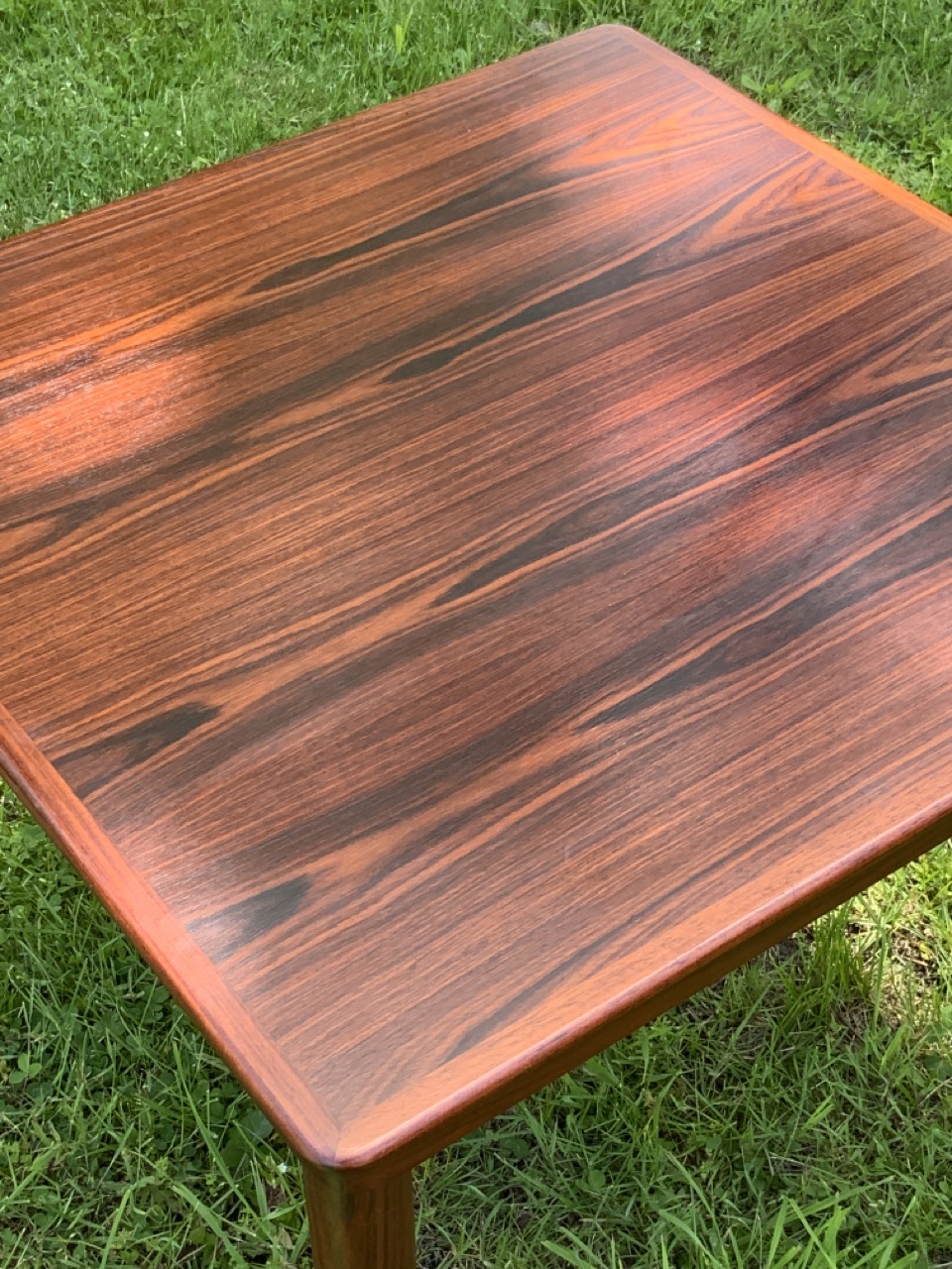 Vejle , Denmark rosewood side table. One table leg block piece of wood needs repairs. No damage to leg, easy repairs. Please see photograph preview or call.