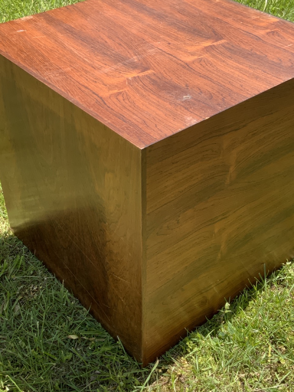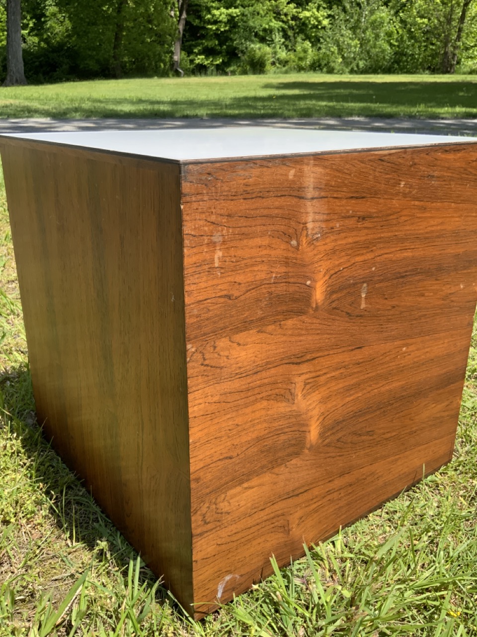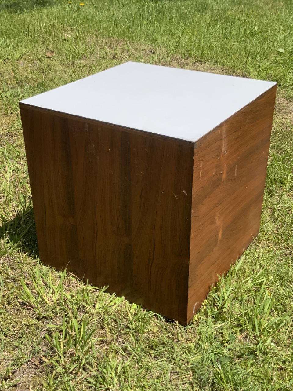 Rosewood square cube table. Unsigned. White formica top.