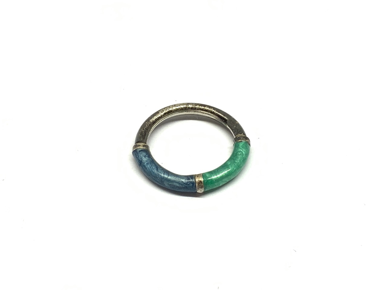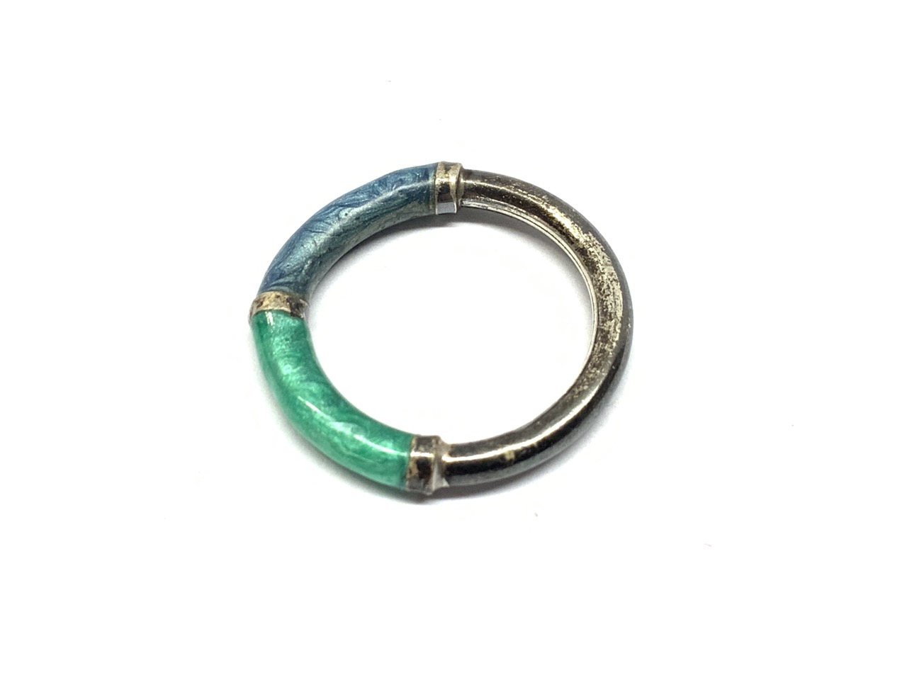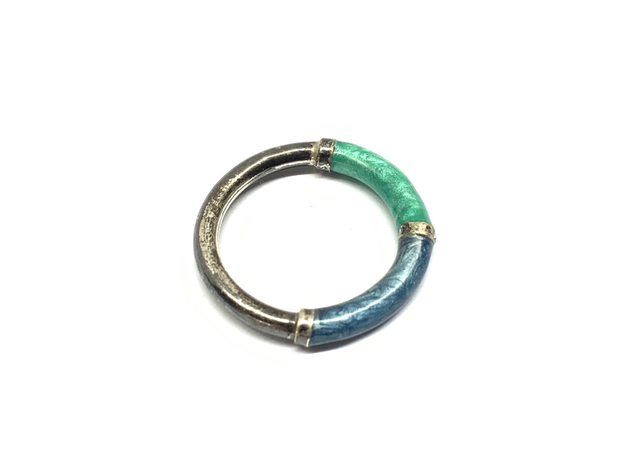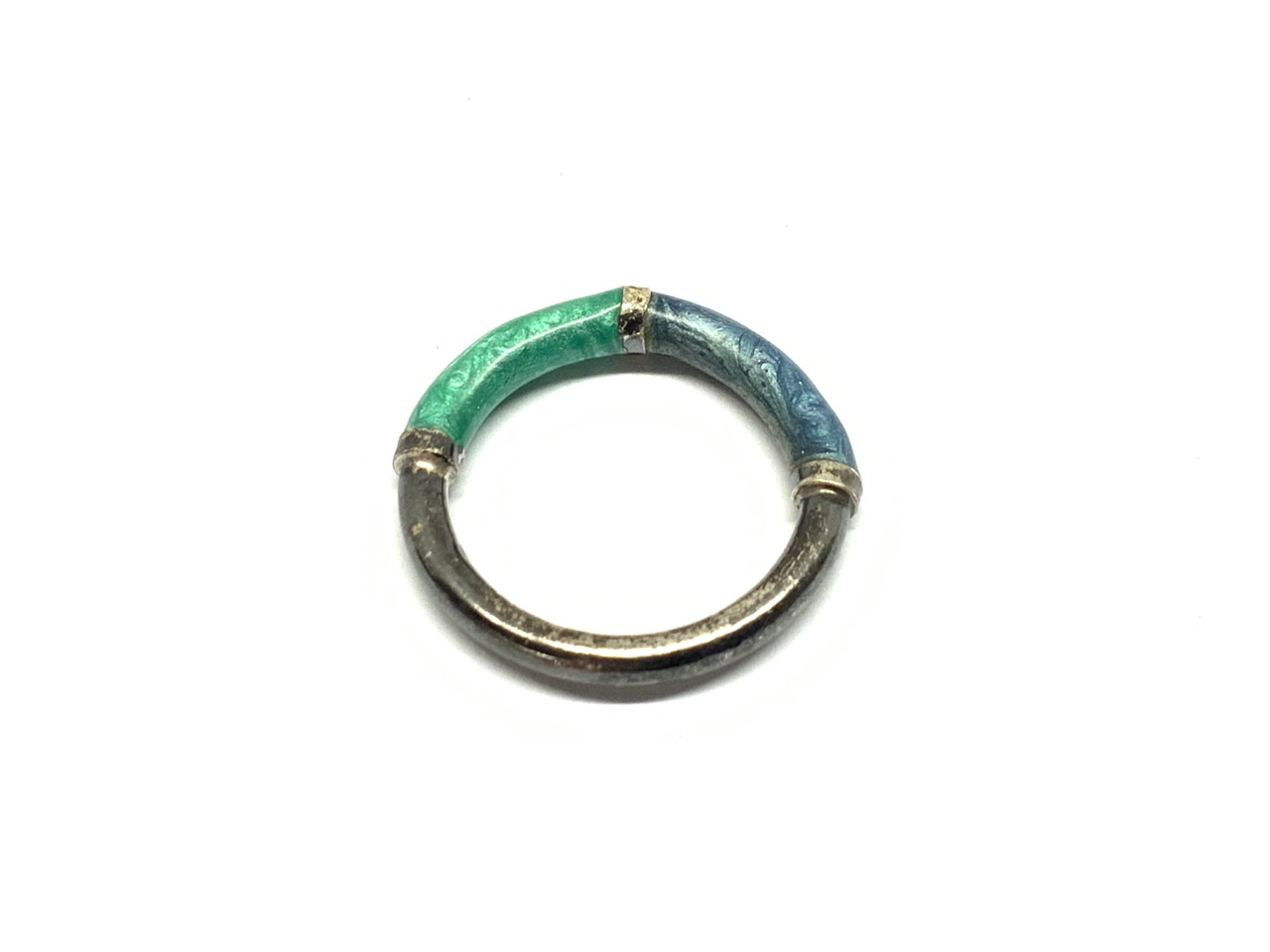 A fine enameled sterling silver ring. Green and blue block enamel.