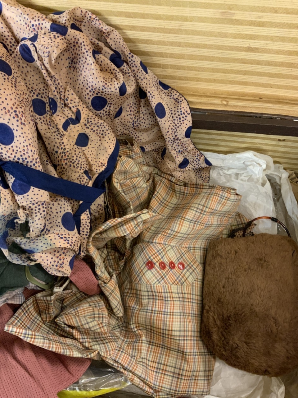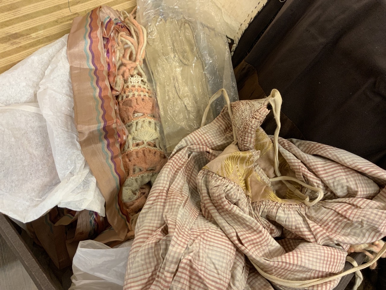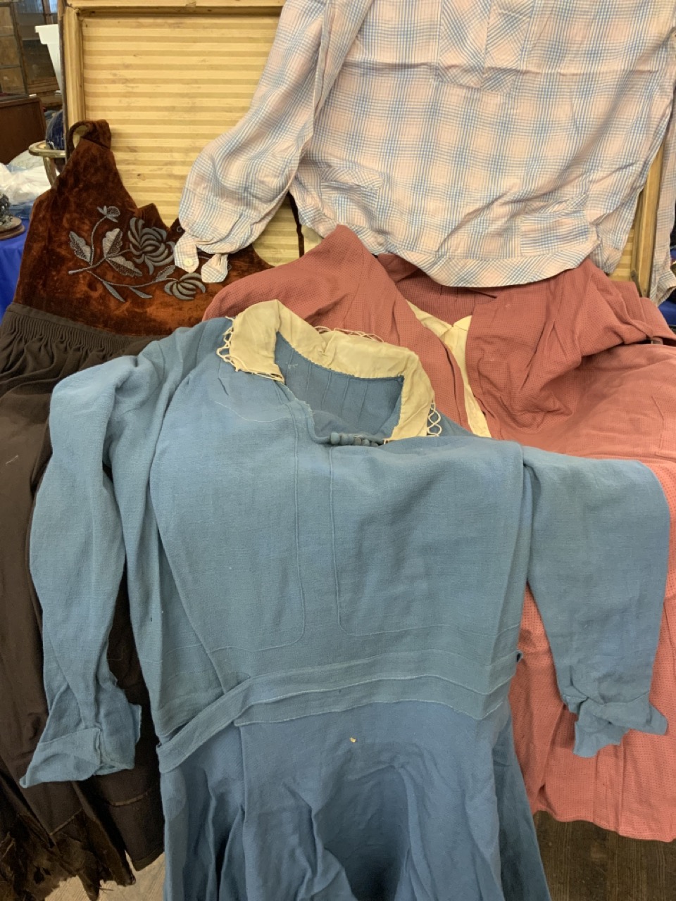 Trunk of early 1900's clothing. 1920's wool dresses, silver embroidered dresses with silver clips, assorted tops etc. Please see photograph preview or call. Sold As Is. Expect damage.
