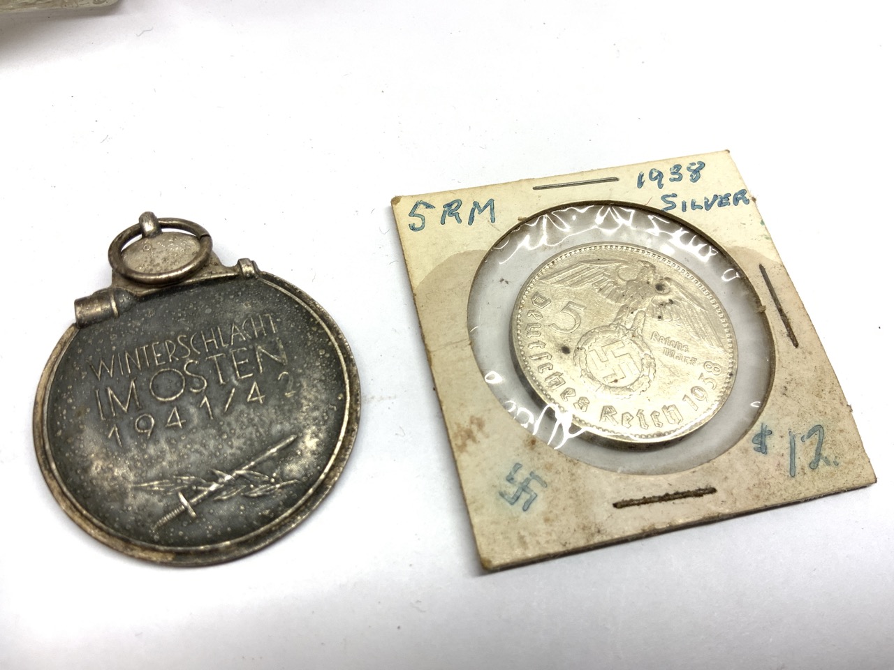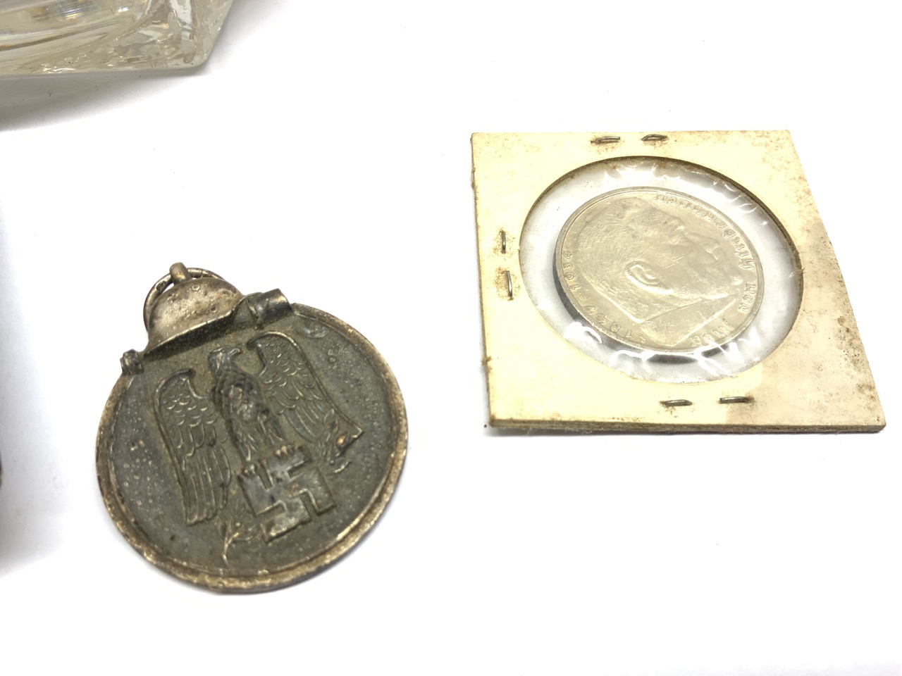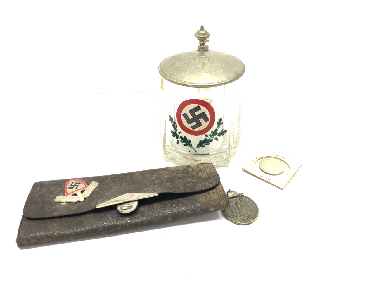 German World War II War Relics. Stein is cracked, Leather pouch for pens, pencils, silver coin and medal. As seen in photograph preview.