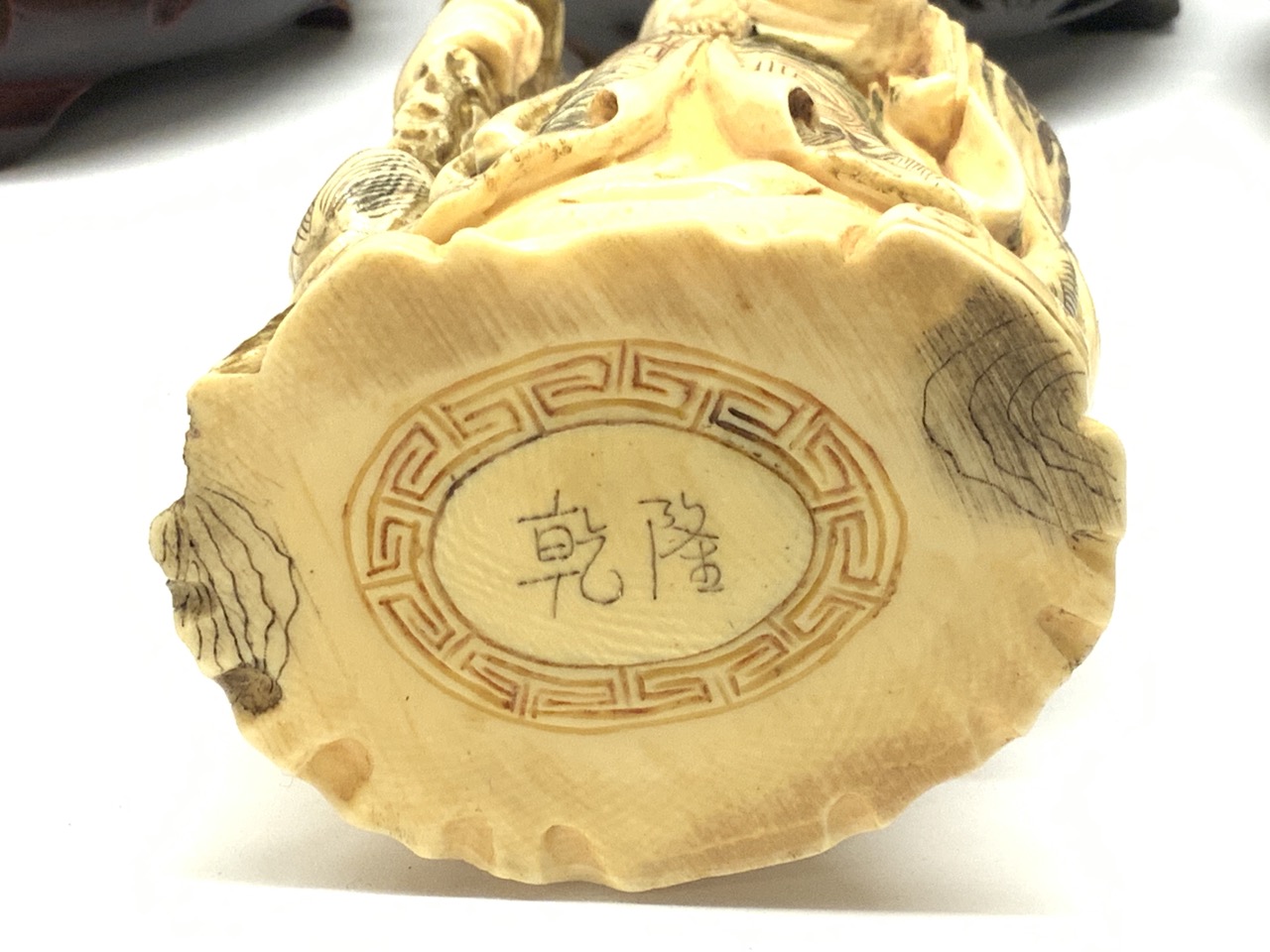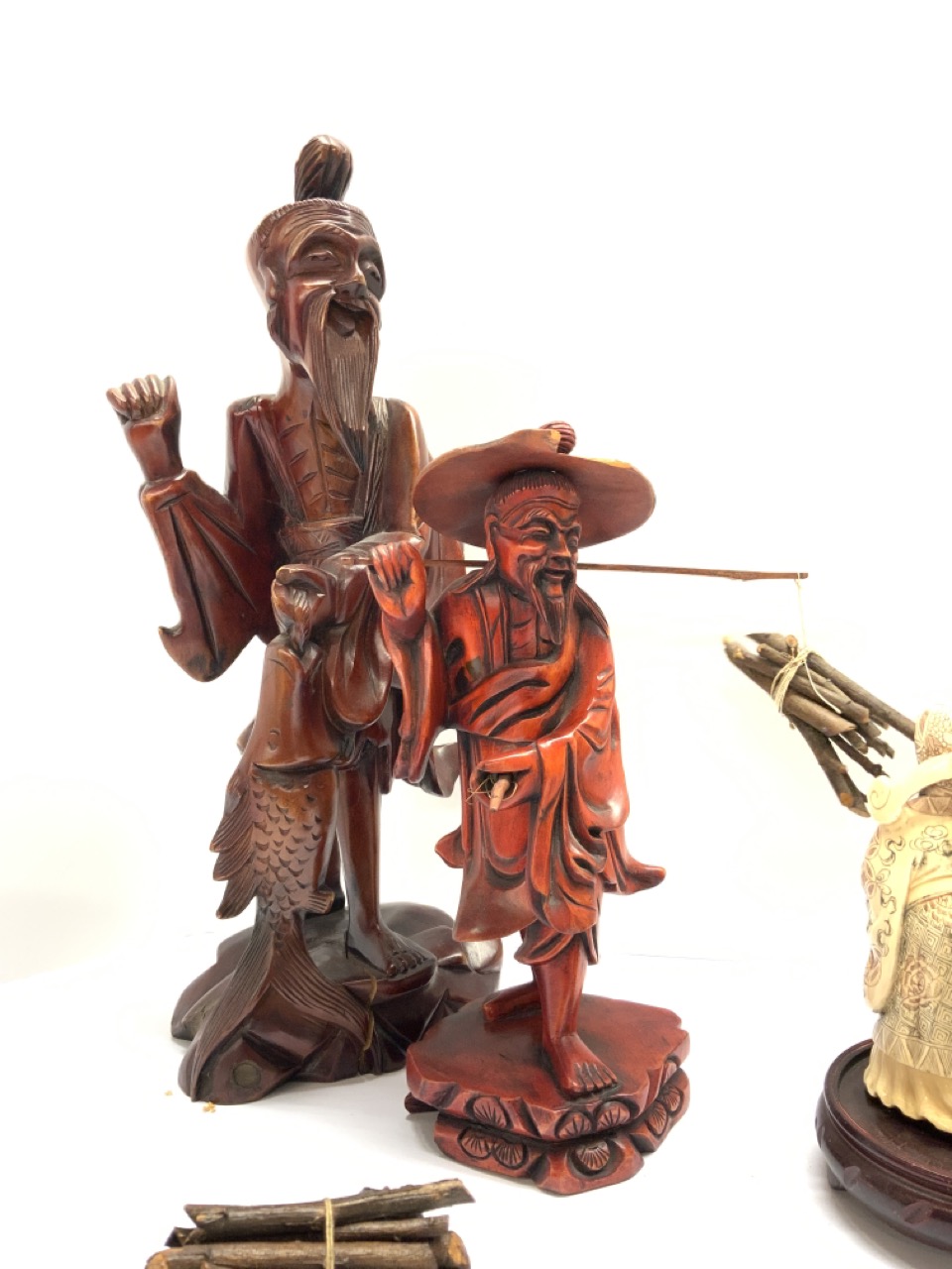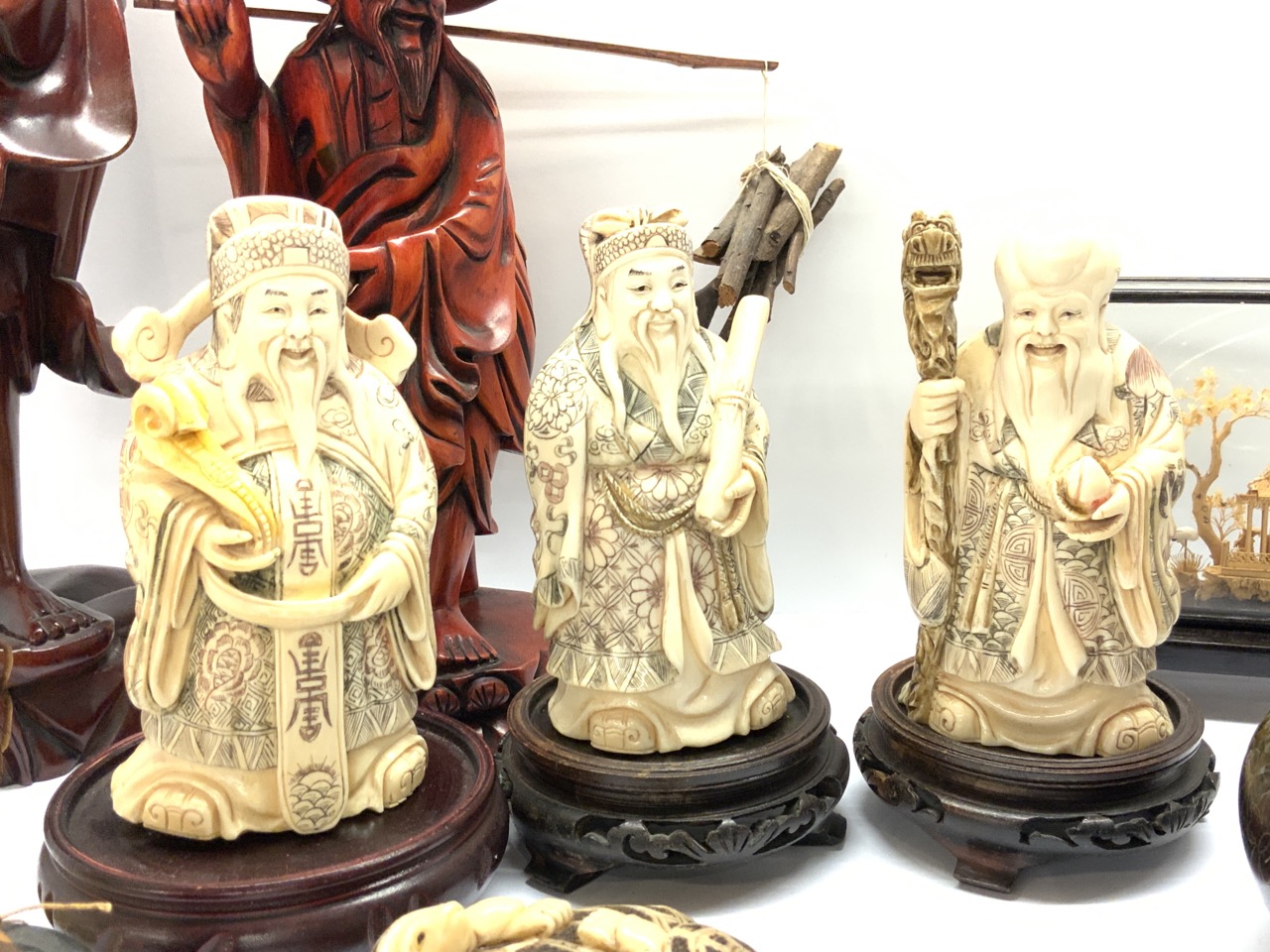 A compiled grouping of Chinese statuary, Buddhas, wood and bone sculptures etc. As seen in photograph preview.