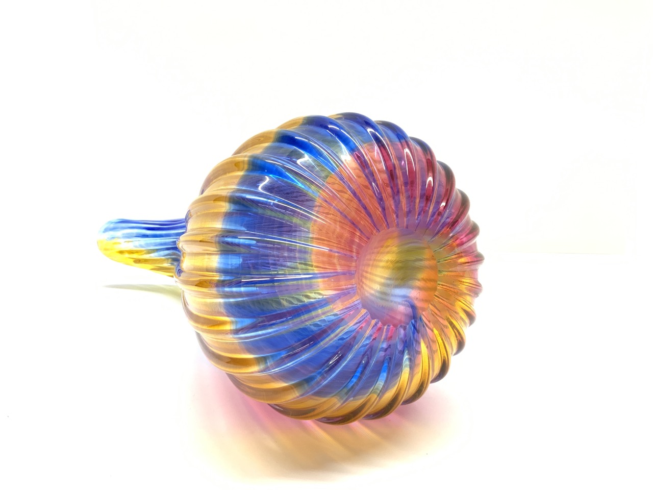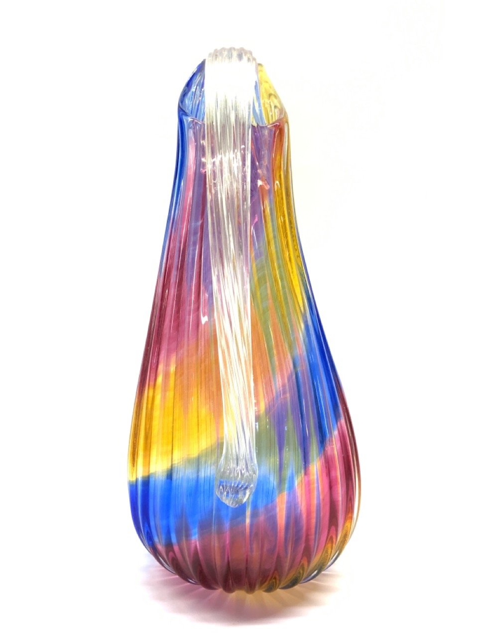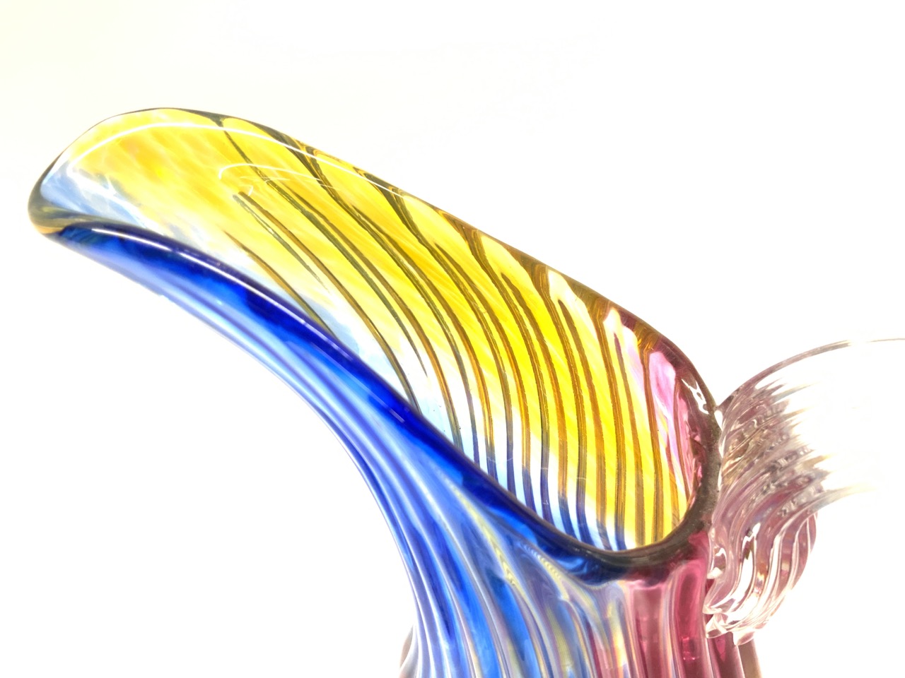 A large studio art glass rainbow water pitcher. Signed illegibly at base.
