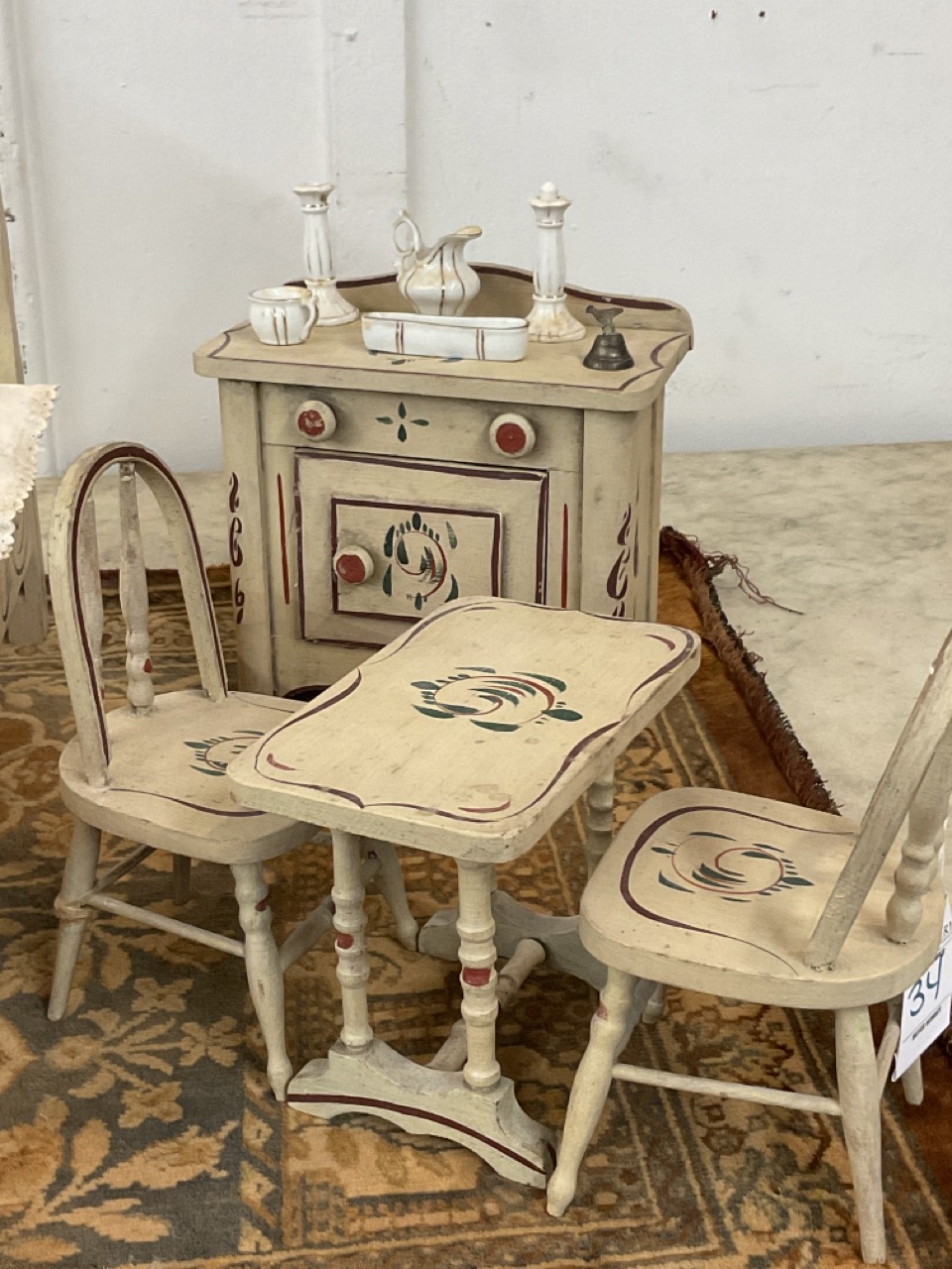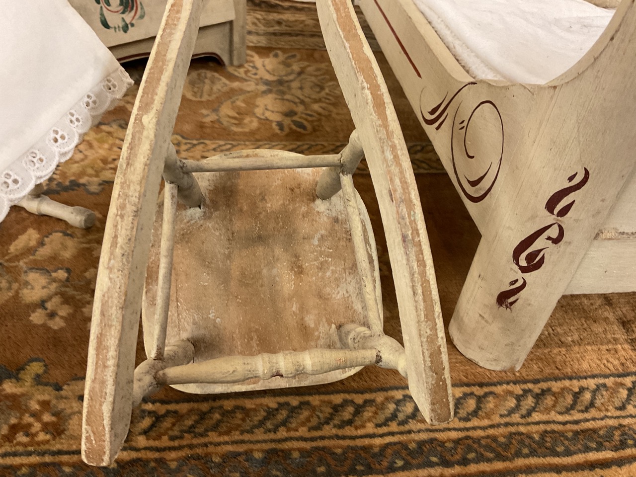 Hand painted bed, 2 drawer cest with mirror, washstand, table with 2 chairs, rocking chair and blanket rack. Rug and small accessories are included.